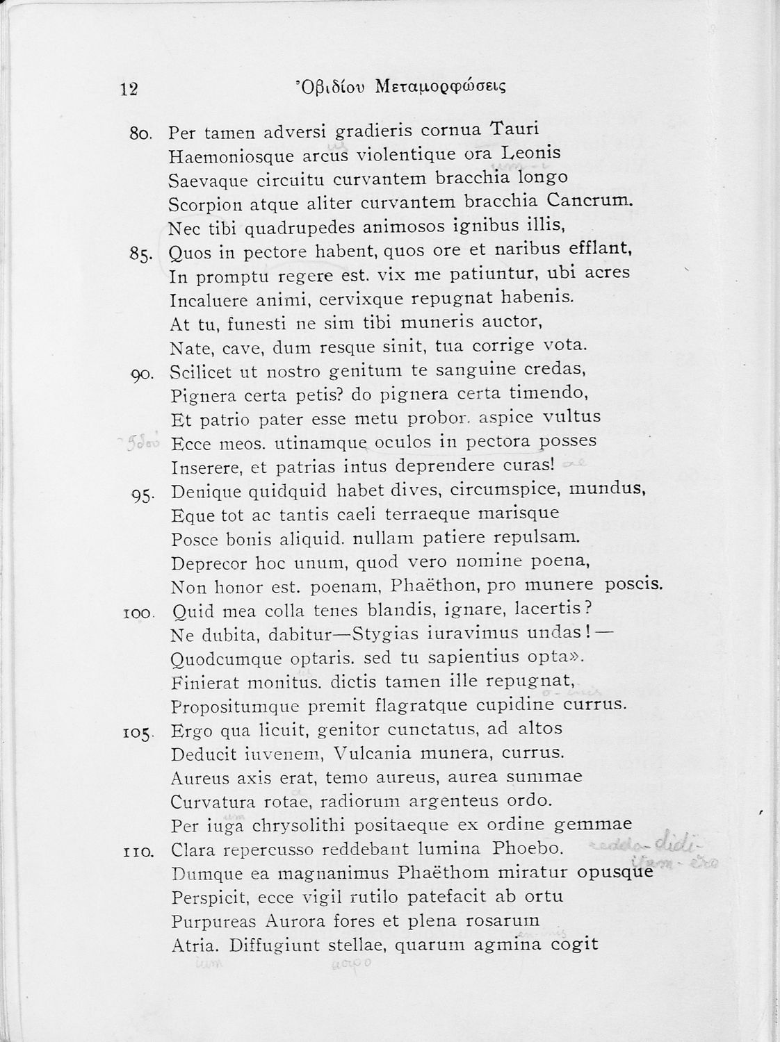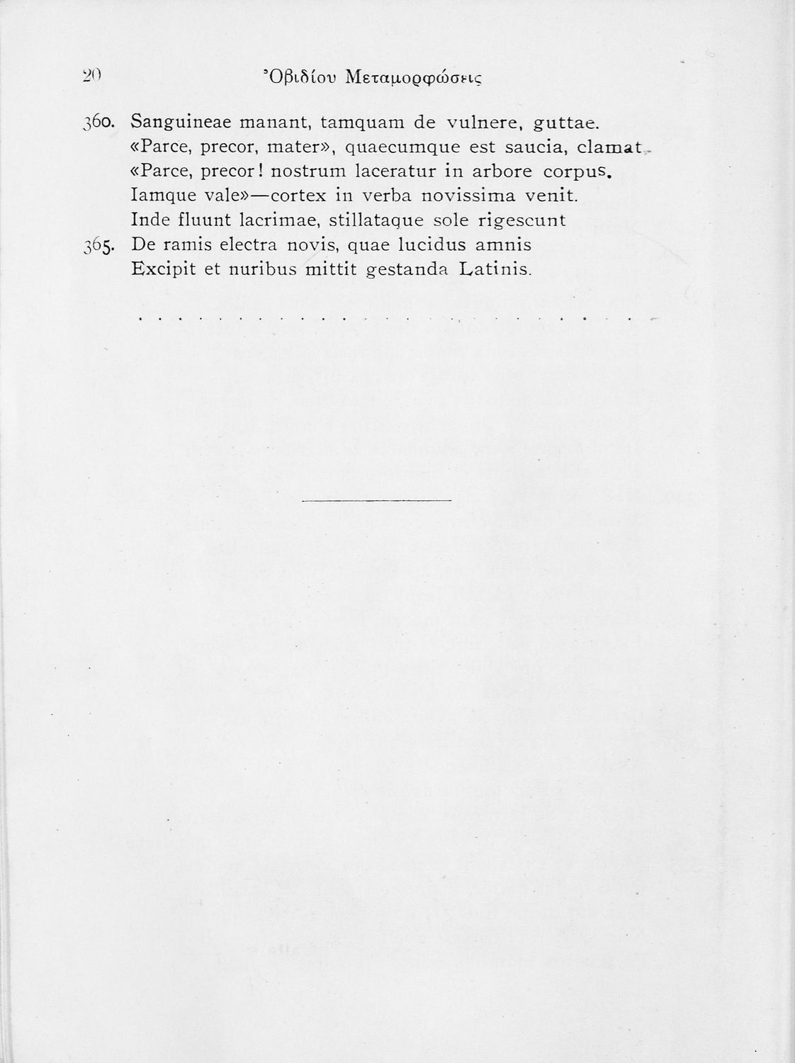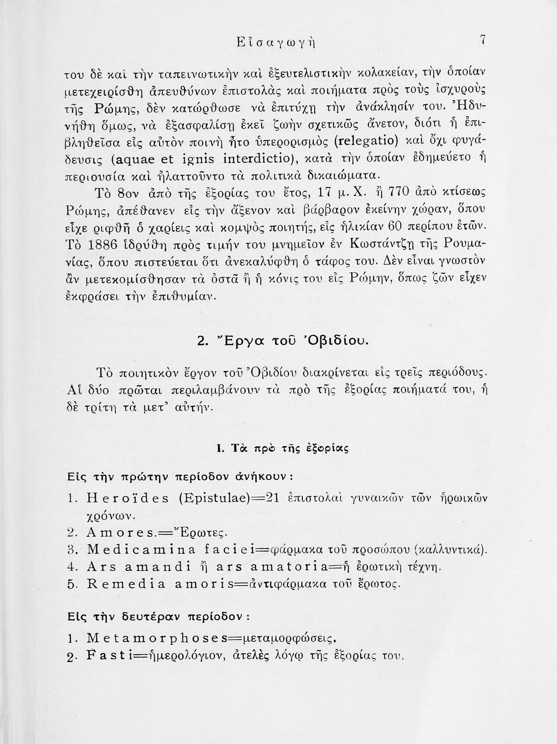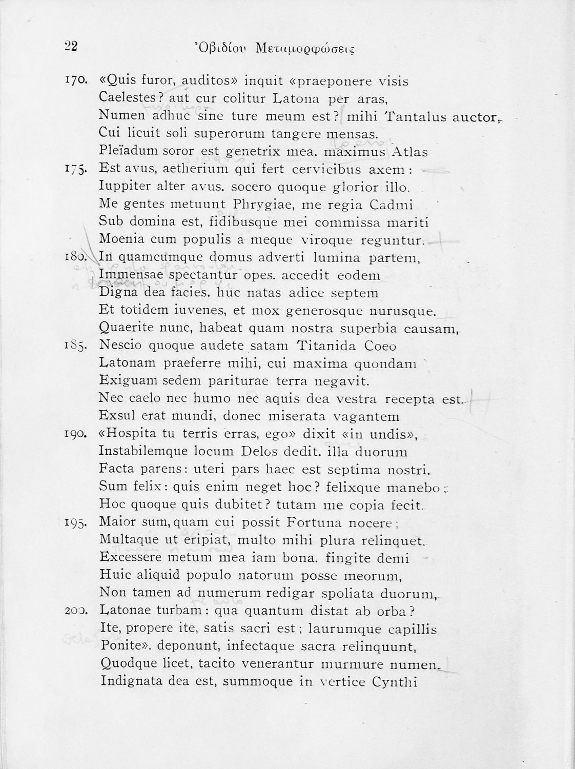 Σχολικό εγχειρίδιο Λατινικών για την Ε΄ Γυμνασίου παλαιού τύπου και την ΣΤ΄ Γυμνασίου νέου τύπου που περιέχει βιογραφικό σημείωμα του Οβίδιου, εισαγωγικά σχόλια, αποσπάσματα από τις Μεταμορφώσεις και ερμηνευτικές σημειώσεις.