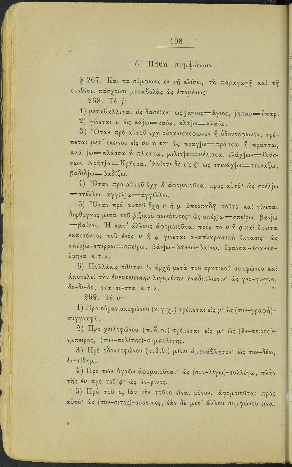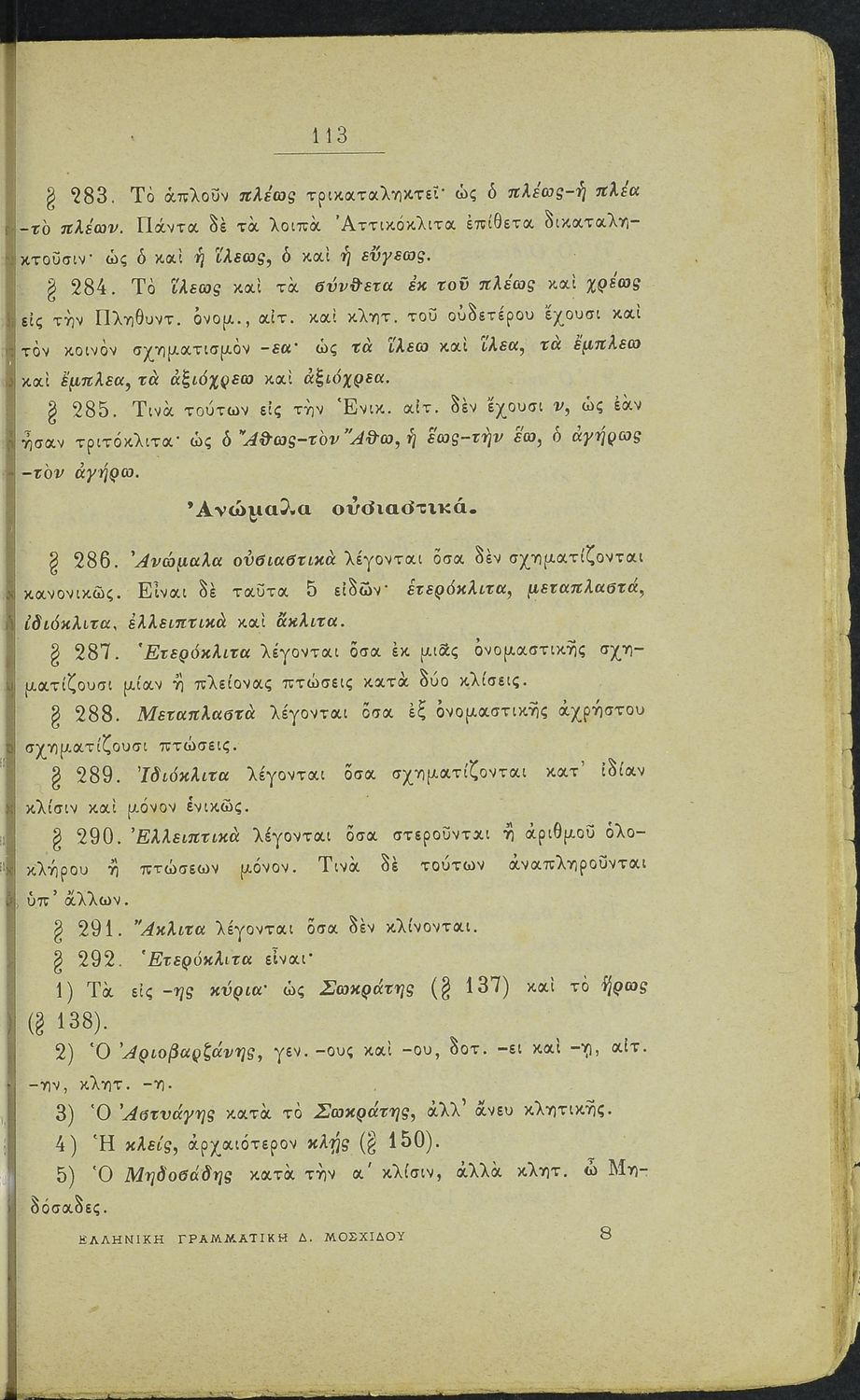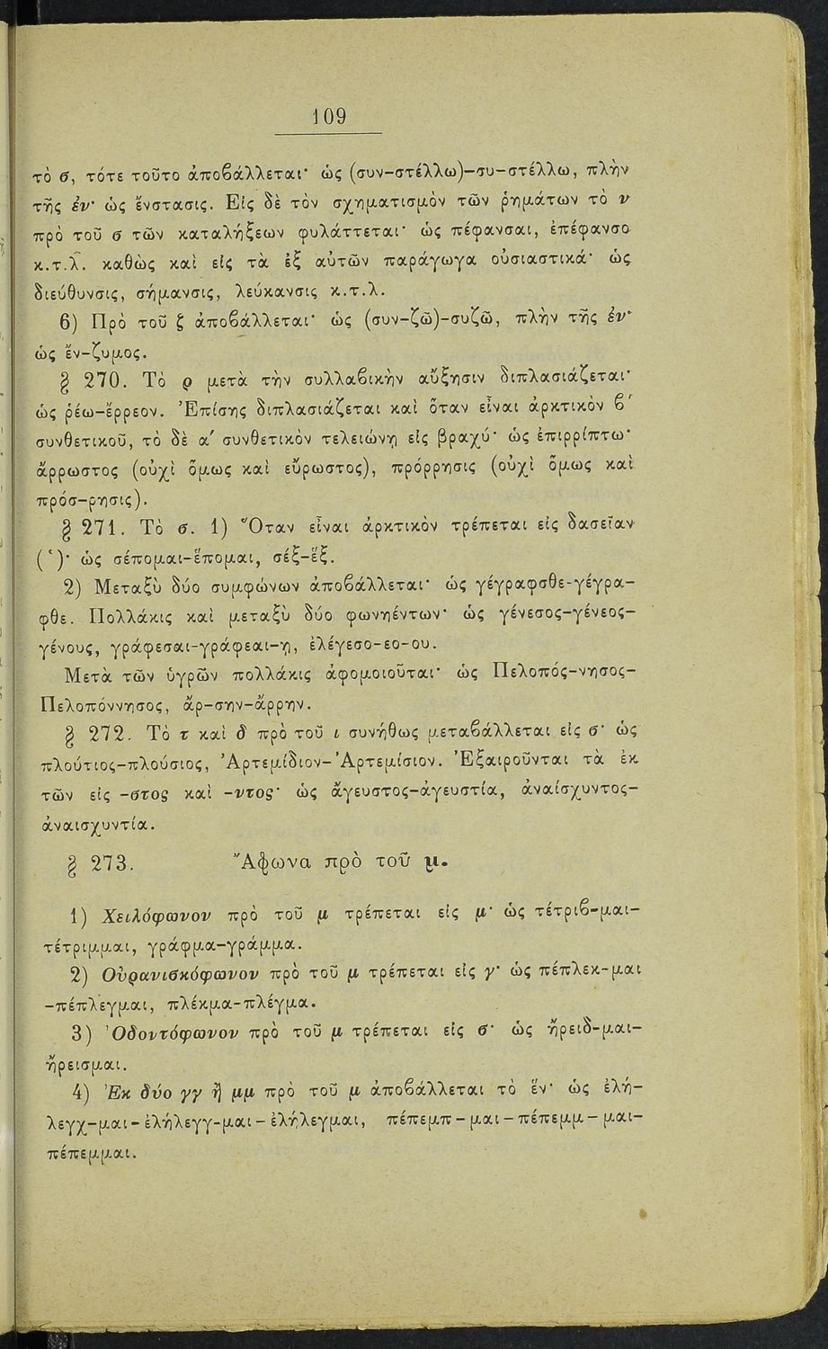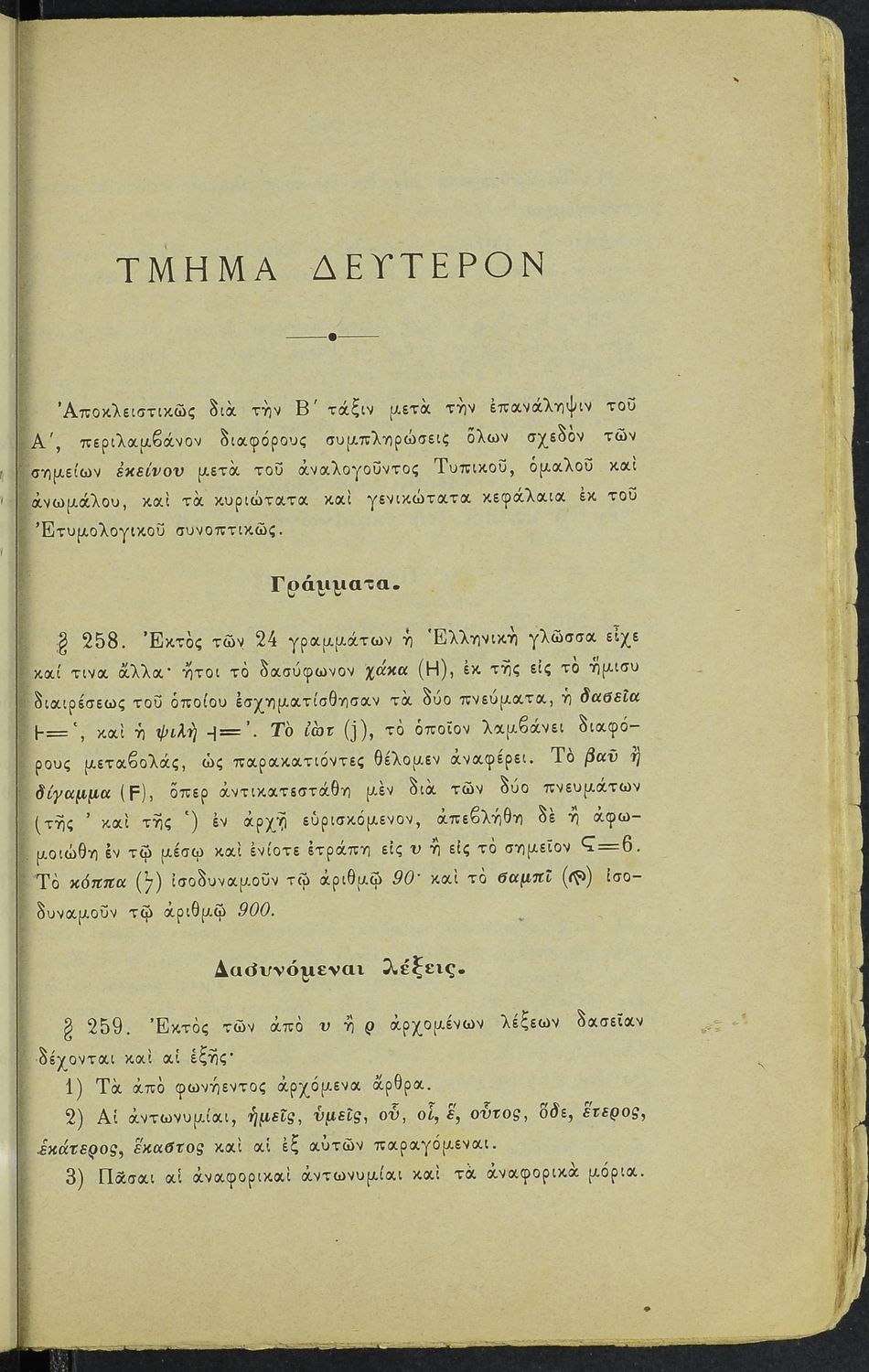 Σχολικό εγχειρίδιο Αρχαίων Ελληνικών για τα Ελληνικά Σχολεία και Παρθεναγωγεία που περιέχει τους κανόνες γραμματικής και είναι χωρισμένο σε φθογγολογικό, τυπολογικό και ετυμολογικό μέρος.