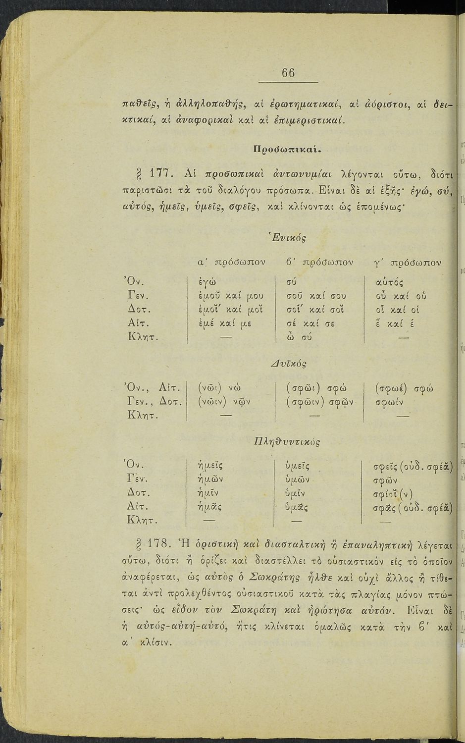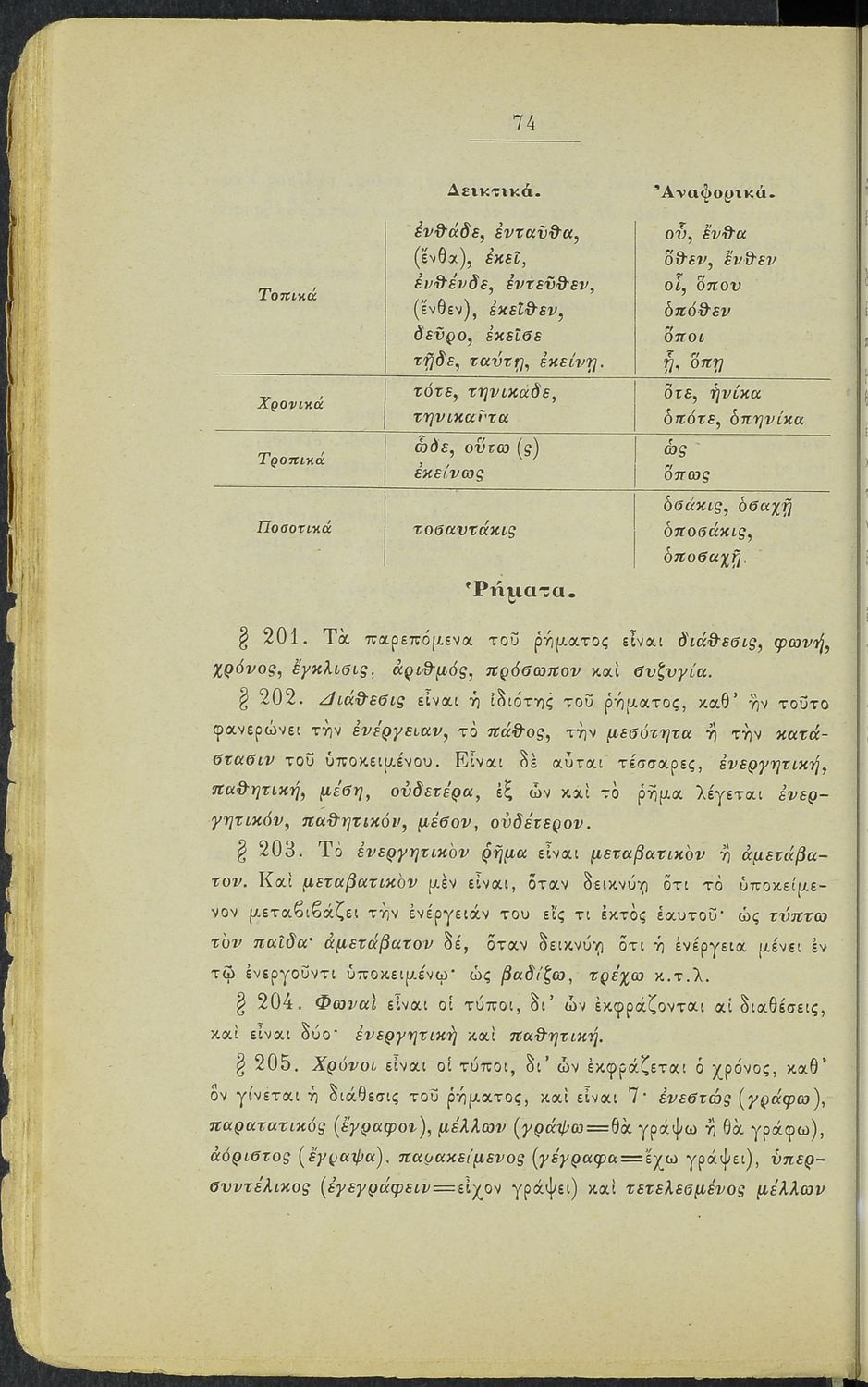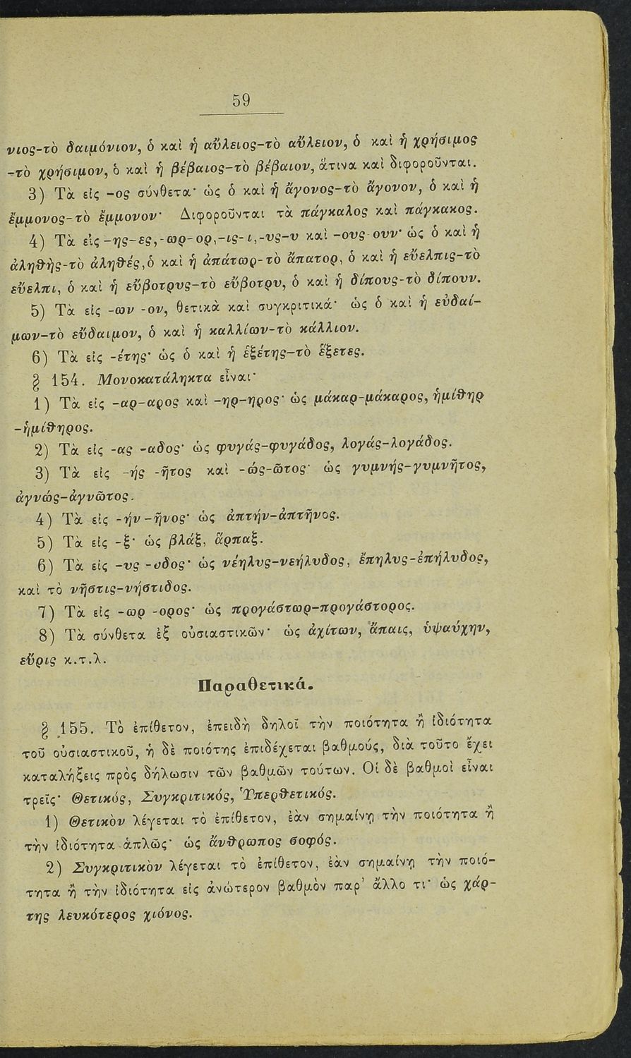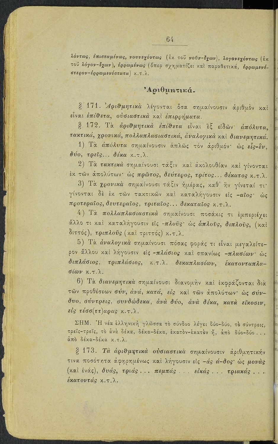 Σχολικό εγχειρίδιο Αρχαίων Ελληνικών για τα Ελληνικά Σχολεία, Παρθεναγωγεία και Γυμνάσια που περιέχει τους κανόνες γραμματικής και είναι χωρισμένο σε φθογγολογικό, τυπολογικό και ετυμολογικό μέρος.