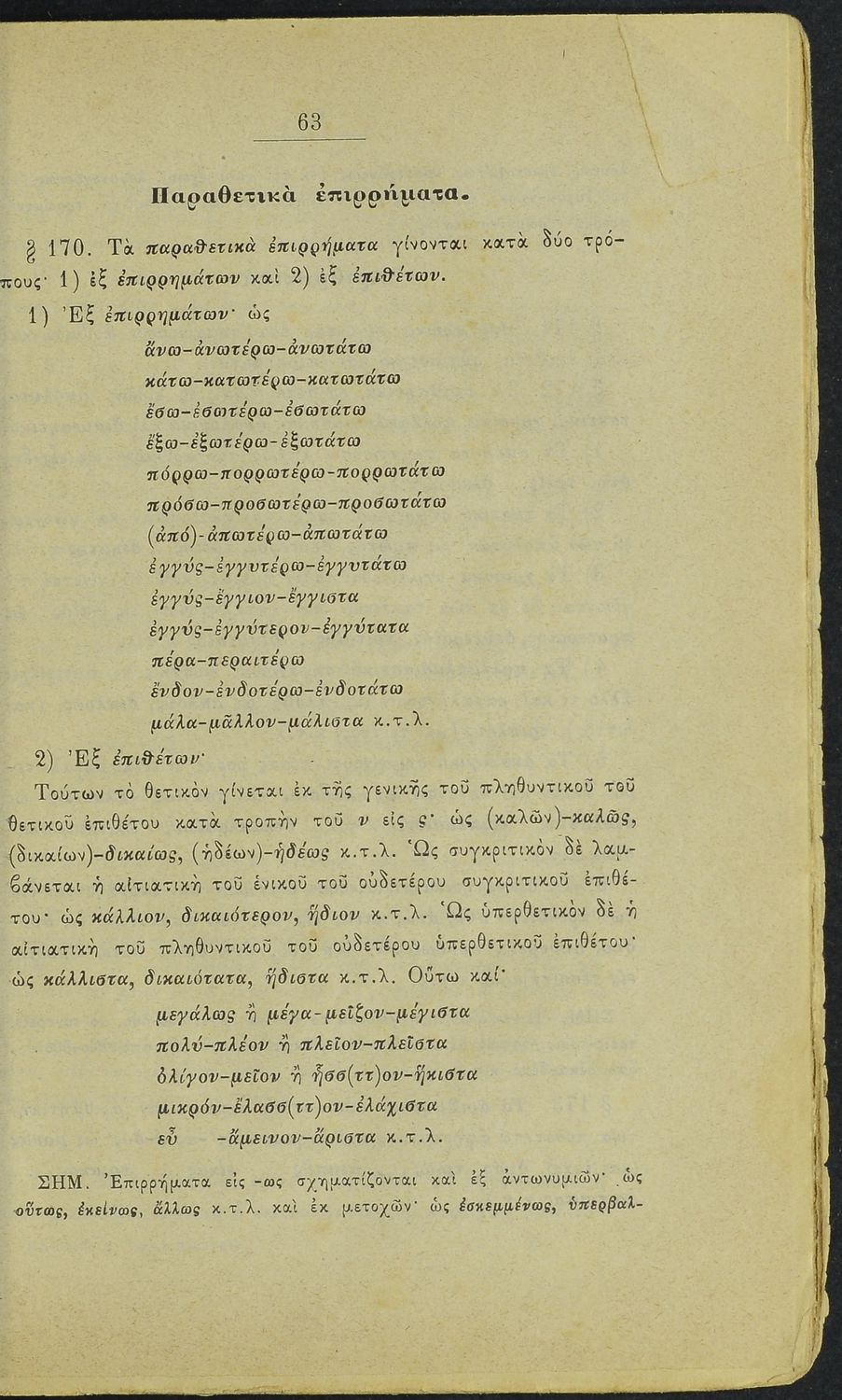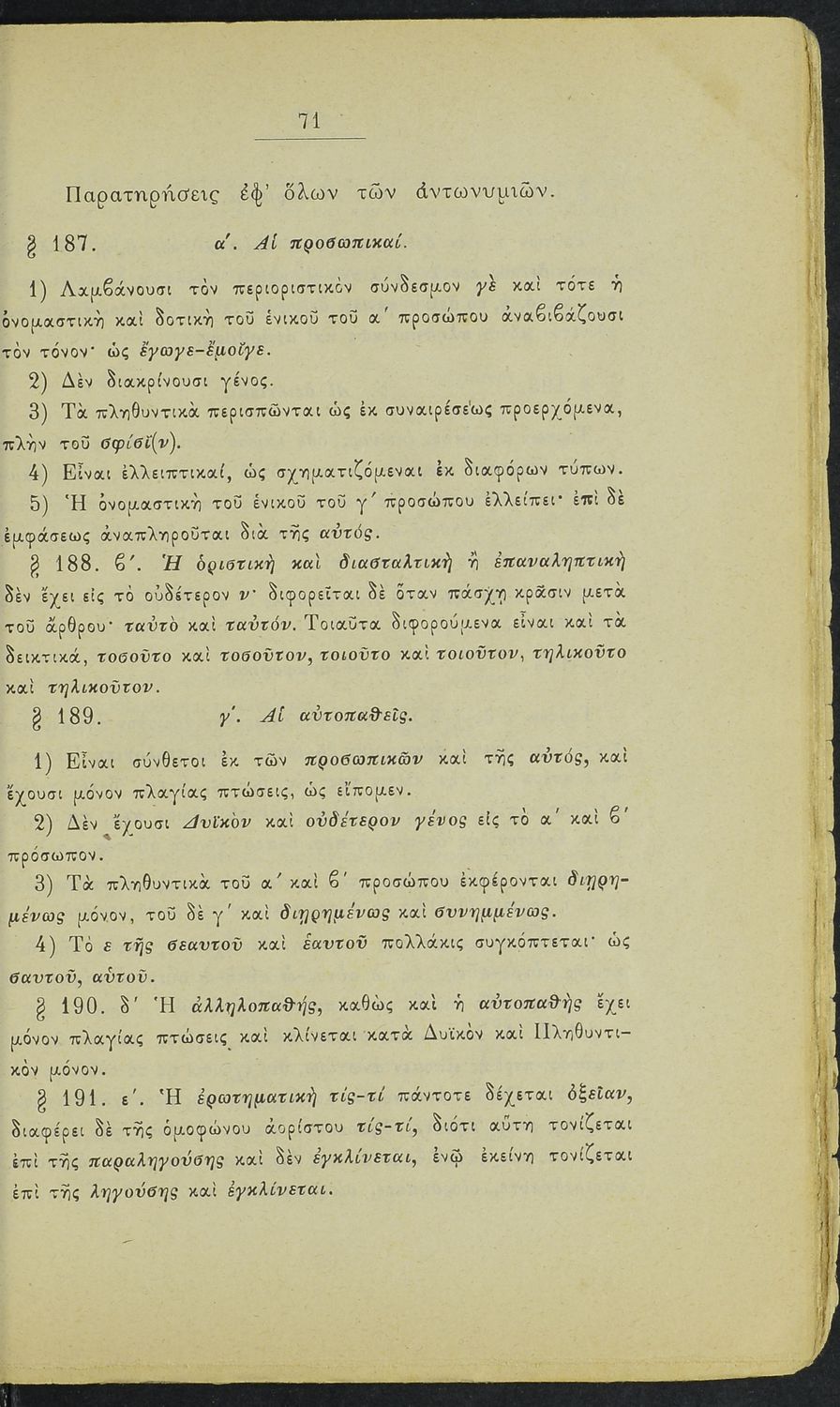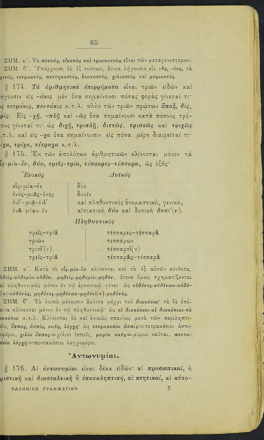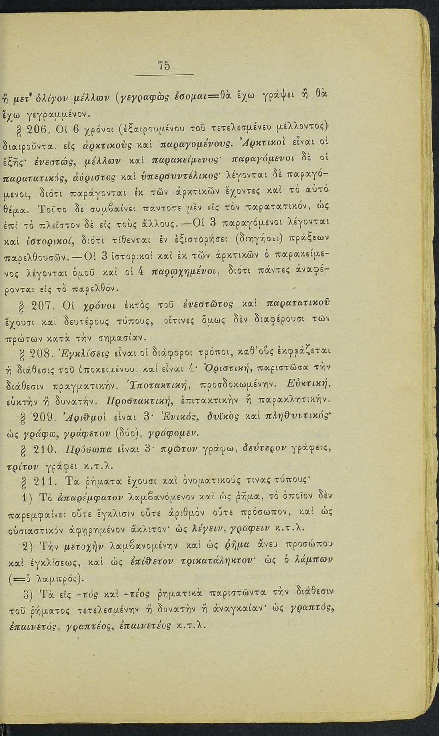 Σχολικό εγχειρίδιο Αρχαίων Ελληνικών για τα Ελληνικά Σχολεία και Παρθεναγωγεία που περιέχει τους κανόνες γραμματικής και είναι χωρισμένο σε φθογγολογικό, τυπολογικό και ετυμολογικό μέρος.