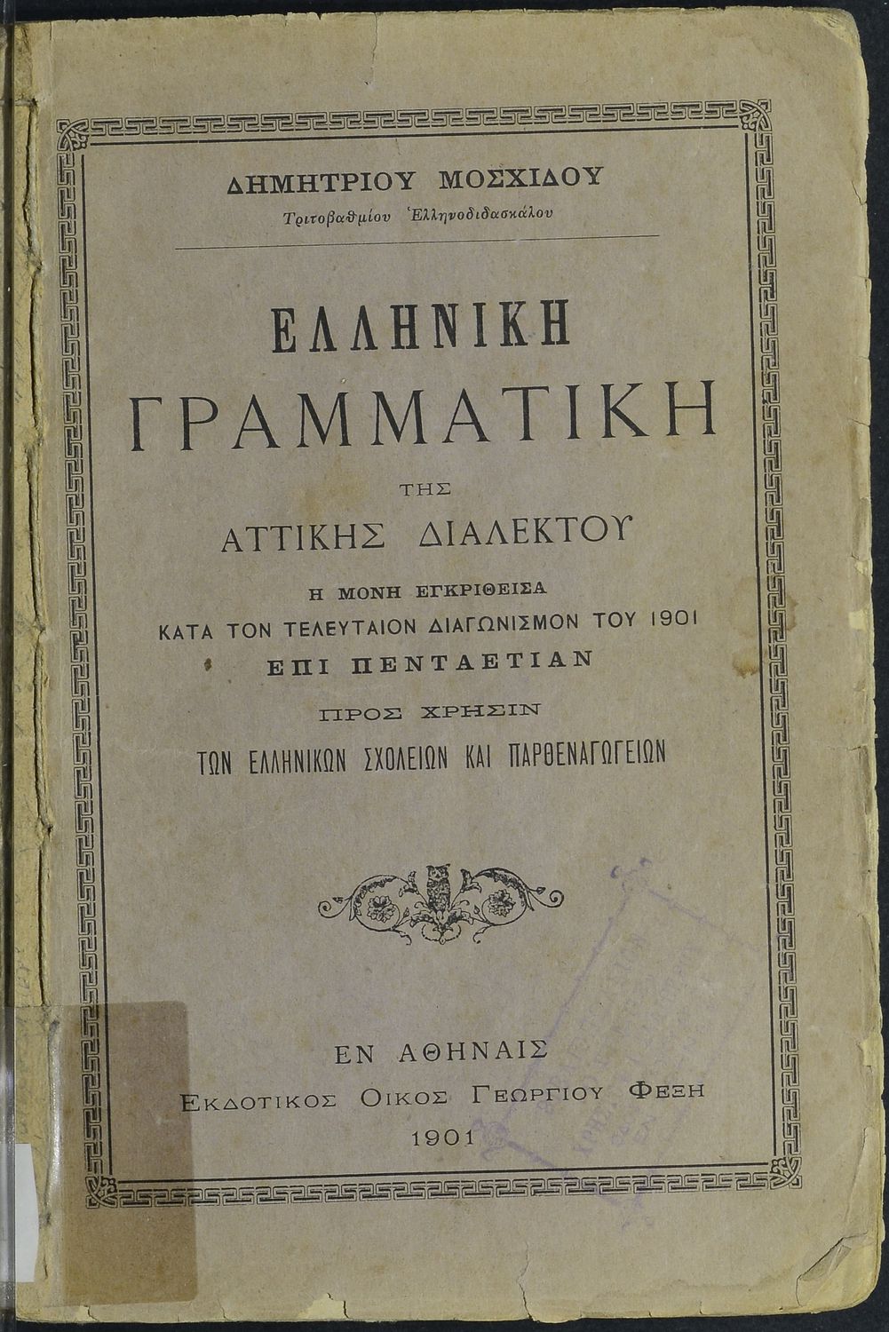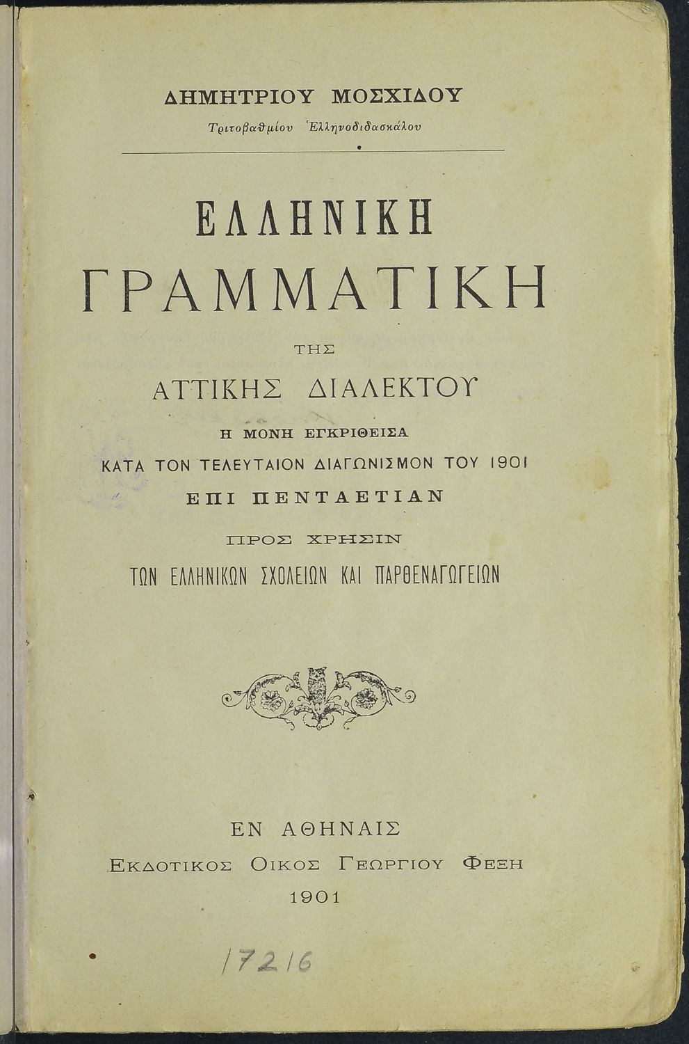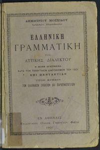 Ελληνική Γραμματική της Αττικής Διαλέκτου η μόνη εγκριθείσα κατά τον τελευταίον διαγωνισμόν του 1901 επί πενταετίαν. Προς χρήσιν των Ελληνικών Σχολείων και Παρθεναγωγείων.