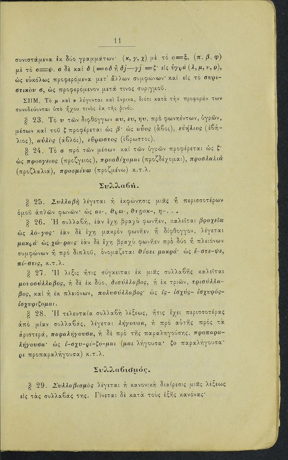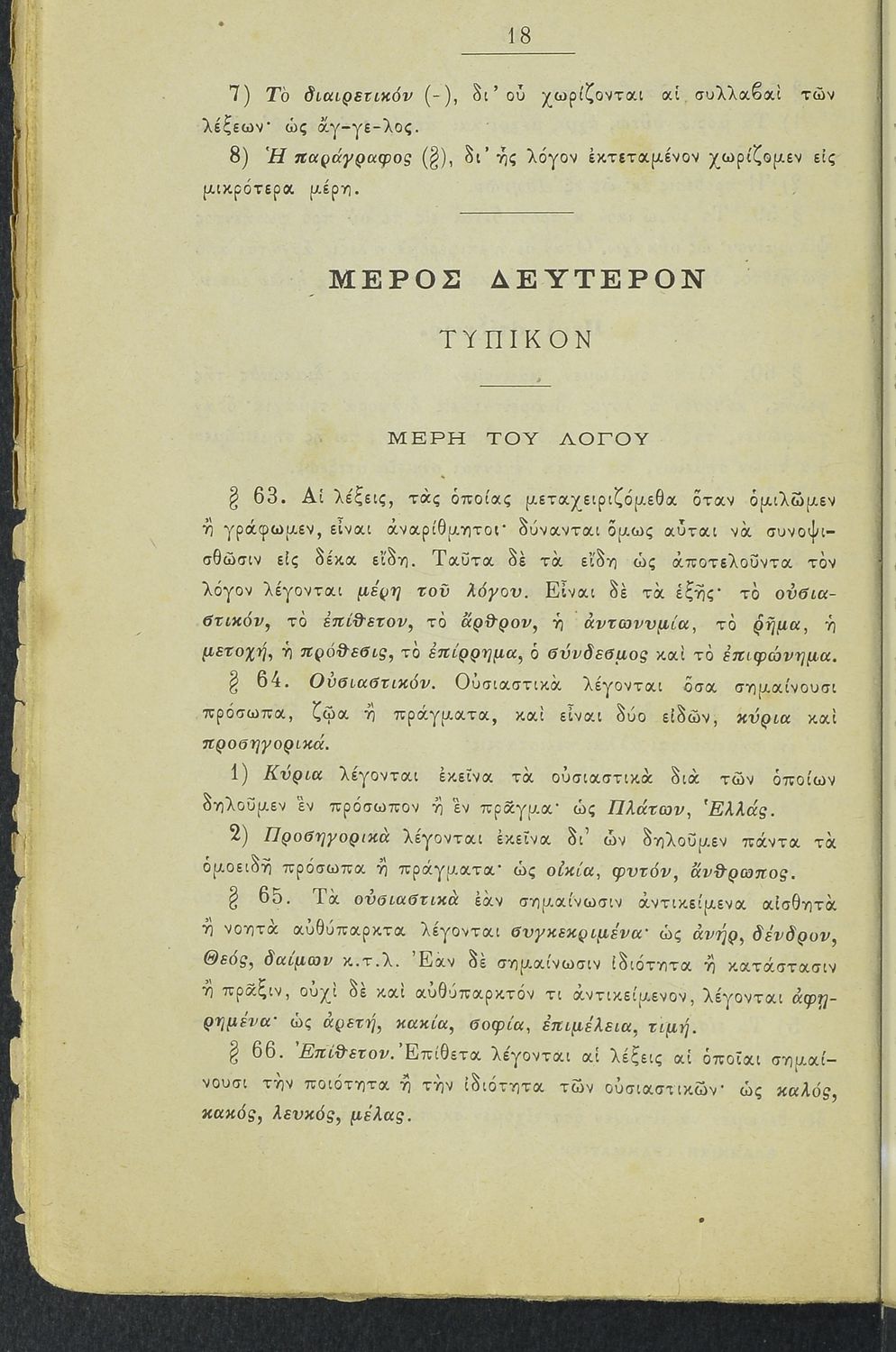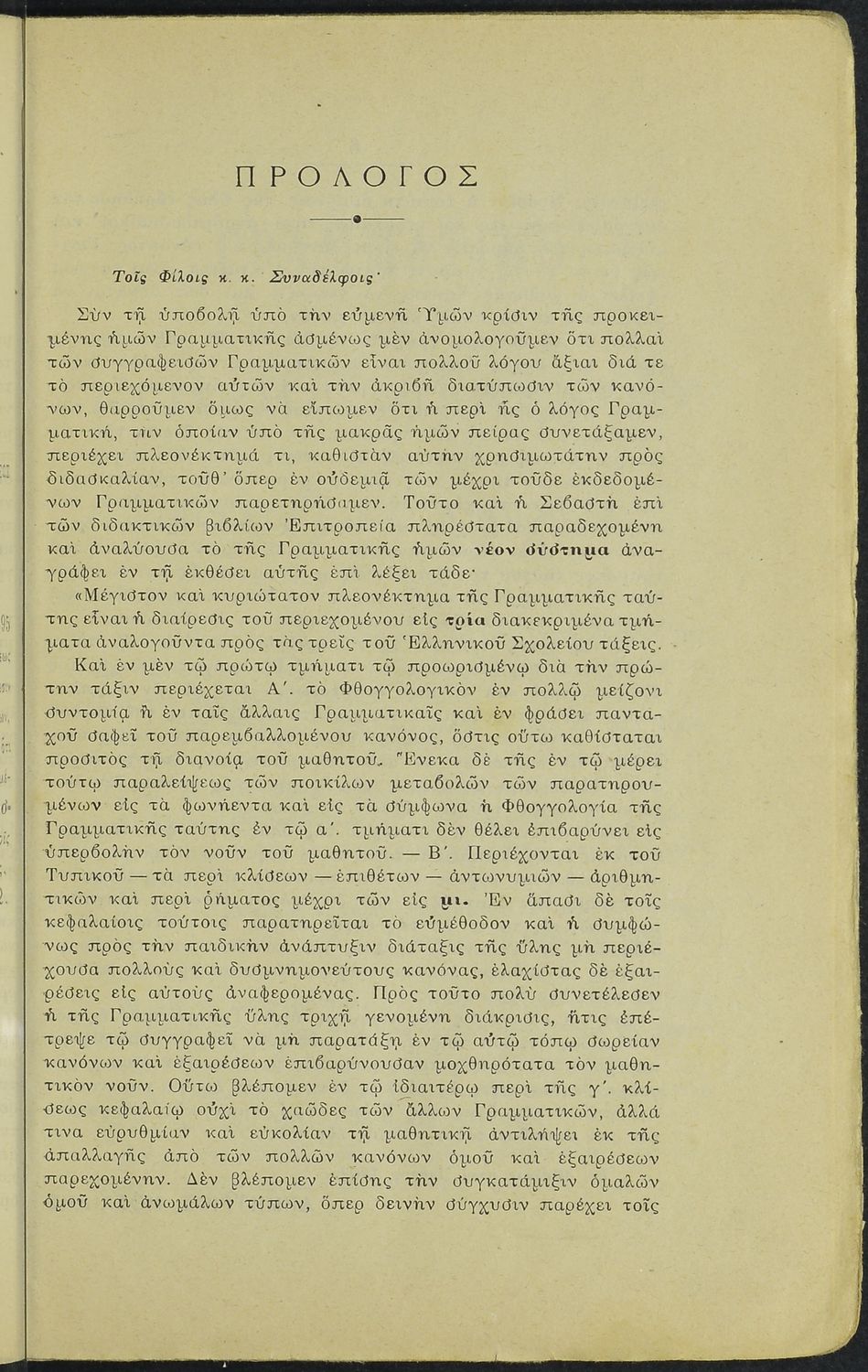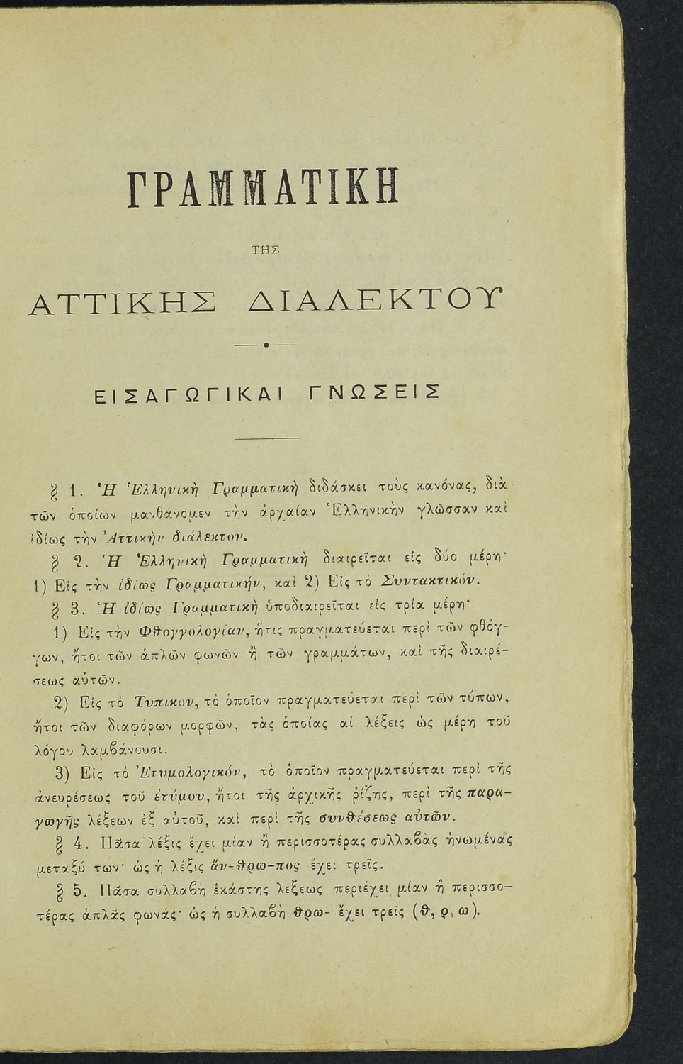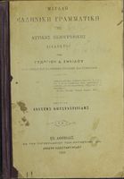 Σχολικό εγχειρίδιο Αρχαίων Ελληνικών για τα Ελληνικά Σχολεία και Παρθεναγωγεία που περιέχει τους κανόνες γραμματικής και είναι χωρισμένο σε φθογγολογικό, τυπολογικό και ετυμολογικό μέρος.