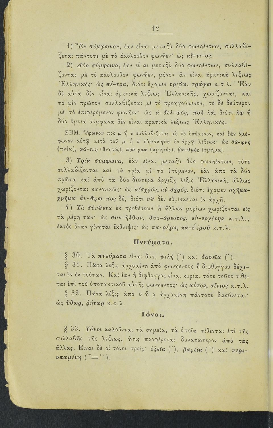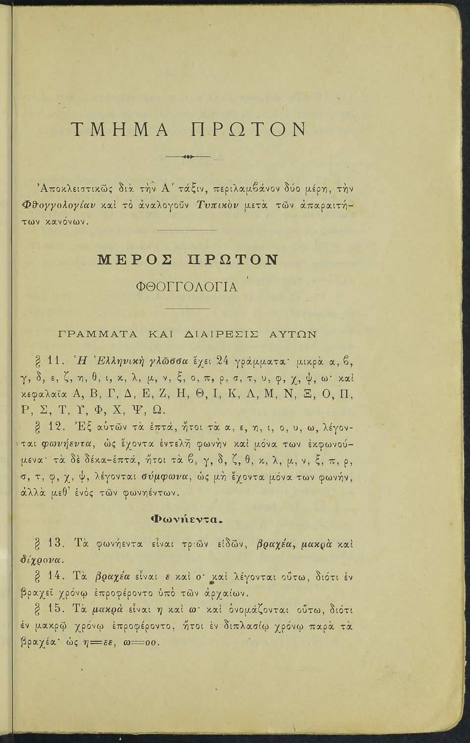 Σχολικό εγχειρίδιο Αρχαίων Ελληνικών για τα Ελληνικά Σχολεία, Παρθεναγωγεία και Γυμνάσια που περιέχει τους κανόνες γραμματικής και είναι χωρισμένο σε φθογγολογικό, τυπολογικό και ετυμολογικό μέρος.