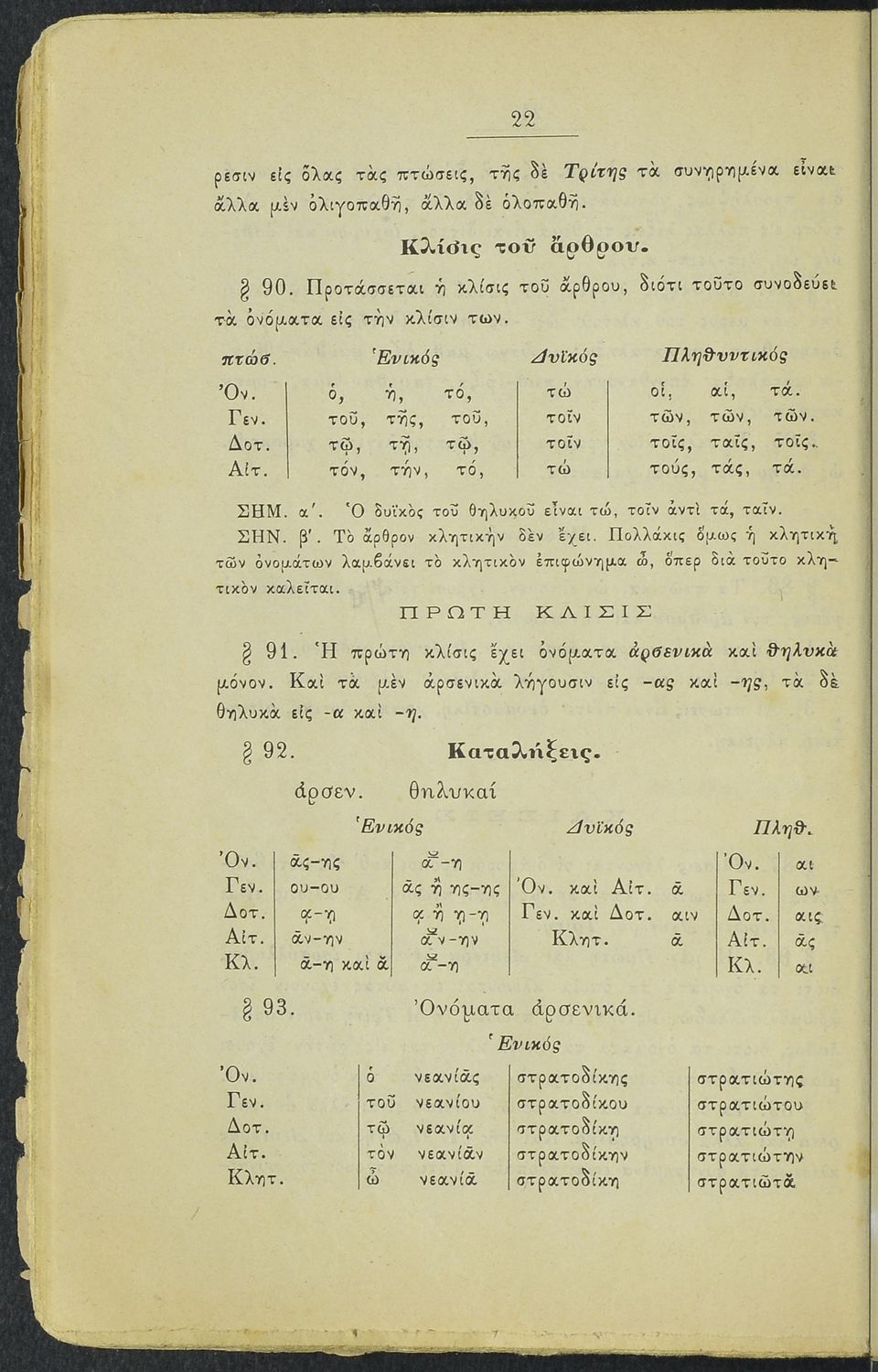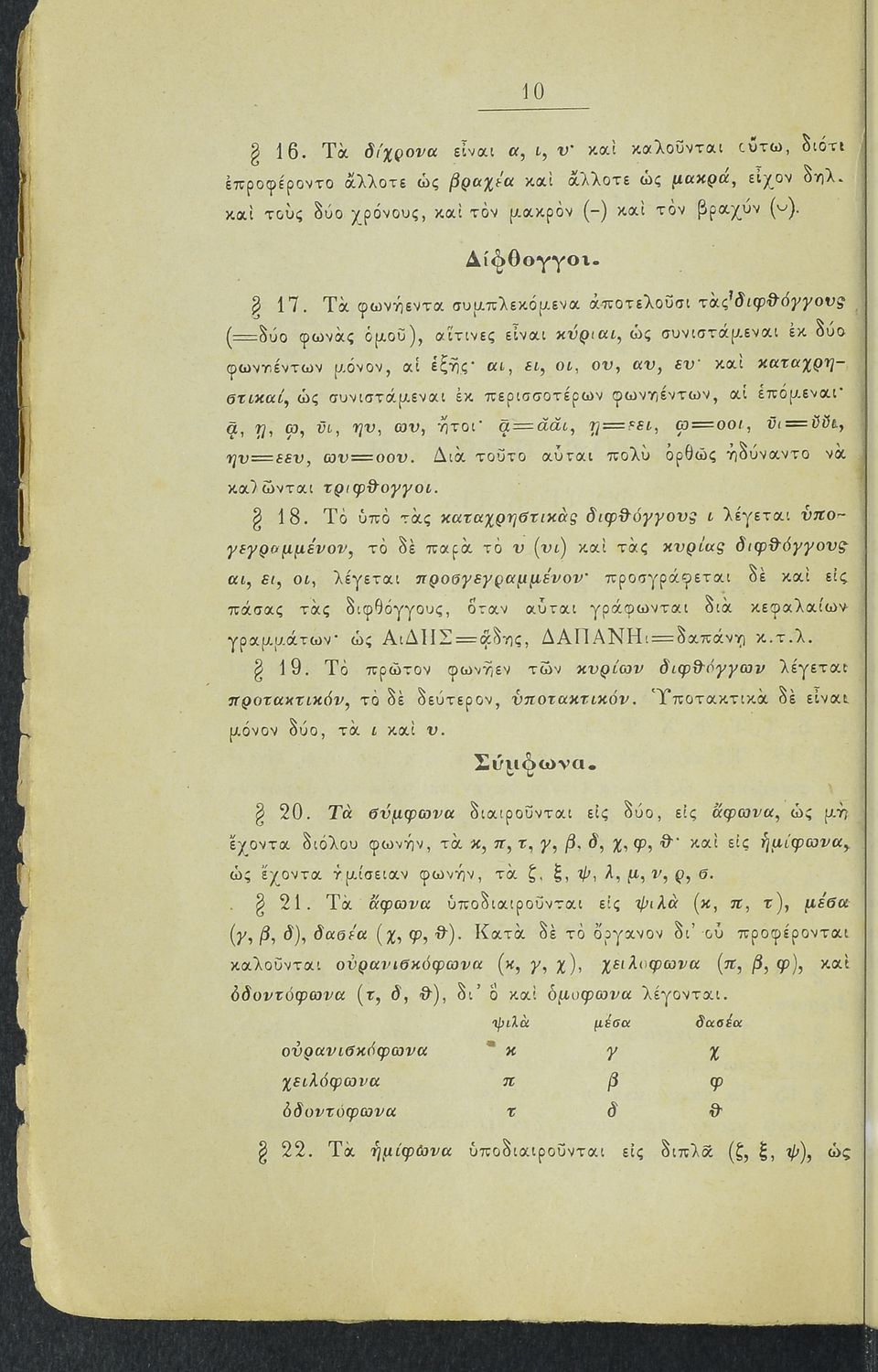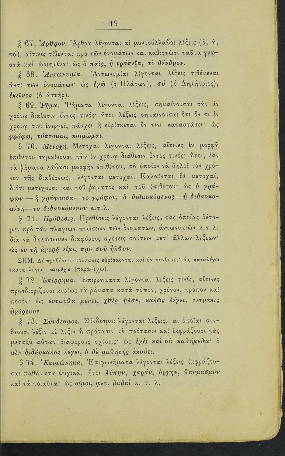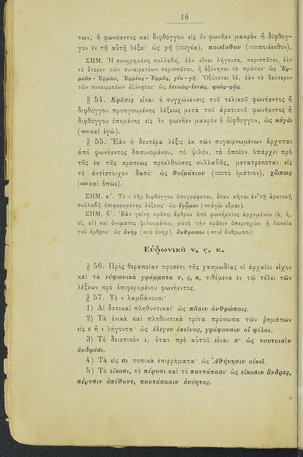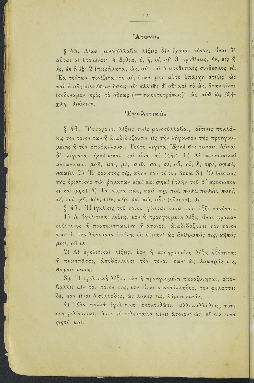 Σχολικό εγχειρίδιο Αρχαίων Ελληνικών για τα Ελληνικά Σχολεία και Παρθεναγωγεία που περιλαμβάνει κανόνες της γραμματικής της αρχαίας ελληνικής και είναι χωρισμένη στο φθογγολογικό και στο τυπολογικό μέρος.