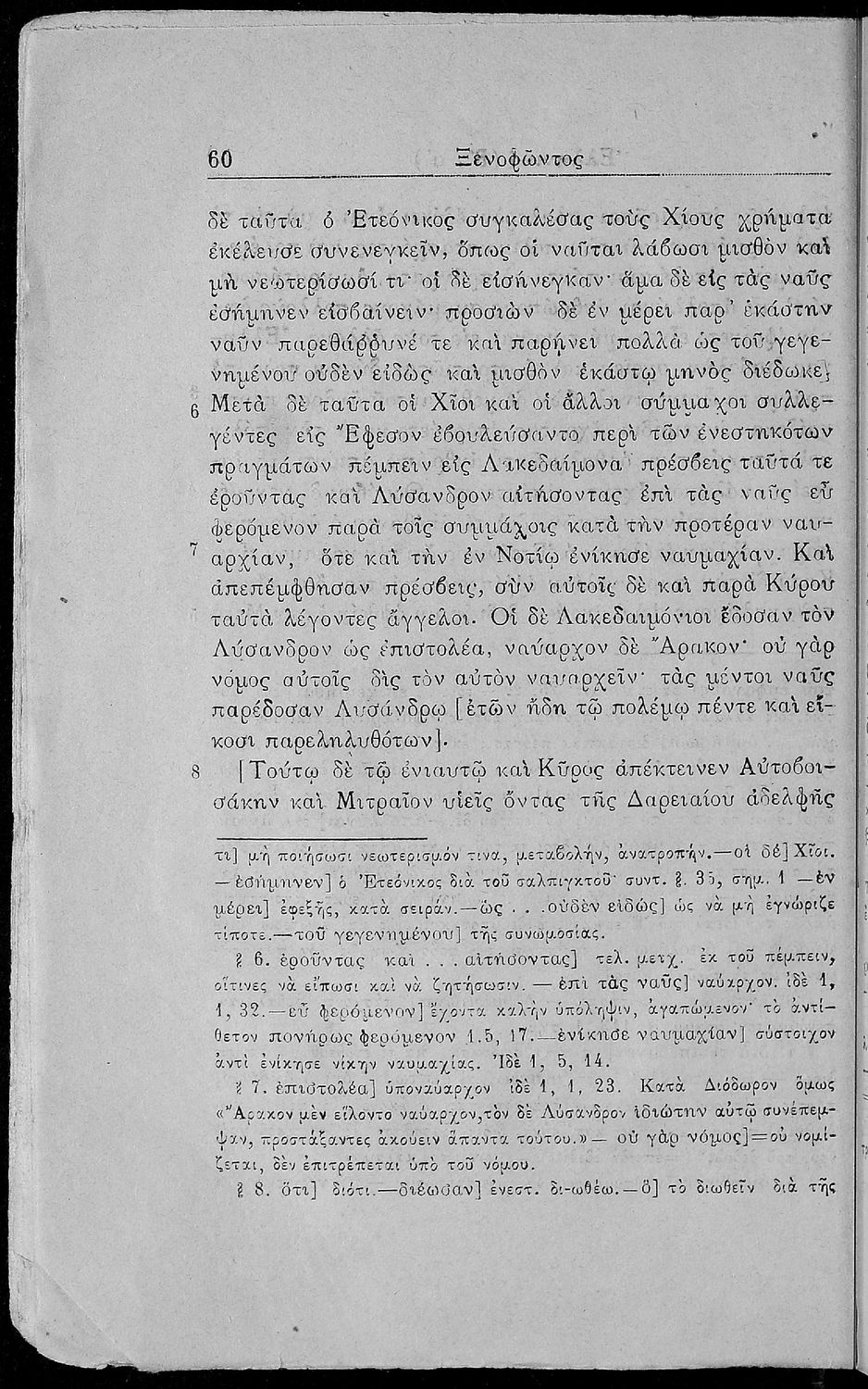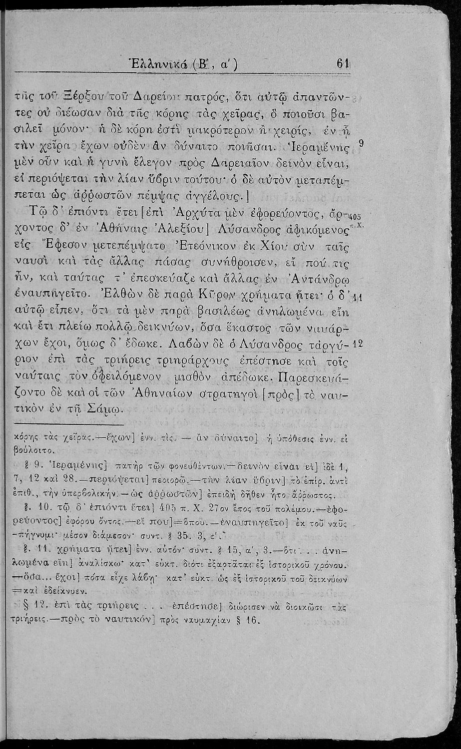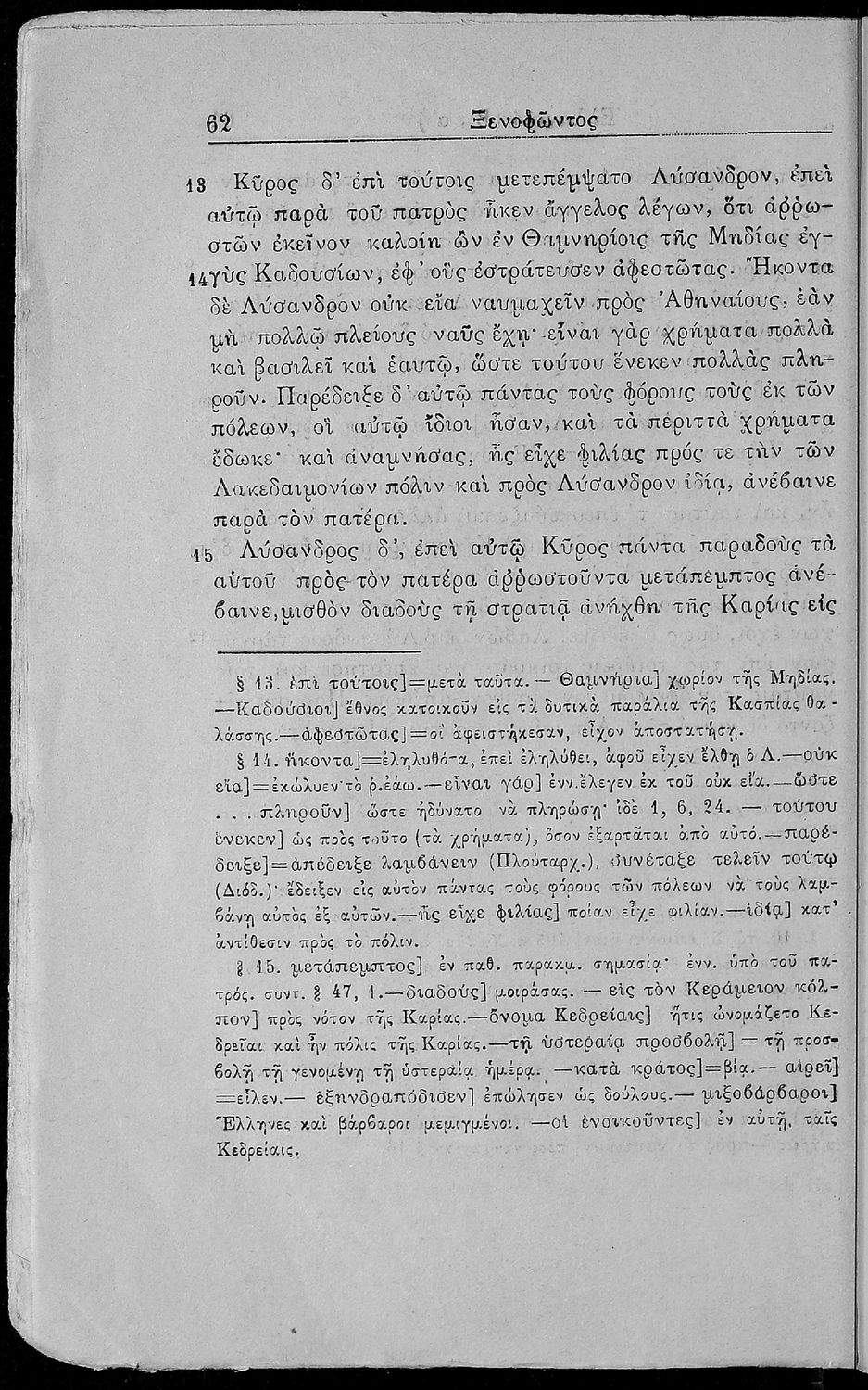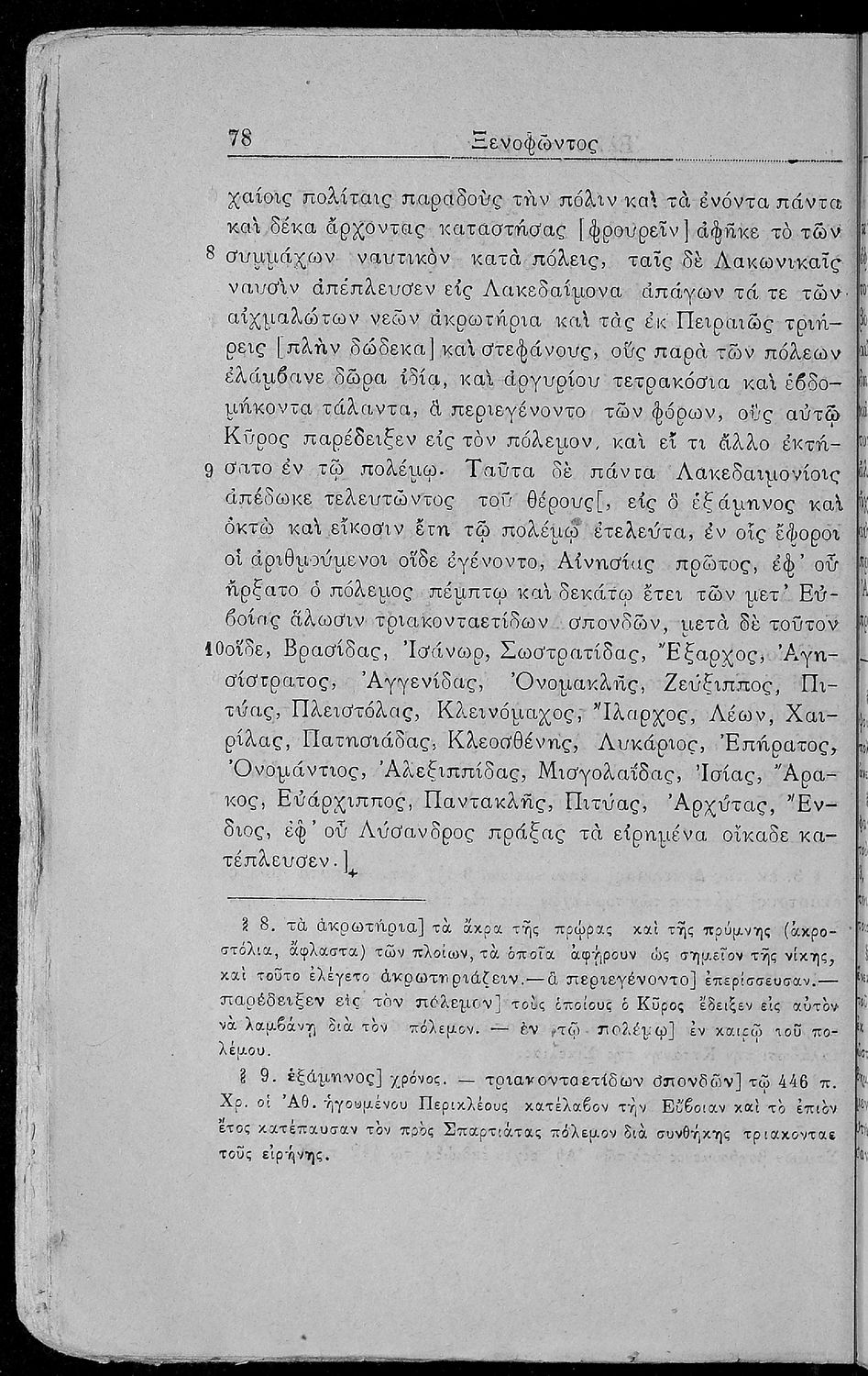 Σχολικό εγχειρίδιο Αρχαίων Ελληνικών για τα Ελληνικά Σχολεία και Παρθεναγωγεία που περιλαμβάνει αποσπάσματα από τα έργα του Ξενοφώντα Ελληνικά και Κύρου Παιδεία και λεξικολογικές παρατηρήσεις.