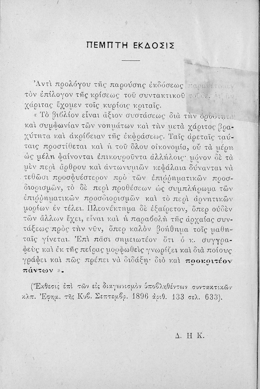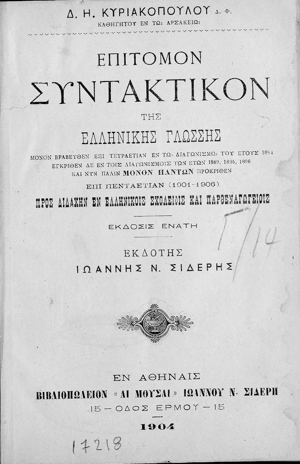 Τίτλος: Επίτομον συντακτικόν της ελληνικής γλώσσης προς διδαχήν εν Ελληνικοίς Σχολείοις και Παρθεναγωγείοις