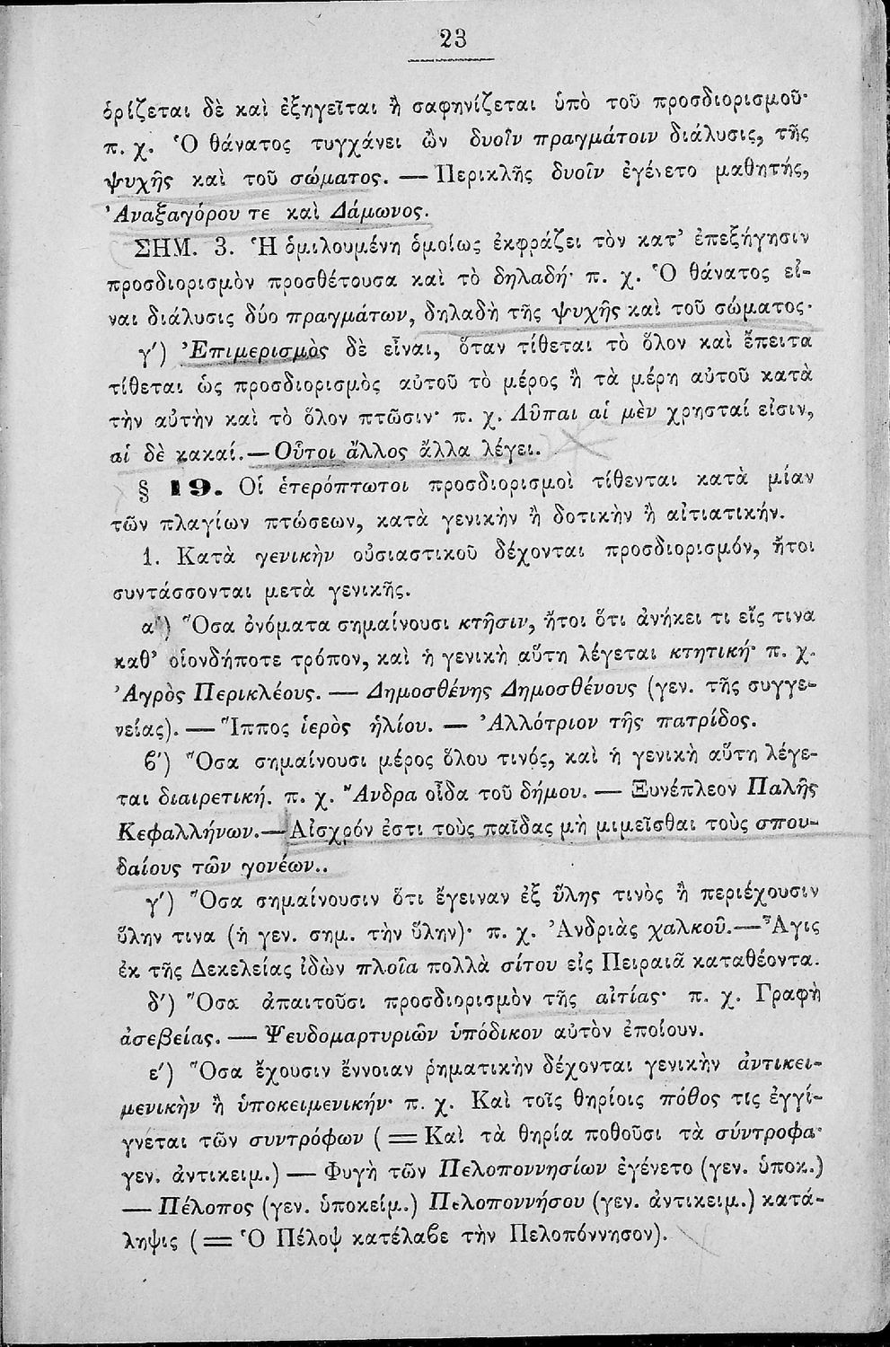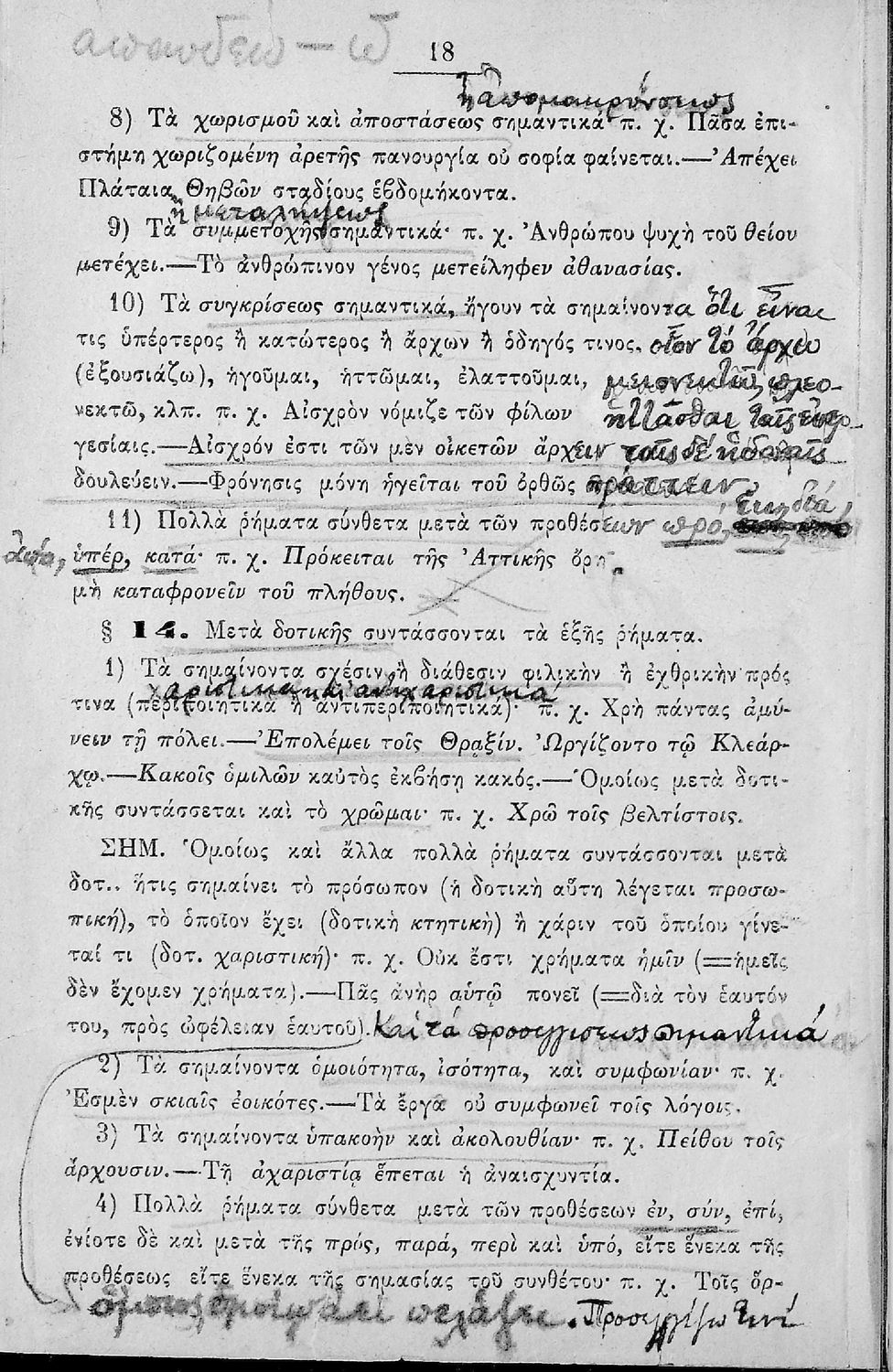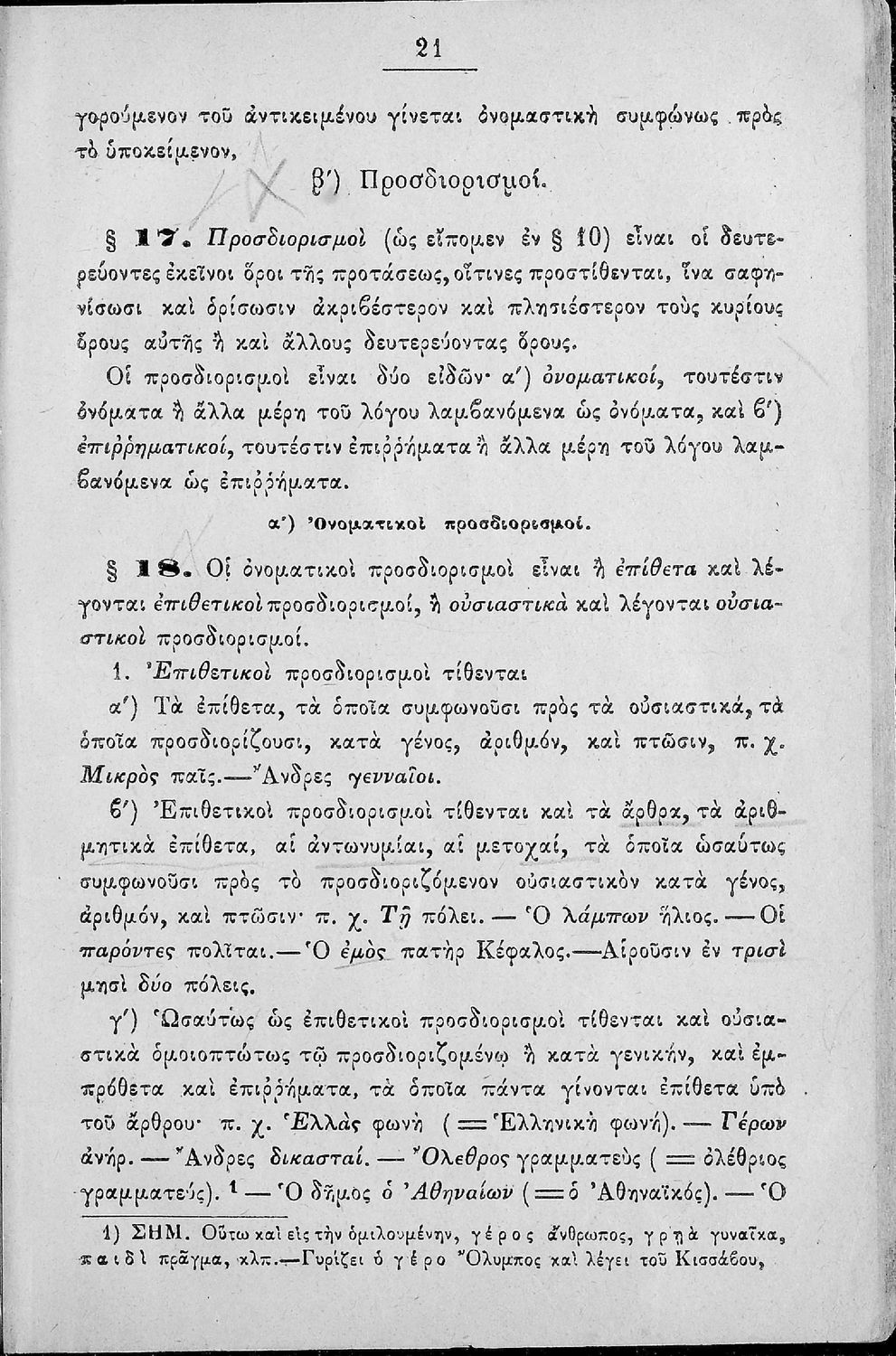 Σχολικό εγχειρίδιο Αρχαίων Ελληνικών για τα Ελληνικά Σχολεία και Παρθεναγωγεία που εστιάζει στα μέρη του λόγου και στην σύνταξή τους.