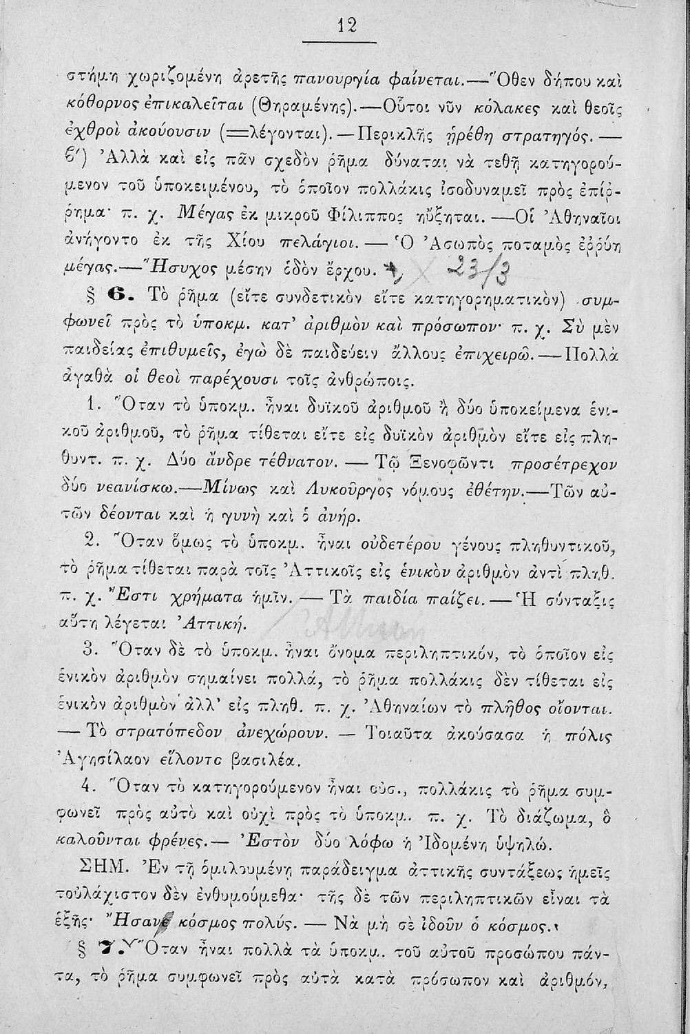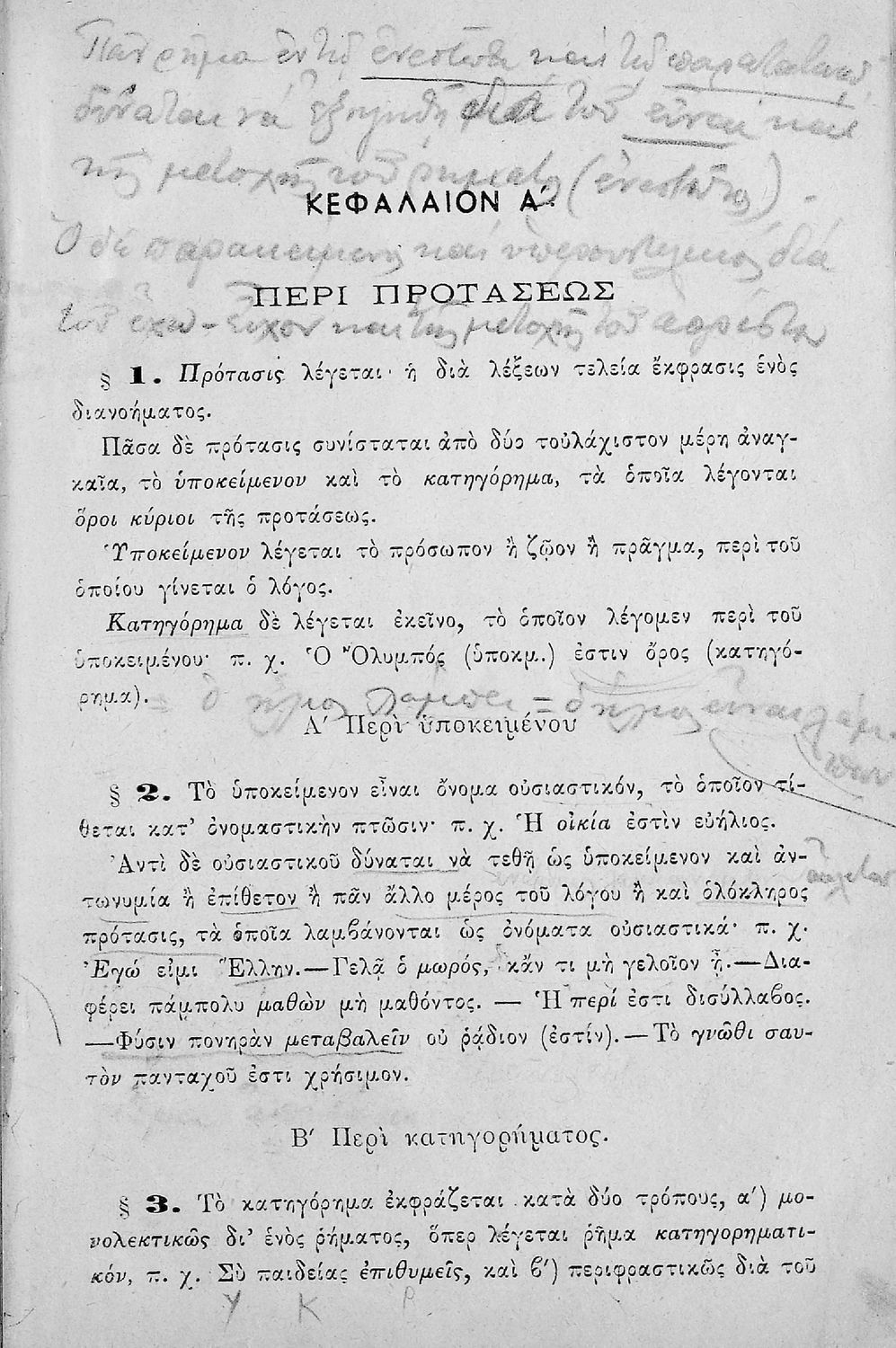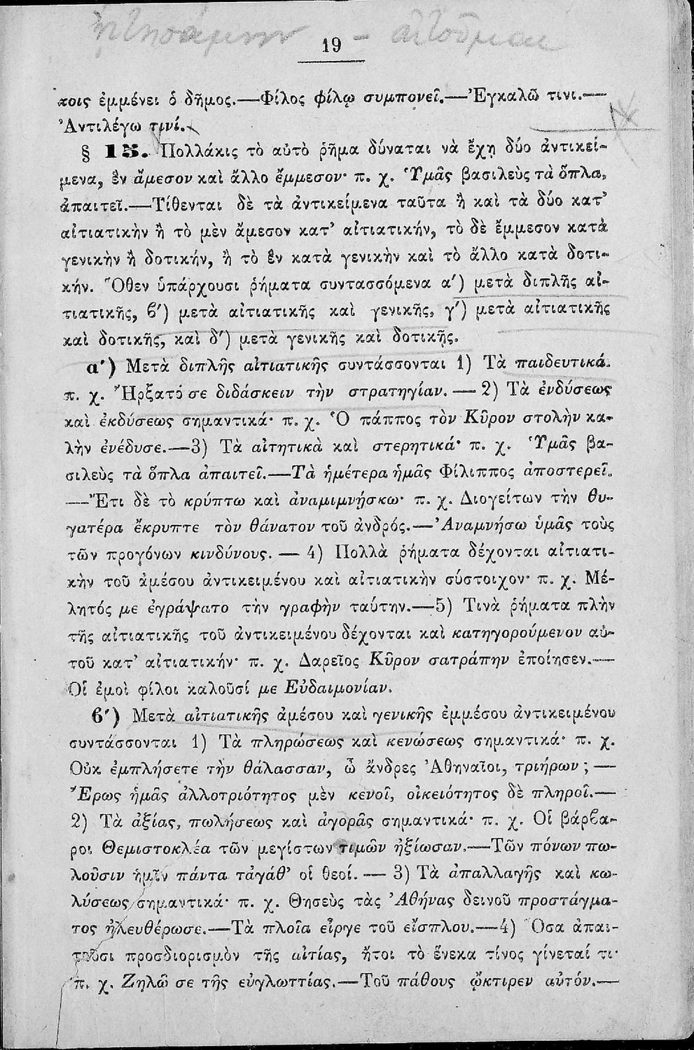 Σχολικό εγχειρίδιο Αρχαίων Ελληνικών για τους μαθητές των Ελληνικών Σχολείων και Παρθεναγωγείων που εξετάζει τα μέρη του λόγου και την σύνταξή τους.