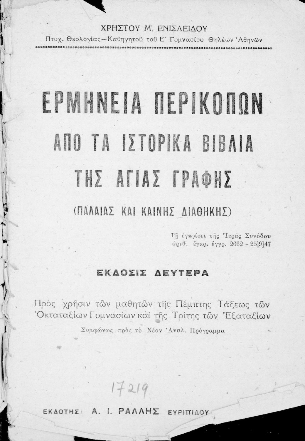 Κωδικός αναγνώρισης: 01-17219 Τίτλος: Ερμηνεία Περικοπών από τα ιστορικά βιβλία της Αγίας Γραφής (Παλαιάς και Καινής) προς χρήσιν των μαθητών της πέμπτης τάξεως των Οκταταξίων Γυμνασίων και της τρίτης των Εξαταξίων Συγγραφέας: Χρήστος Μ. Ενισλείδης Μέγεθος και υπόστρωμα: Σχολικό εγχειρίδιο, 20εκ., μαλακό εξώφυλλο, 110 σελίδες. |