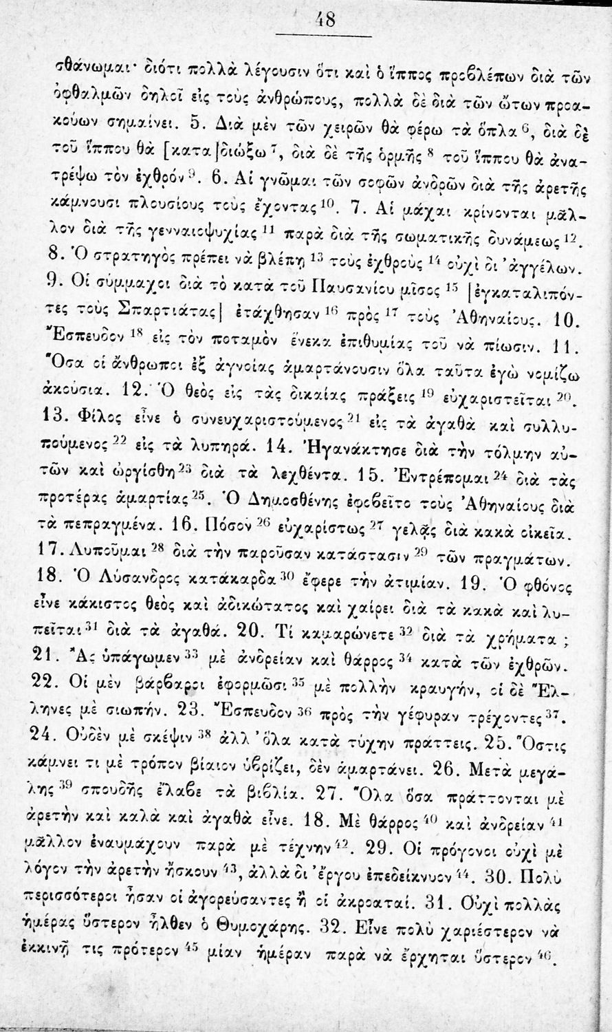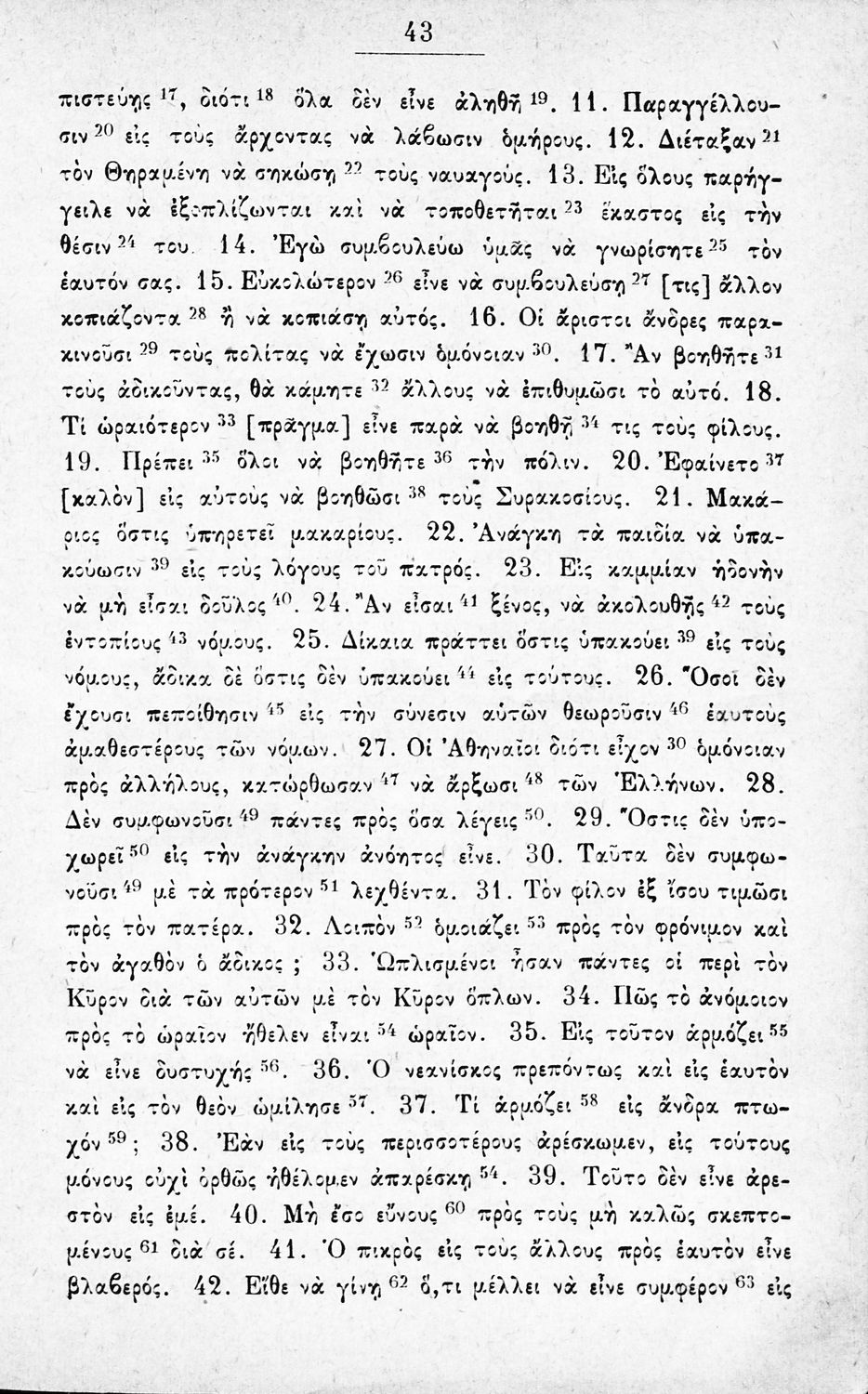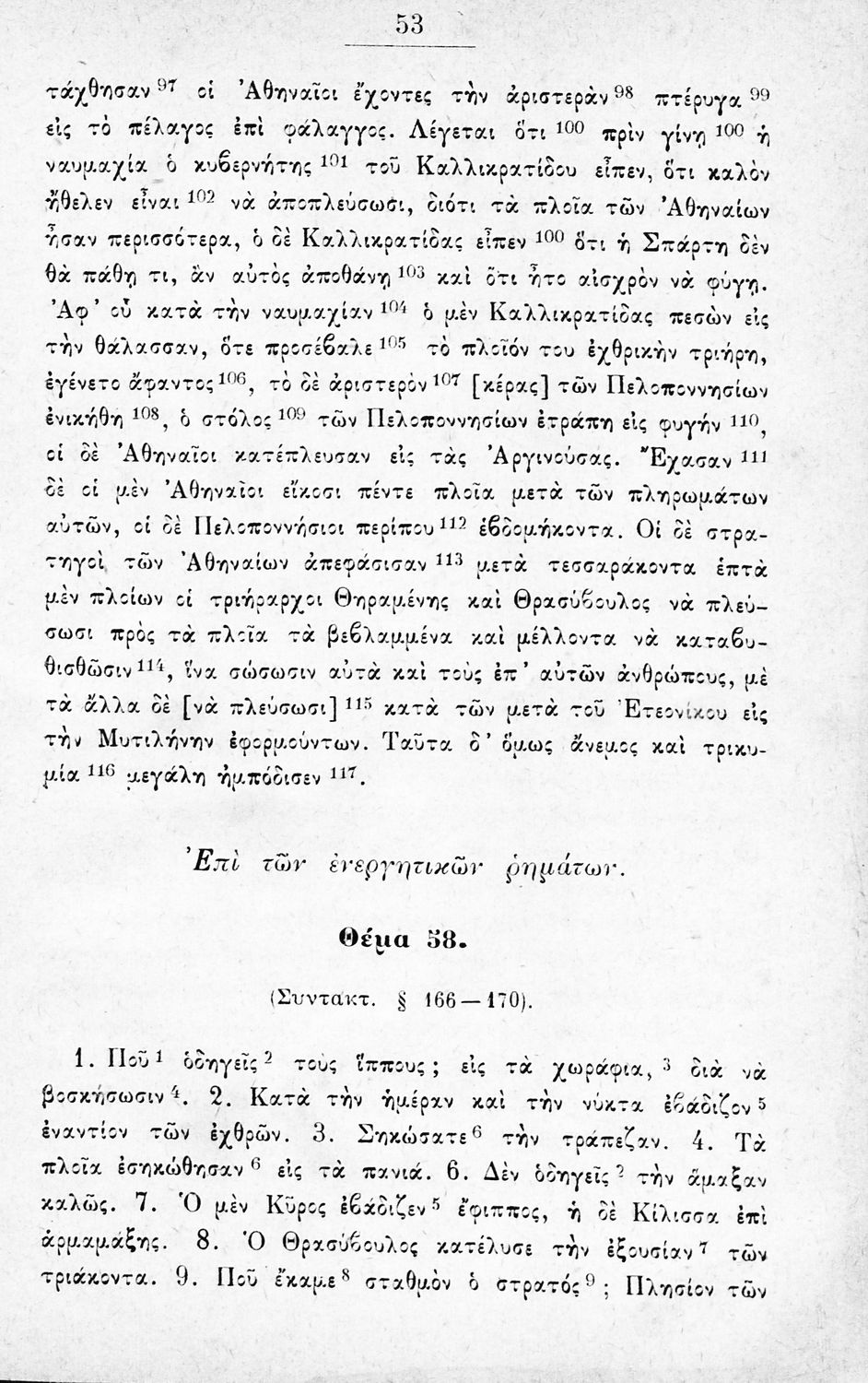 Μαθητικό βοήθημα Αρχαίων Ελληνικών της τρίτης τάξης των τετρατάξιων Γυμνασίων. Το βιβλίο περιέχει τα έργα του Δημοσθένη, Περί της ειρήνης και Α΄ Φιλιππικός από μετάφραση.