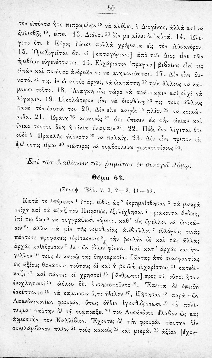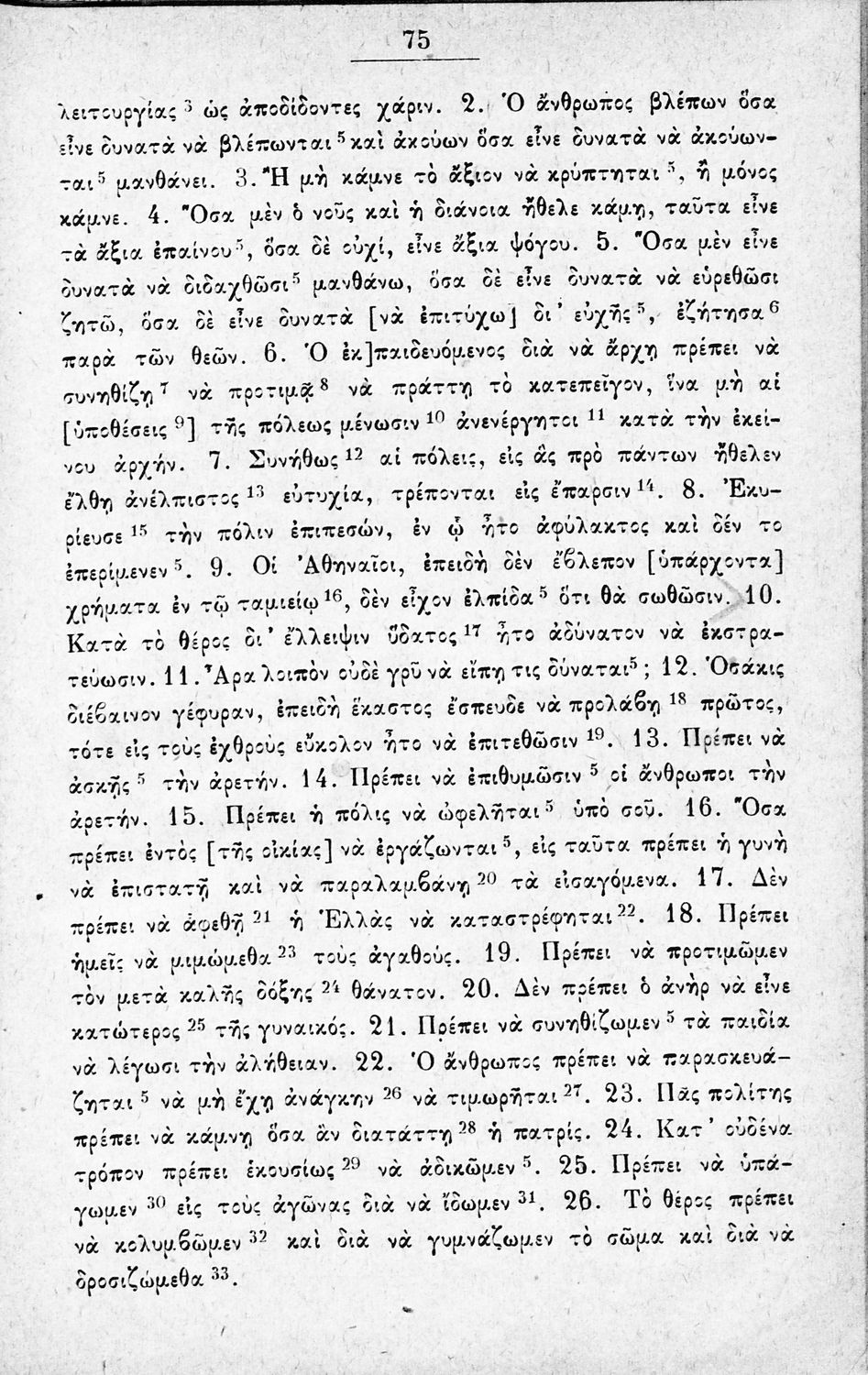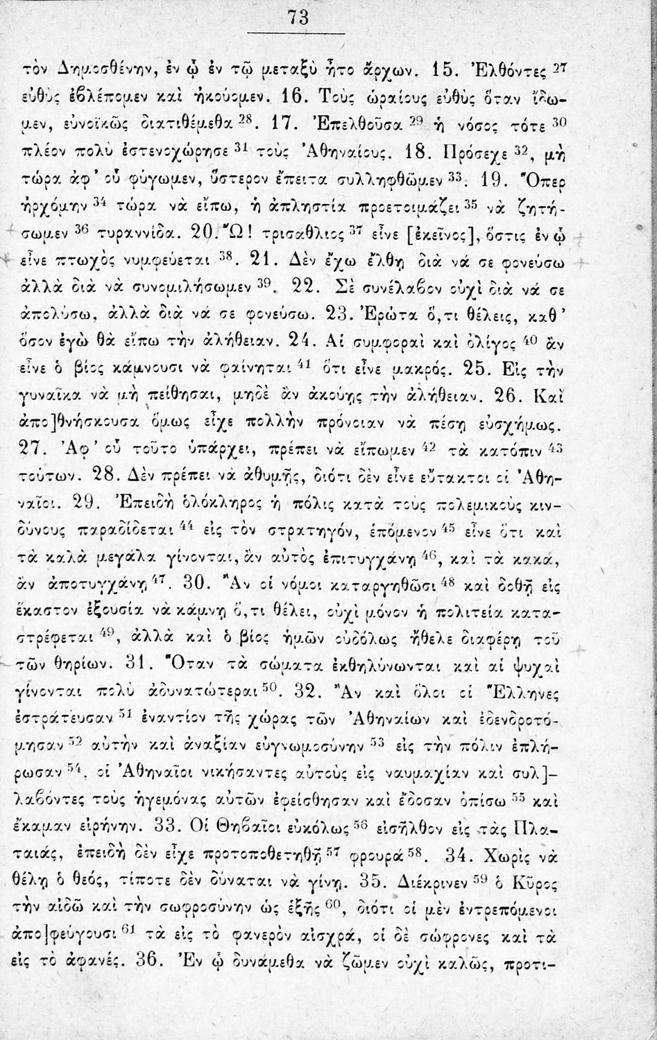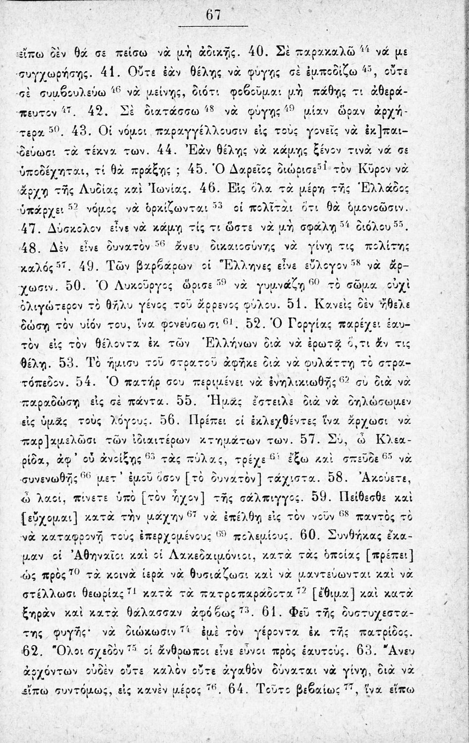 Μαθητικό βοήθημα Αρχαίων Ελληνικών της τρίτης τάξης των τετρατάξιων Γυμνασίων. Το βιβλίο περιέχει τα έργα του Δημοσθένη, Περί της ειρήνης και Α΄ Φιλιππικός από μετάφραση.