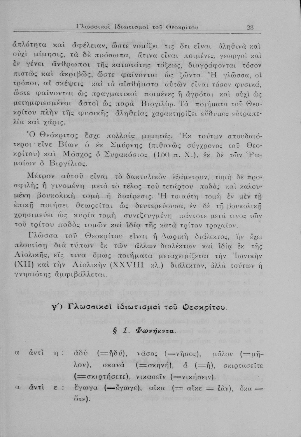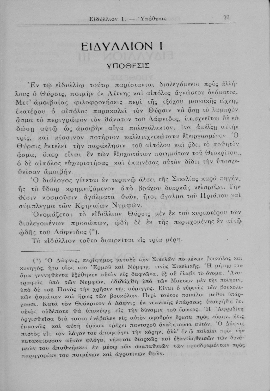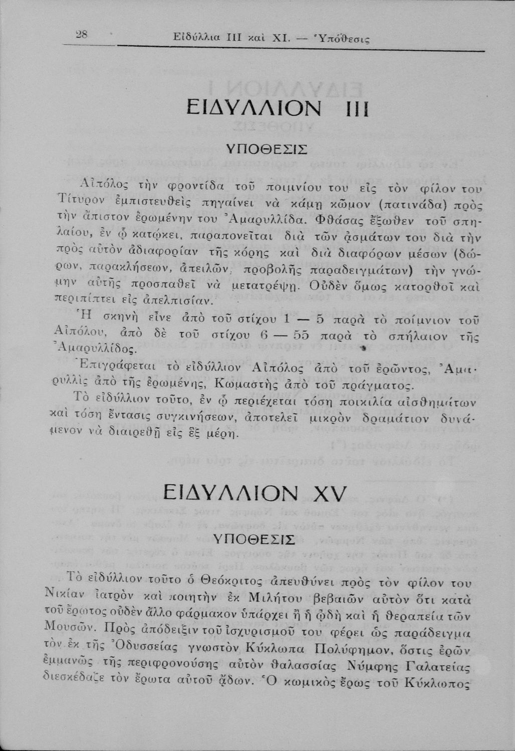 Σχολικό εγχειρίδιο Αρχαίων Ελληνικών που περιλαμβάνει τα ειδύλλια του Θεόκριτου, εισαγωγή στην βουκολική ποίηση, και στη ζωή και το έργο του Θεόκριτου, την υπόθεση του έργου και γραμματικές και συντακτικές ...