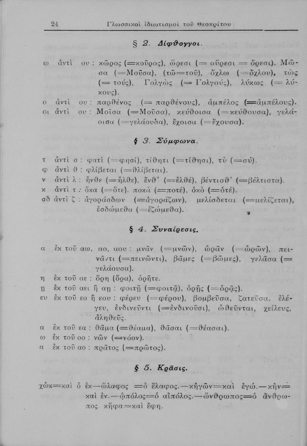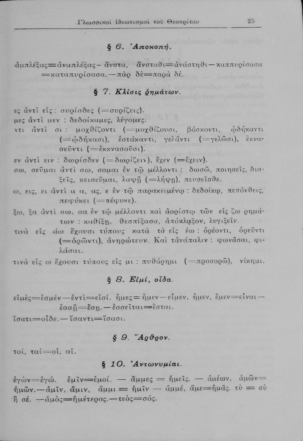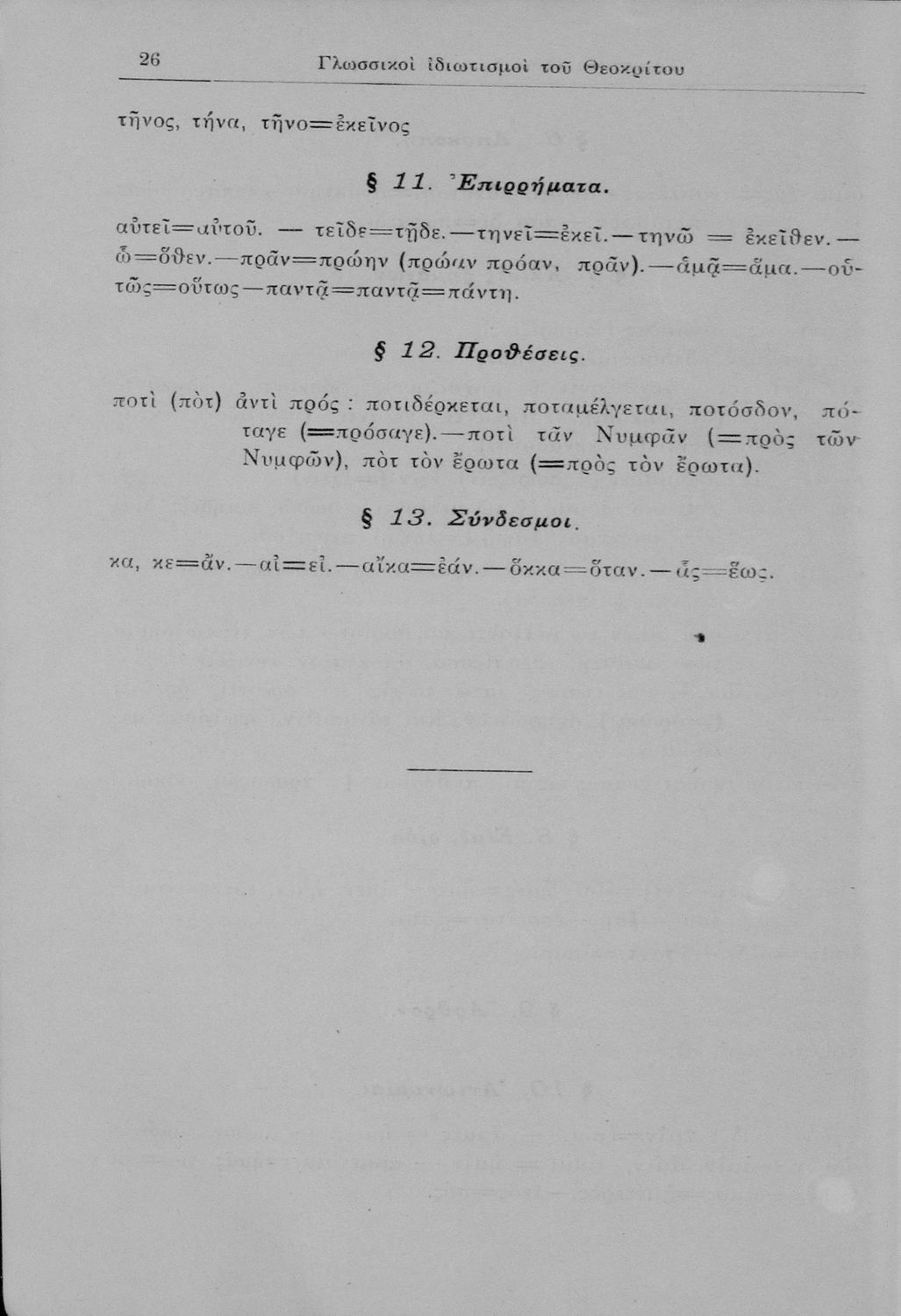 Σχολικό εγχειρίδιο Αρχαίων Ελληνικών που περιλαμβάνει τα ειδύλλια του Θεόκριτου, εισαγωγή στην βουκολική ποίηση, και στη ζωή και το έργο του Θεόκριτου, την υπόθεση του έργου και γραμματικές και συντακτικές ...