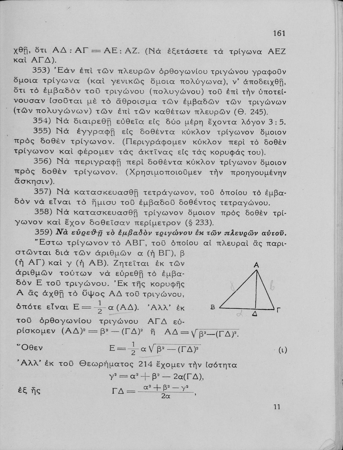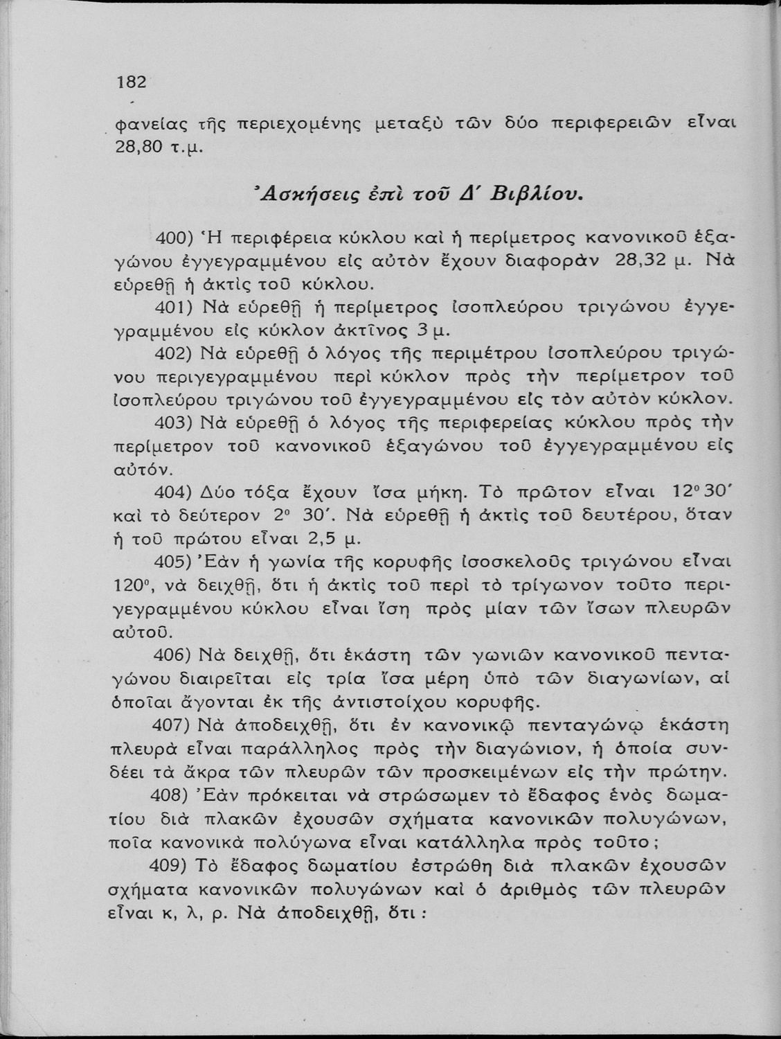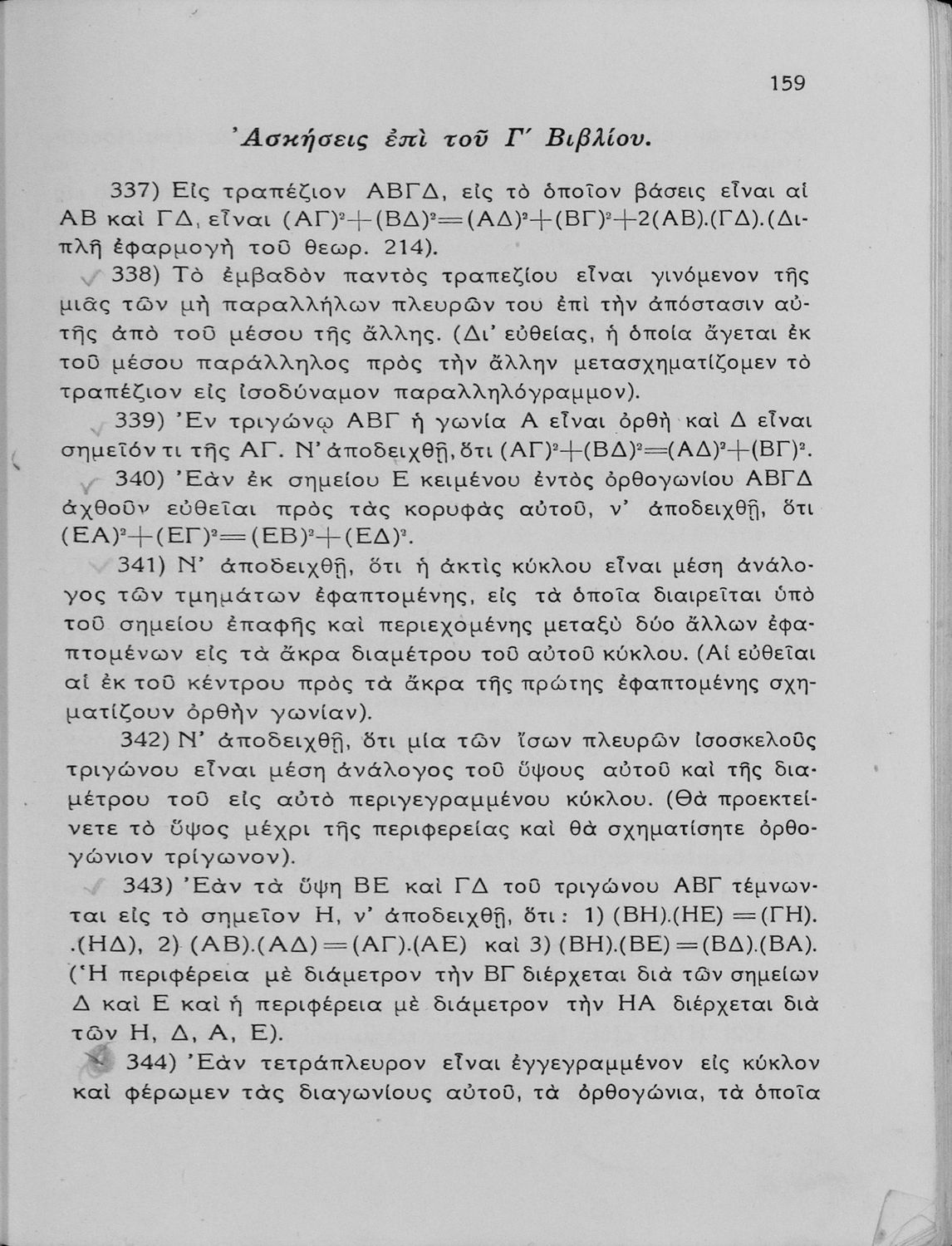 Βαθμίδα εκπαίδευσης: Δευτεροβάθμια Τάξη: Δ' Γυμνασίου / Ε' Γυμνασίου / ΣΤ' Γυμνασίου Μάθημα: Μαθηματικά Γλώσσα: Απλή καθαρεύουσα Παρουσίαση περιεχομένου: Σχολικό εγχειρίδιο Γεωμετρίας για τις Α΄, Β΄, Γ΄ Γυμνασίου που είναι χωρισμένο σε Επιπεδομετρία και Στερεομετρία και περιλαμβάνει θεωρία και ασκήσεις. |