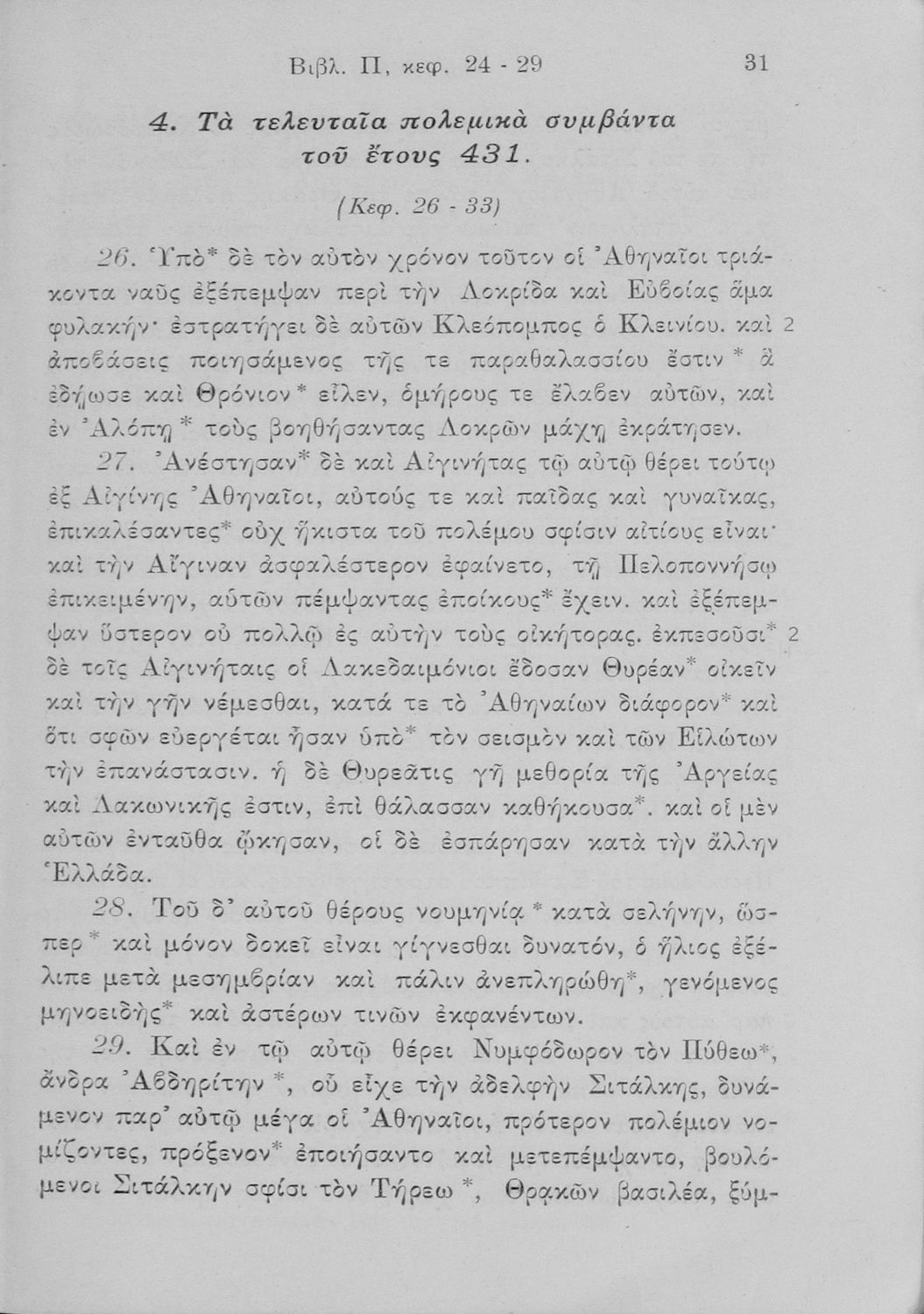 Βαθμίδα εκπαίδευσης: Δευτεροβάθμια Τάξη: Δ' Γυμνασίου / Ε' Γυμνασίου / ΣΤ' Γυμνασίου Μάθημα: Αρχαία Ελληνικά Γλώσσα: Καθαρεύουσα Παρουσίαση περιεχομένου: Σχολικό εγχειρίδιο Αρχαίων Ελληνικών για τις Δ΄, Ε΄ και ΣΤ΄ Γυμνασίου που περιλαμβάνει εισαγωγή στη ζωή και το έργο του Θουκυδίδη, αποσπάσματα από το δεύτερο βιβλίο της Ιστορίας, πραγματολογικές παρατηρήσεις και ετυμολογικό λεξιλόγιο. |