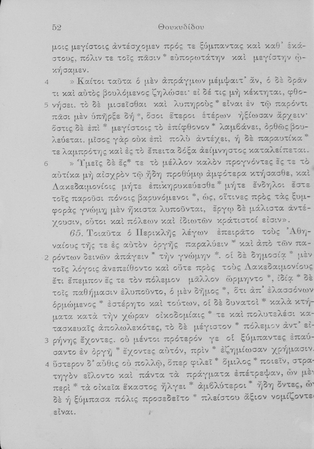 Σχολικό εγχειρίδιο Αρχαίων Ελληνικών Δ΄, Ε΄ και ΣΤ΄ Γυμνασίου που περιέχει αποσπάσματα από το έργο του Θουκυδίδη Ιστορία, ερμηνευτικά και πραγματολογικά σχόλια, και γραμματικές παρατηρήσεις.