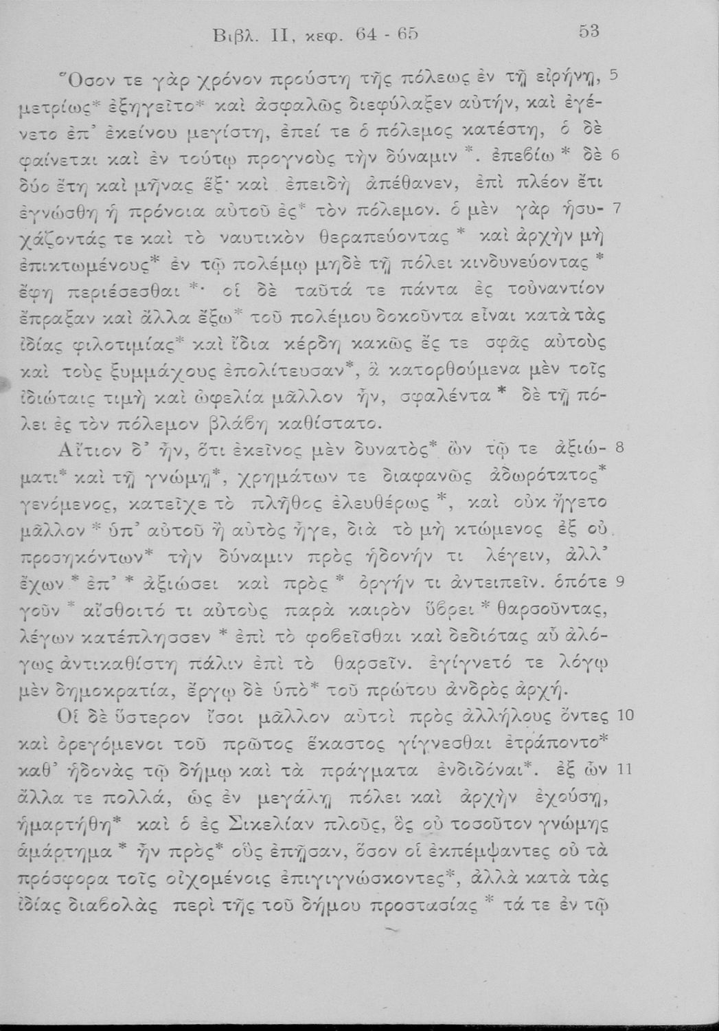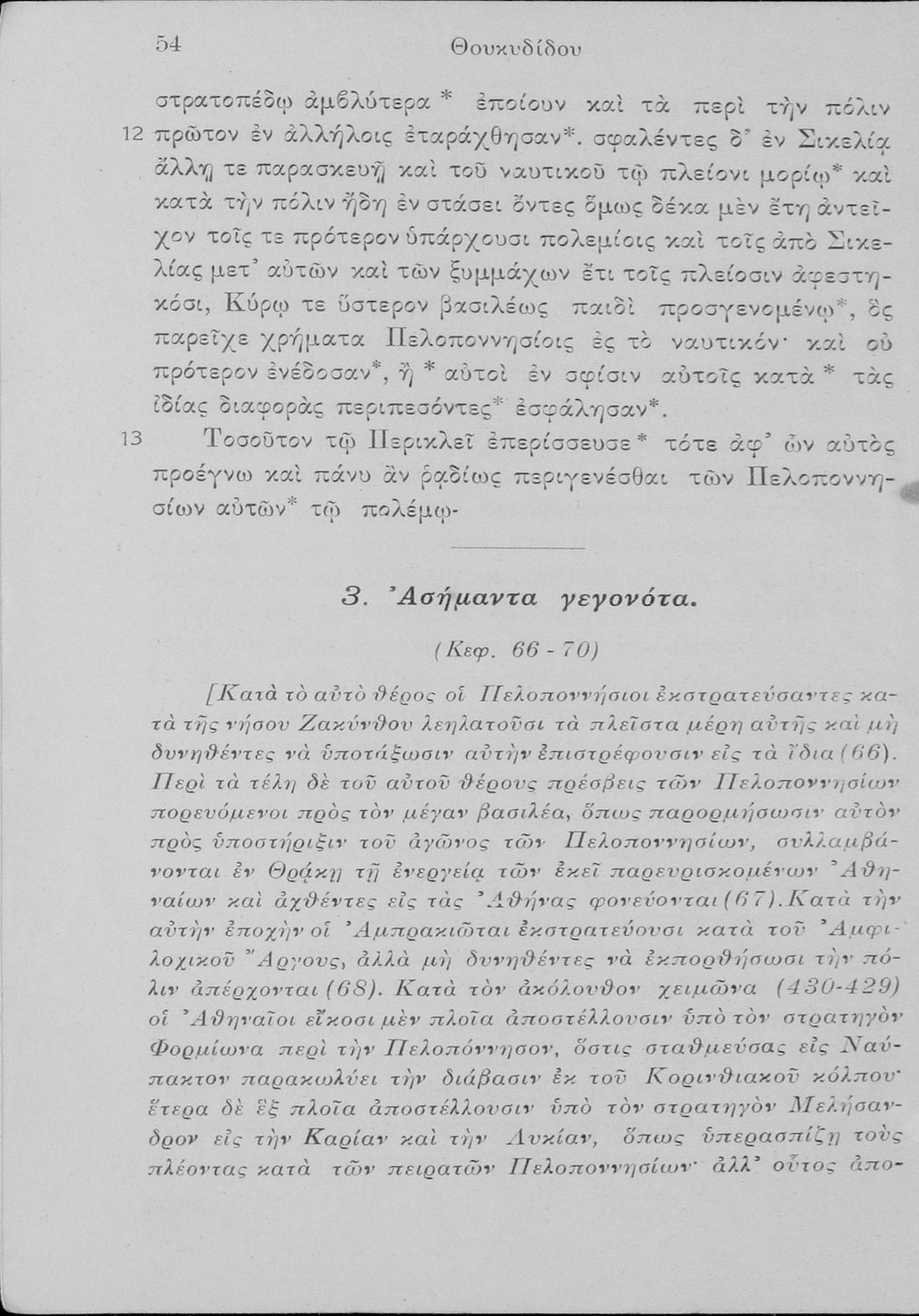 Σχολικό εγχειρίδιο Αρχαίων Ελληνικών για τις Β΄ και Γ΄ Γυμνασίου που περιλαμβάνει σύντομο βιογραφικό σημείωμα του Θουκυδίδη, εισαγωγικά σχόλια στο έργο, κείμενο και ετυμολογικό λεξιλόγιο.