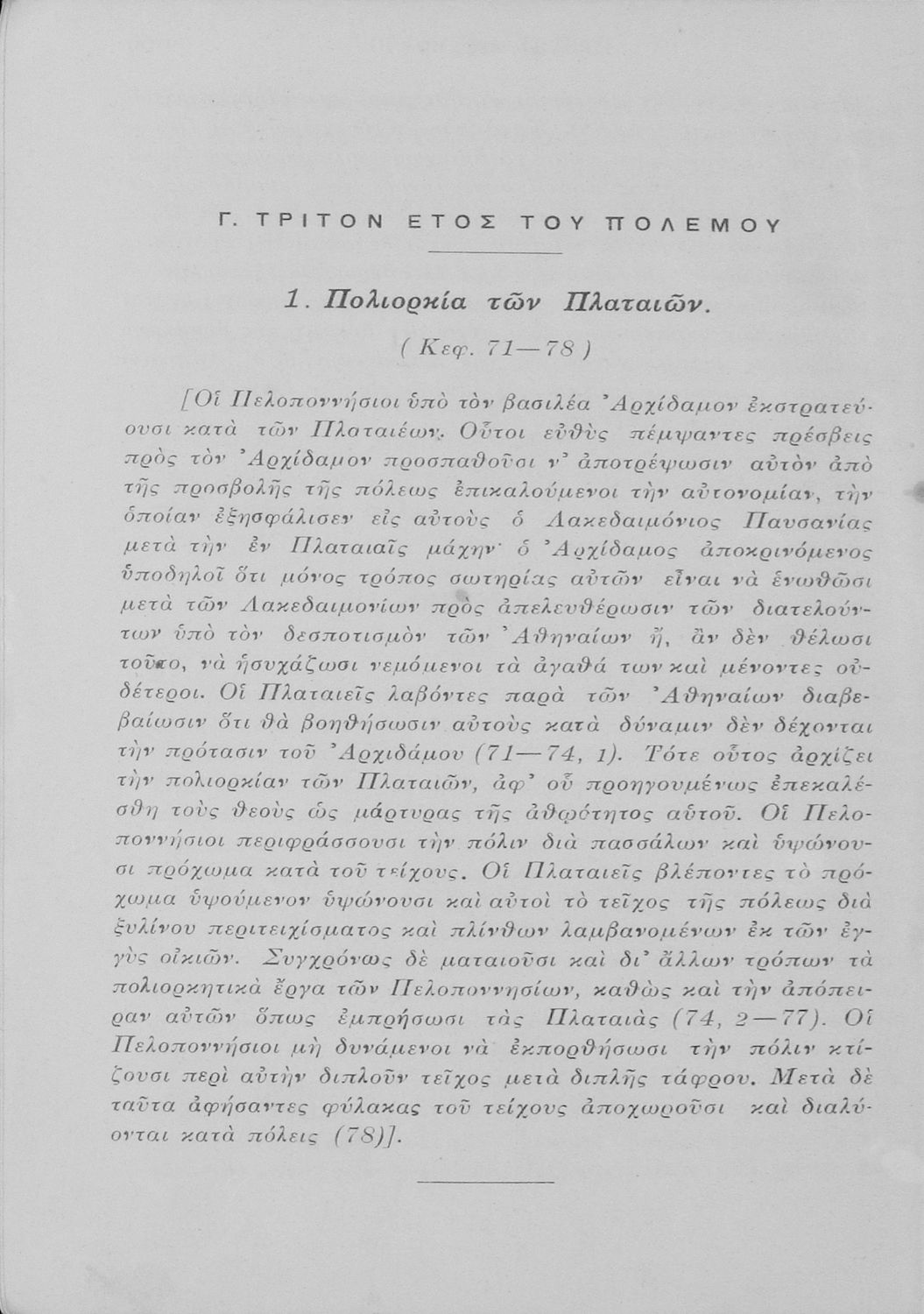 Σχολικό εγχειρίδιο Αρχαίων Ελληνικών για τις Δ΄, Ε΄ και ΣΤ΄ Γυμνασίου παλαιού τύπου που περιλαμβάνει σύντομο βιογραφικό σημείωμα του Θουκυδίδη, περιγραφή του ιστορικού πλαισίου, αποσπάσματα από τα Πλαταϊκά, τα