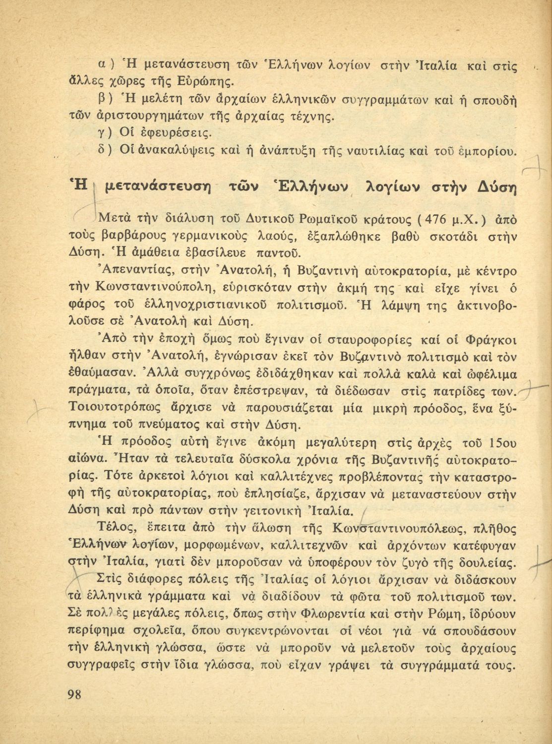 Μαθητικό βοήθα Ιστορίας Ε΄ Δημοτικού που καλύπτει την περίοδο από την ίδρυση της ρωμαϊκής αυτοκρατορίας ως την άλωση της Κωνσταντινούπολης και την Αναγέννηση στην Ευρώπη. Αναφέρεται στην πνευματική κίνηση της ...