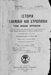Κωδικός αναγνώρισης: 01-17229 Τίτλος: Ιστορία Ελληνική και Ευρωπαϊκή των Νέων Χρόνων. Δια την ΣΤ΄ Τάξιν των Γυμνασίων και τας αντίστοιχους των λοιπών σχολείων της Μέσης Εκπαίδευσης. Συγγραφέας: Χ. Θεοδωρίδης, Α. Λαζάρου Μέγεθος και υπόστρωμα: Σχολικό εγχειρίδιο, μαλακό εξώφυλλο, 458 σελίδες. Σκίτσα, χάρτης, εικόνες (ασπρόμαυρα). |