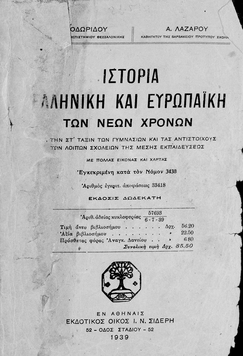 Εκδότης: Ιωάννης Ν. Σιδέρης Έτος έκδοσης: 1939 Τόπος έκδοσης: Αθήνα Έκδοση: 12η Υπουργική απόφαση / Σύμβαση: 57693/6-7-1939 Έτος έγκρισης: 1939 |