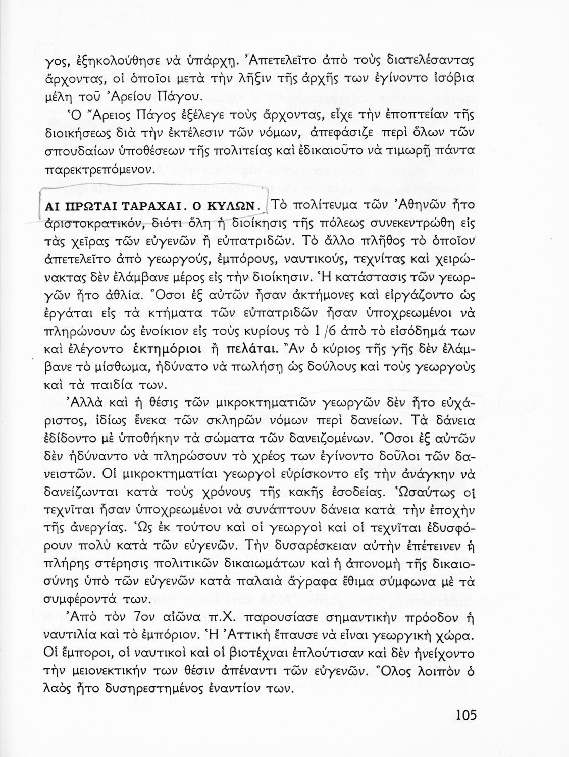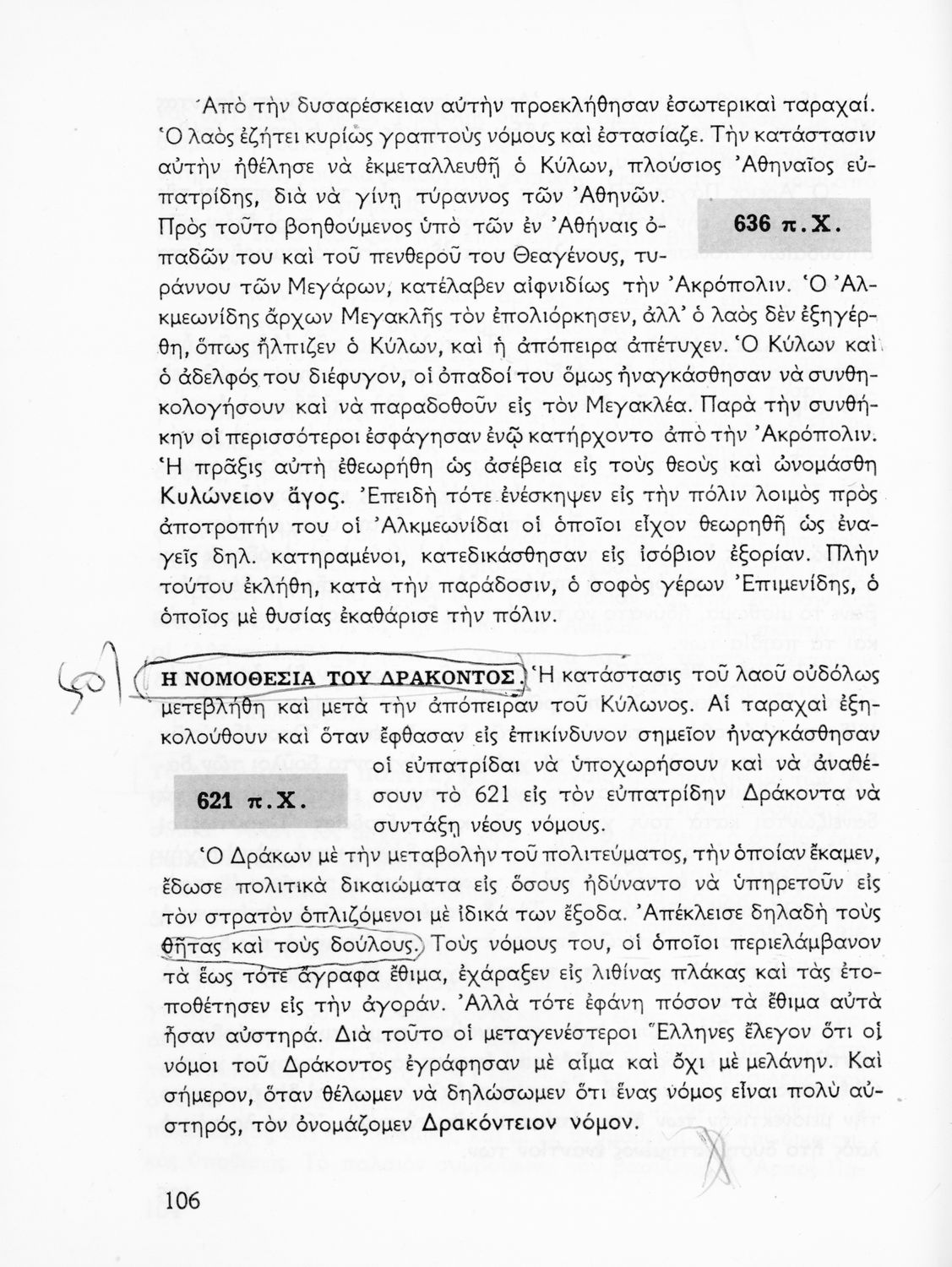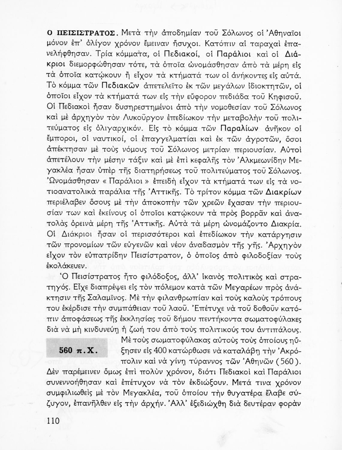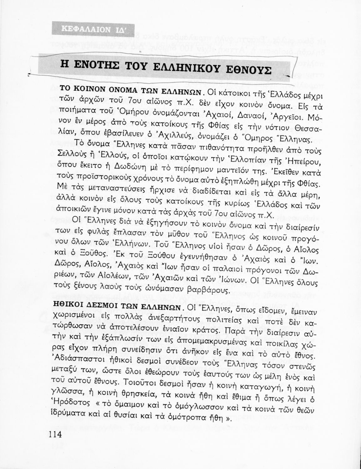 Σχολικό εγχειρίδιο Ιστορίας Α΄ Γυμνασίου που καλύπτει την περίοδο από την εμφάνιση των πρώτων πολιτισμών ως το τέλος της Μακεδονικής Ηγεμονίας. Φέρει το σύμβολο της δικτατορίας.