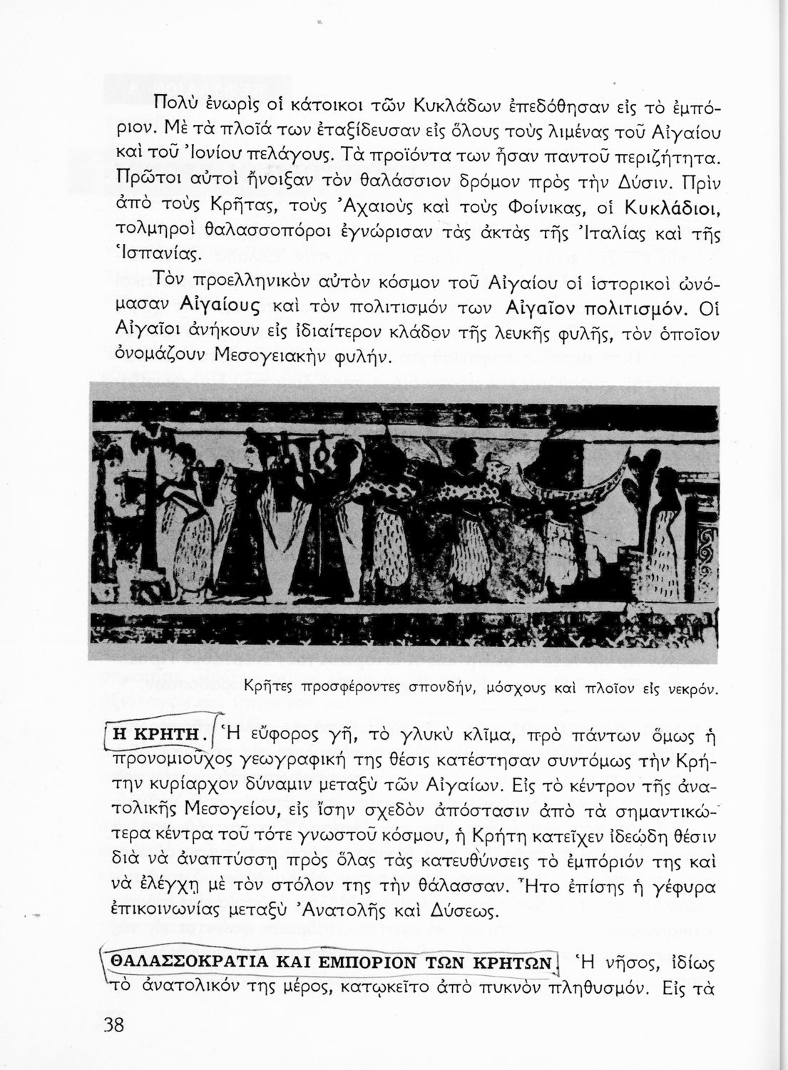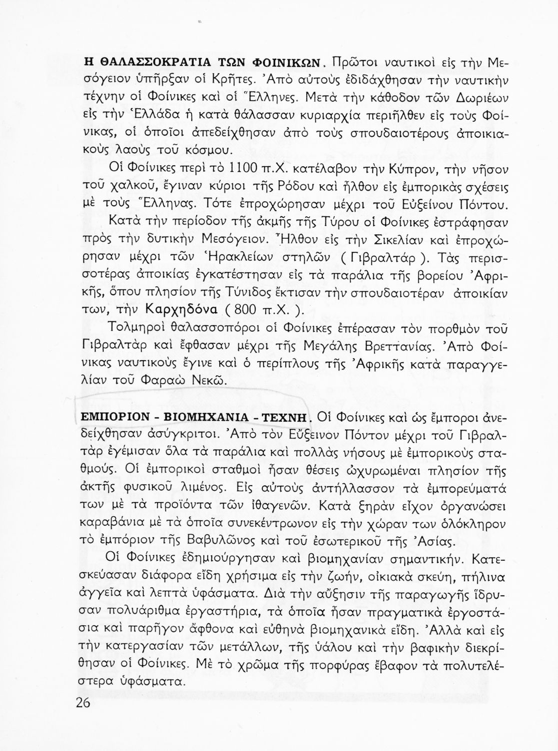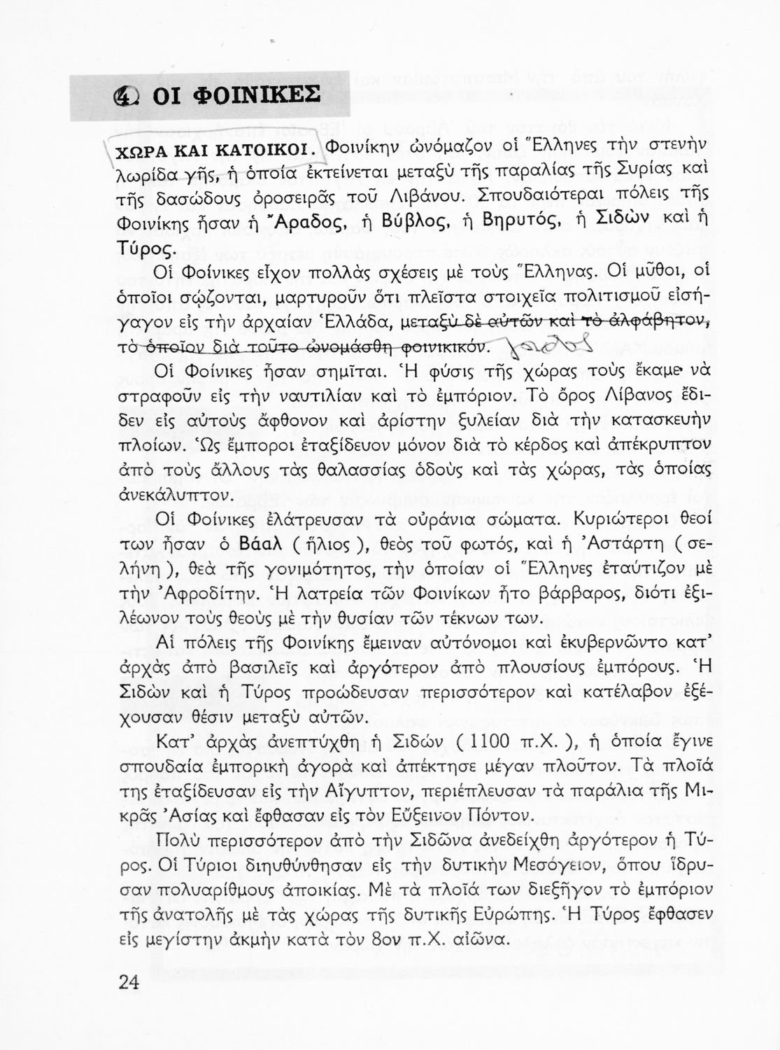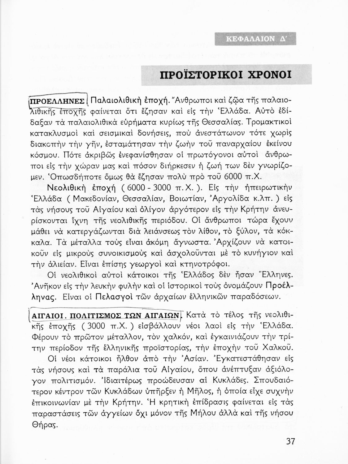 Σχολικό εγχειρίδιο Ιστορίας Α΄ Γυμνασίου που καλύπτει την περίοδο από την εμφάνιση των πρώτων πολιτισμών ως το τέλος της Μακεδονικής Ηγεμονίας. Φέρει το σύμβολο της δικτατορίας.