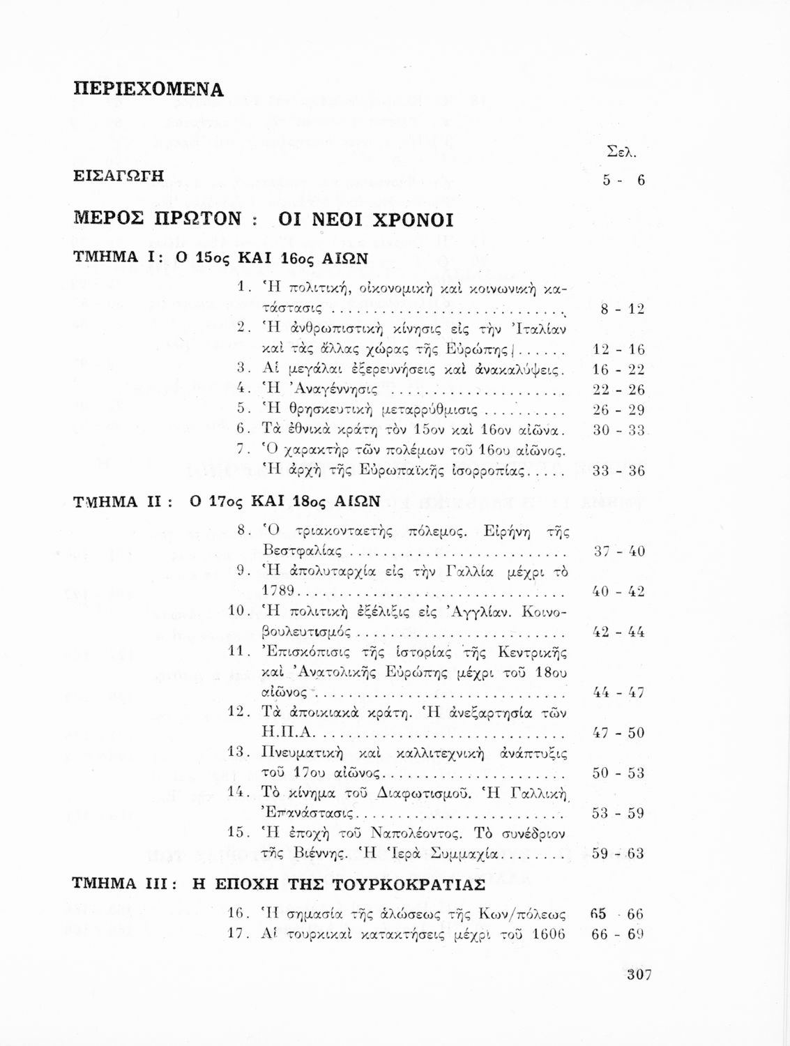 Σχολικό εγχειρίδιο Ιστορίας Γ΄ Γυμνασίου που καλύπτει την περίοδο της Αναγέννησης και του Διαφωτισμού στην Ευρώπη και την προετοιμασία της Ελληνικής Επανάστασης. Συνοπτικά αναφέρεται στο διάστημα από τη βασίλεια του 'Όθωνα ως τους δύο Παγκόσμιους Πολέμους και τον Ψυχρό Πόλεμο. Παρουσιάζει και την πνευματική κίνηση κατά τον 19ο και 20ο αιώνα.