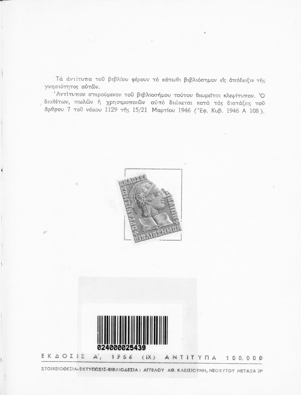 Εκδότης: Οργανισμός Εκδόσεως Σχολικών Βιβλίων Έτος έκδοσης: 1956 Τόπος έκδοσης: Αθήνα Έκδοση: 1η Υπουργική απόφαση / Σύμβαση: 150498/22-12-1955, 14580/6-2-1956 Έτος έγκρισης: 1956 |