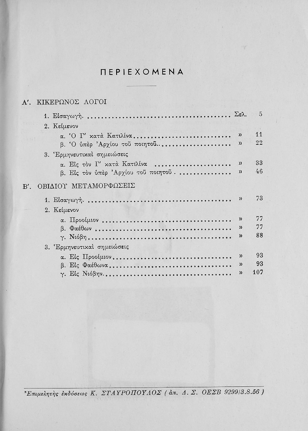Σχολικό εγχειρίδιο Λατινικών για την Ε΄ Γυμνασίου παλαιού τύπου και την ΣΤ΄ Γυμνασίου νέου τύπου ου περιέχει βιογραφικό σημείωμα των Κικέρωνα και Οβίδιου, εισαγωγικά σχόλια, κείμενο και ερμηνευτικές σημειώσεις.