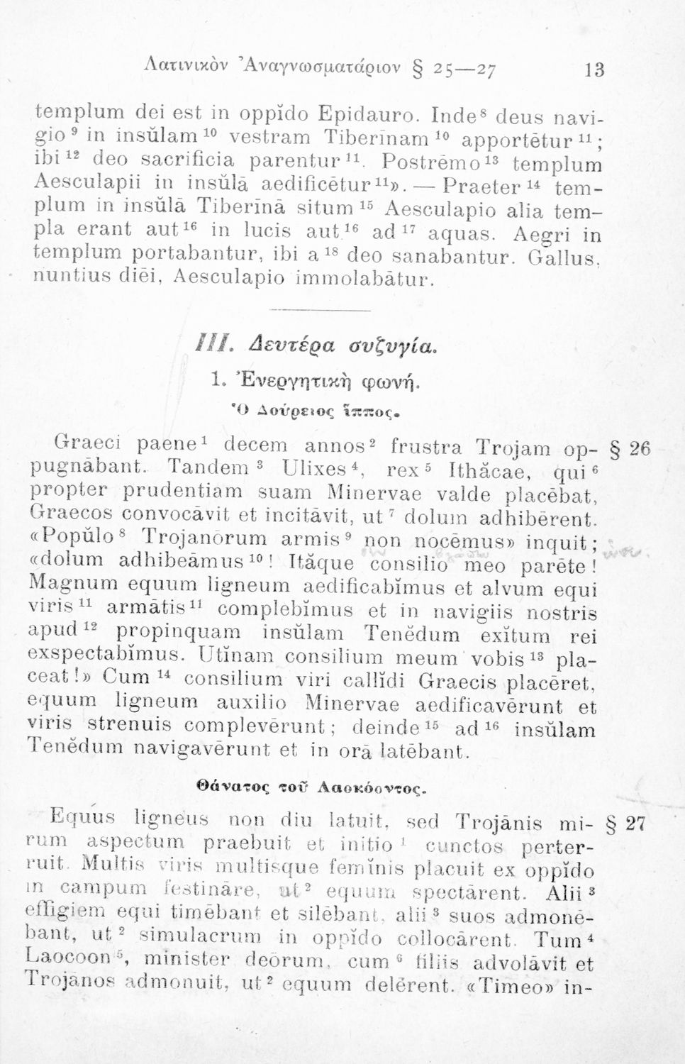 Σχολικό εγχειρίδιο Λατινικών για τη Γ΄ Γυμνασίου που περιέχει 54 κείμενα/περικοπές στα λατινικά, ερμηνευτικά υπομνήματα, λεξιλόγιο και κατάλογο με τα συντακτικά φαινόμενα (αφαιρετική, προθέσεις, σύνδεσμοι) που