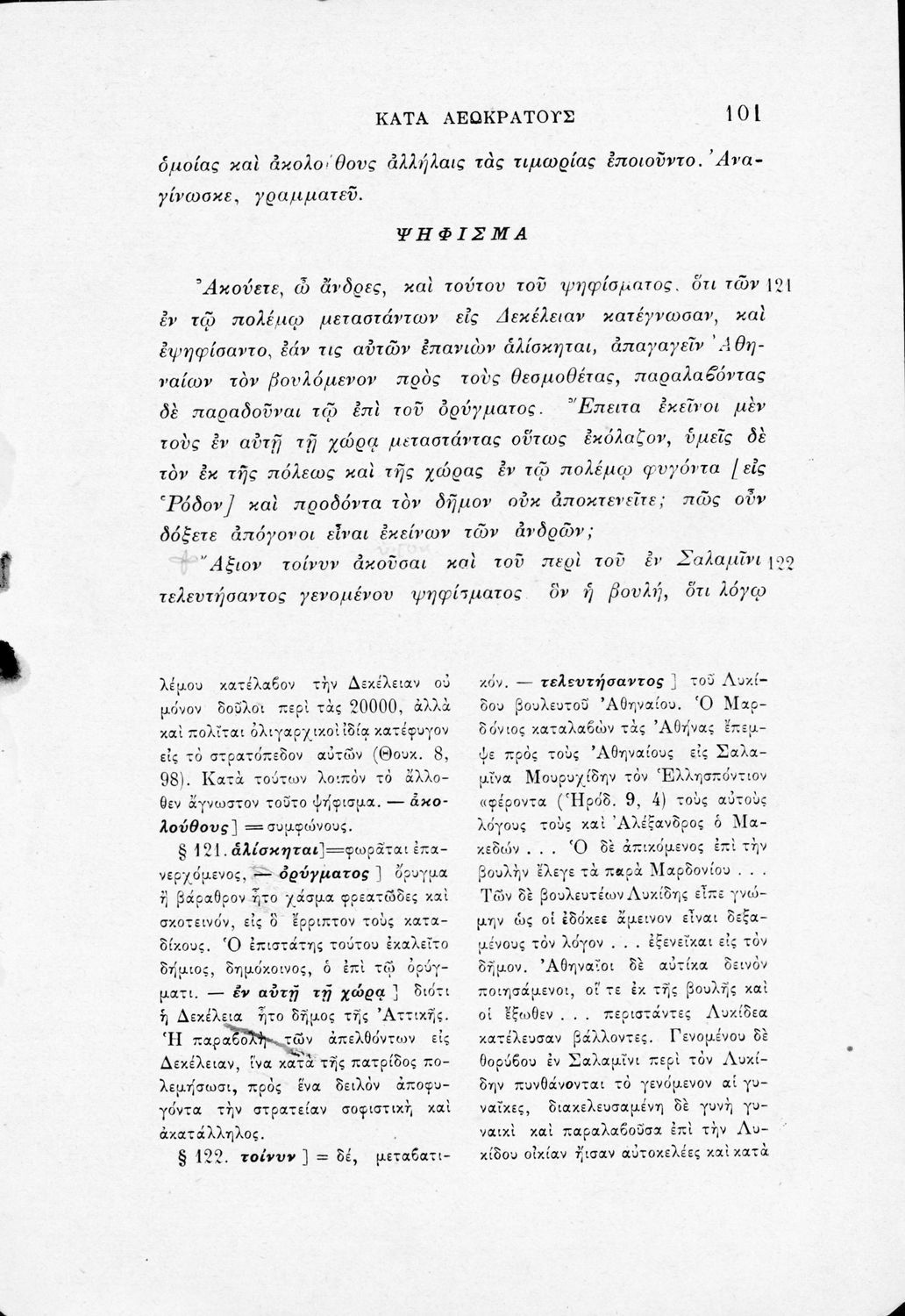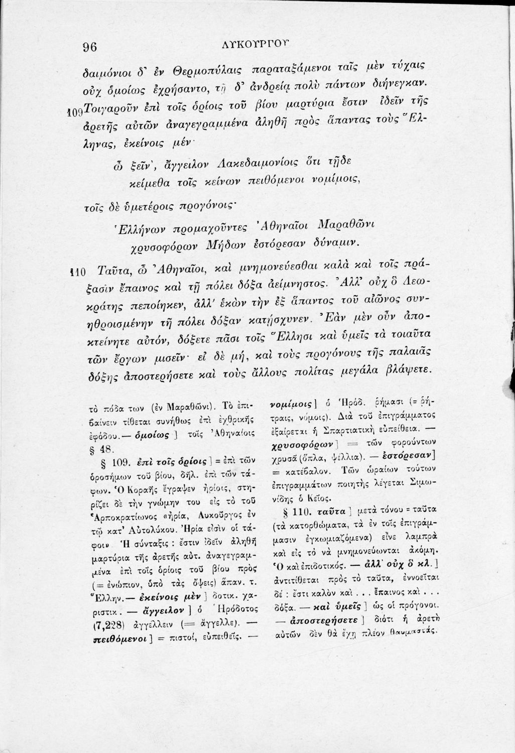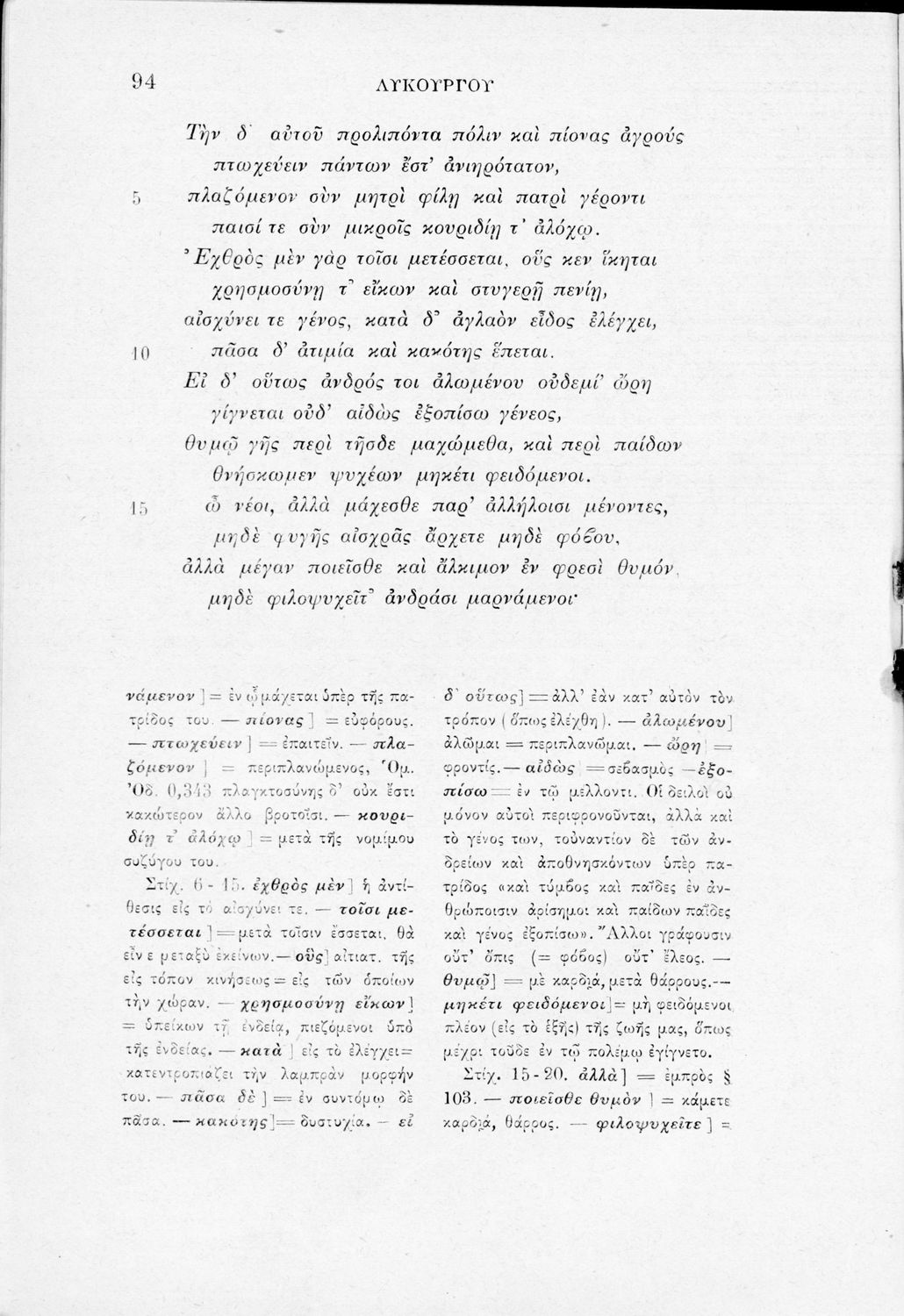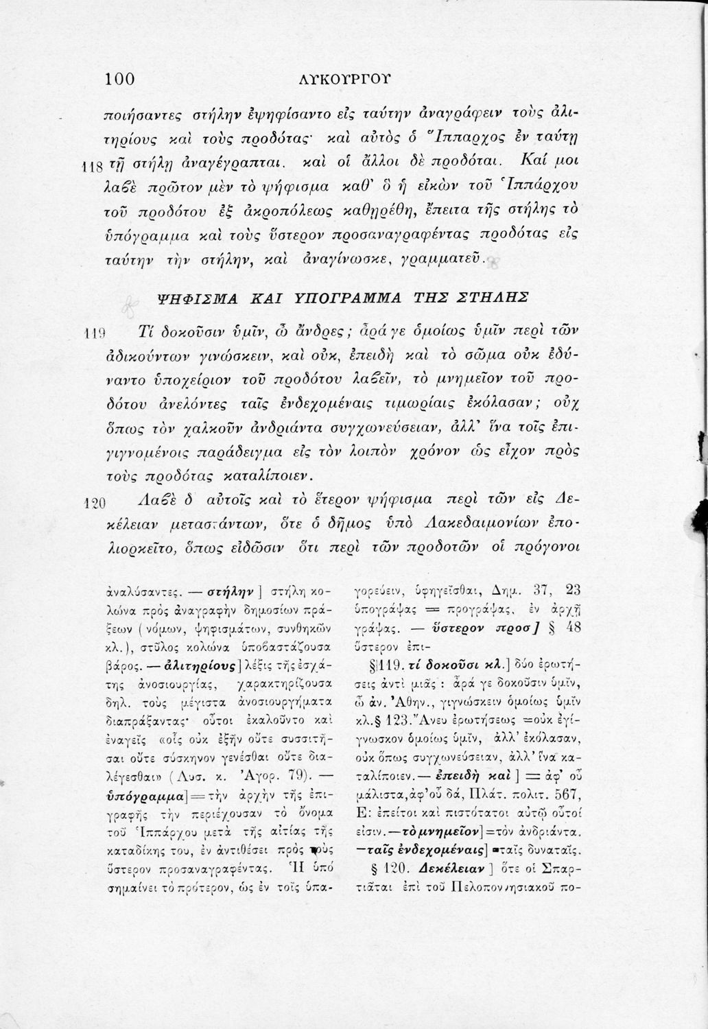 Μαθητικό βοήθημα Αρχαίων Ελληνικών για τα Ελληνικά Σχολεία, τα Παρθεναγωγεία και τα Γυμνάσια που περιλαμβάνει το έργο του Λυκούργου Λόγος κατά Λεωκράτους και ερμηνευτικές σημειώσεις.
