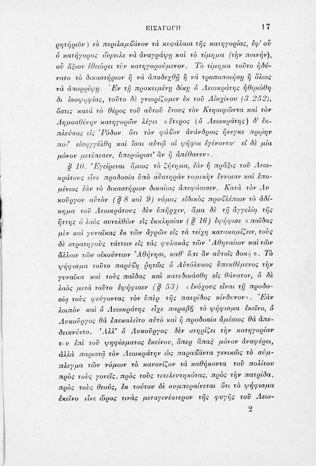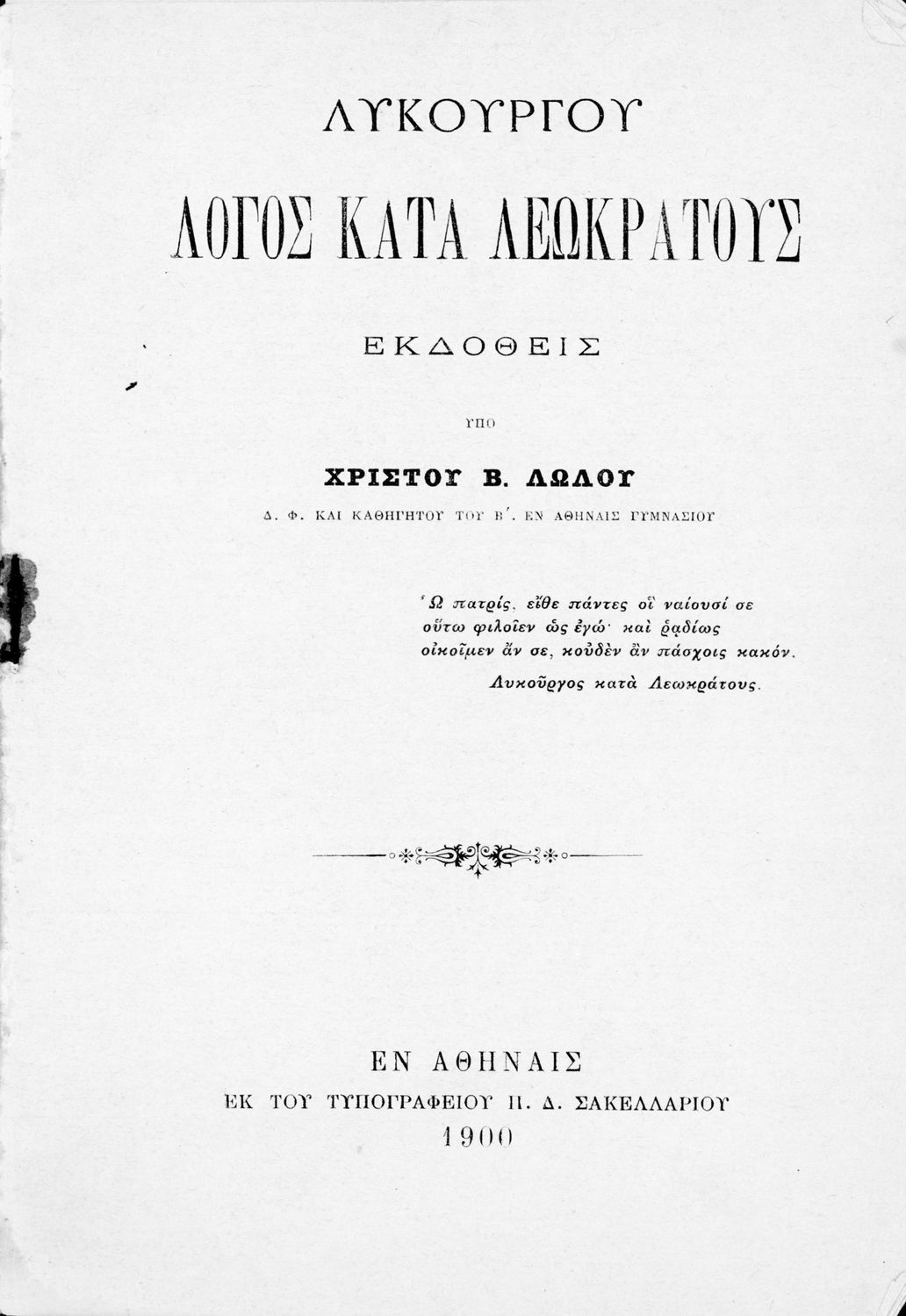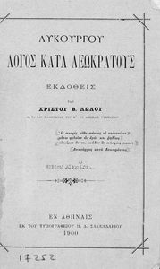 Μαθητικό βοήθημα Αρχαίων Ελληνικών για τα Ελληνικά Σχολεία, τα Παρθεναγωγεία και τα Γυμνάσια που περιλαμβάνει το έργο του Λυκούργου Λόγος κατά Λεωκράτους και ερμηνευτικές σημειώσεις.