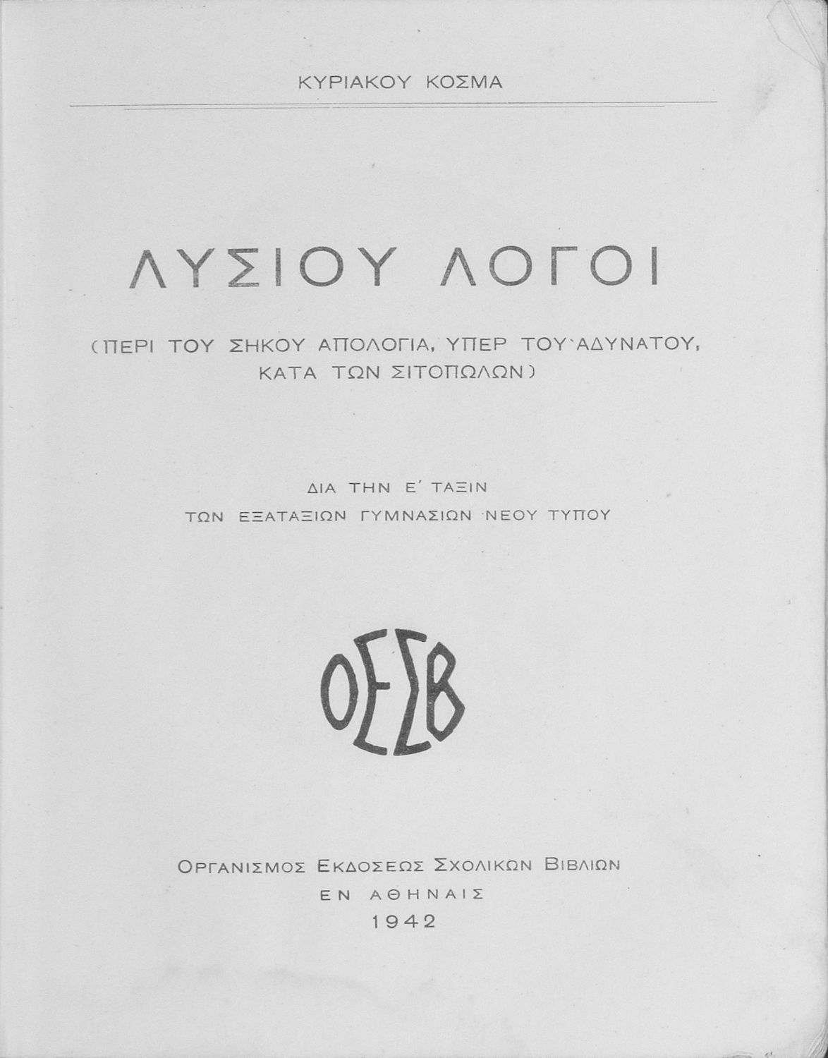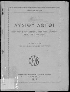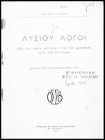 Τίτλος: Λυσίου Λόγοι (Περί του σηκού απολογία, Υπέρ του Αδυνάτου, Κατά των Σιτοπωλών) δια την Ε΄ τάξιν των Εξαταξίων Γυμνασίων νέου τύπου
