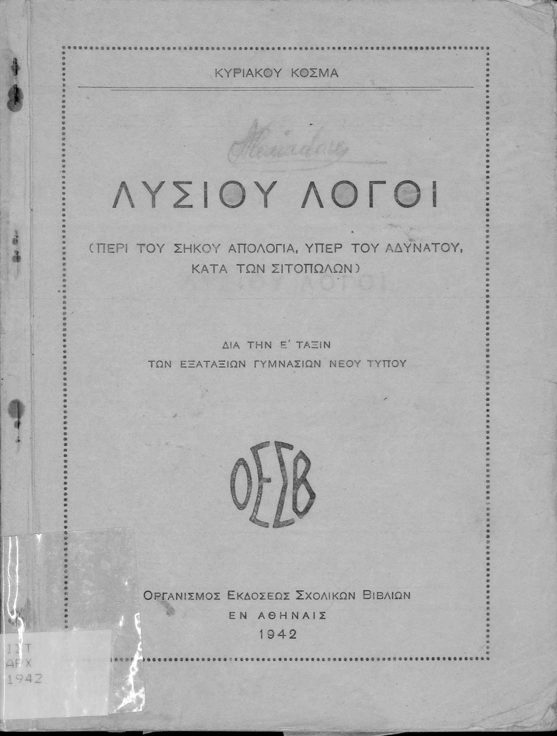 Σχολικό εγχειρίδιο Αρχαίων Ελληνικών Ε΄ Γυμνασίου που περιέχει Λόγους του Λυσία Περί του σηκού απολογία, Υπέρ του αδυνάτου, και Κατά των σιτοπωλών και λεξιλογικές και ερμηνευτικές σημειώσεις.