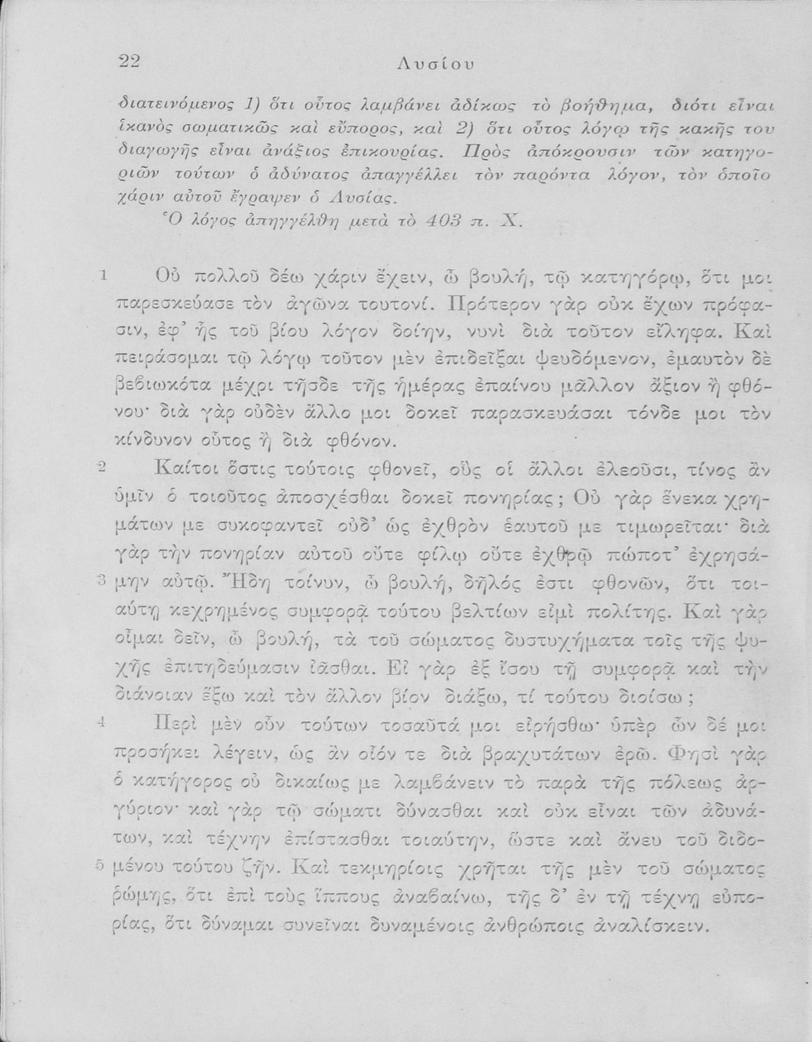 Σχολικό εγχειρίδιο Αρχαίων Ελληνικών Ε΄ Γυμνασίου που περιέχει σύντομο βιογραφικό σημείωμα του Λυσία, τους Λόγους του Περί του σηκού απολογία, Υπέρ του αδυνάτου, Κατά των σιτοπωλών, και ερμηνευτικές σημειώσεις.