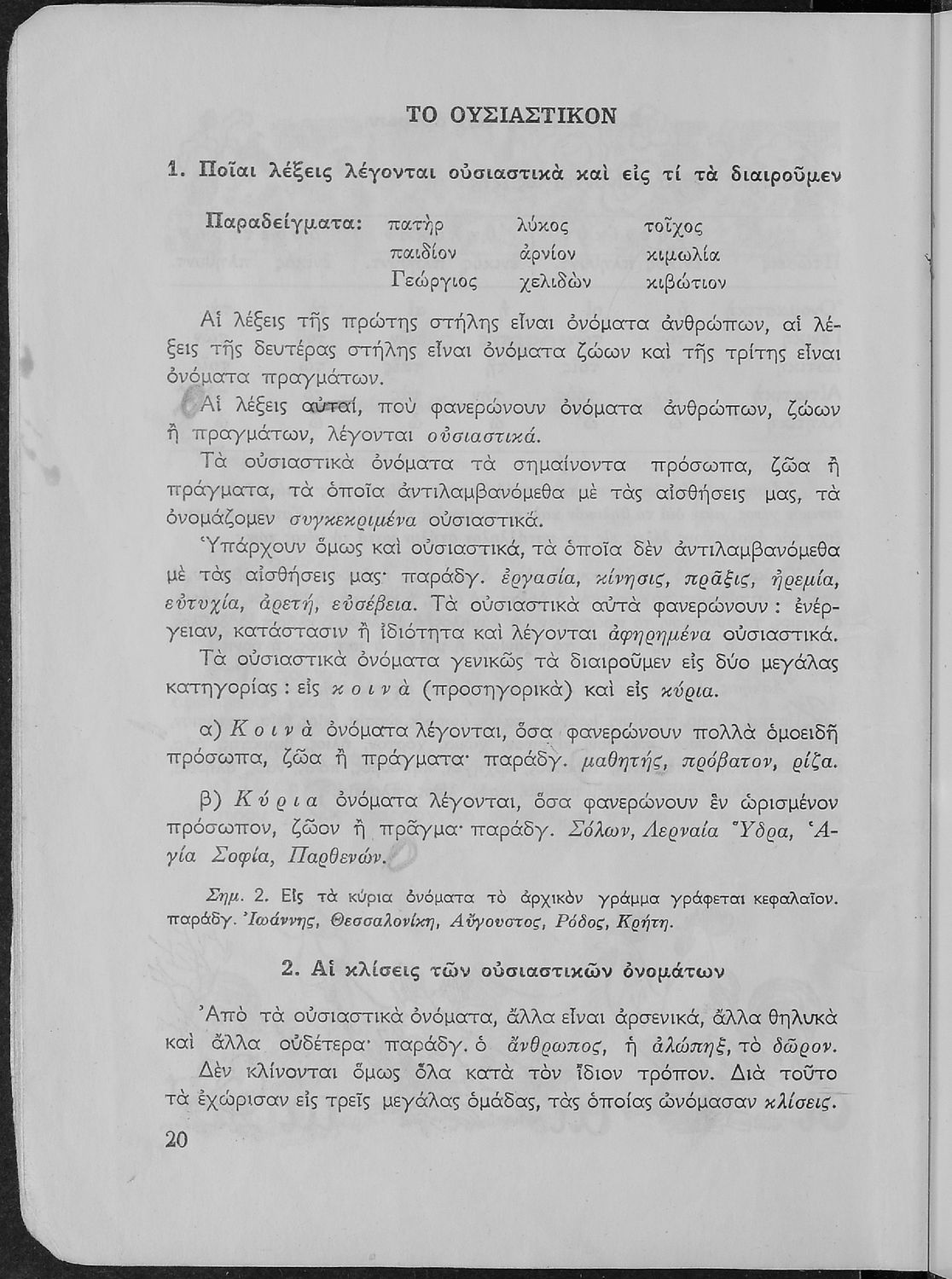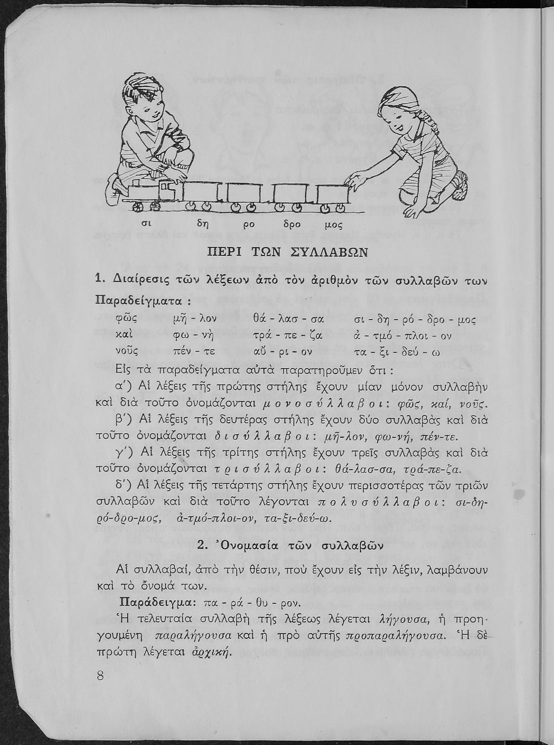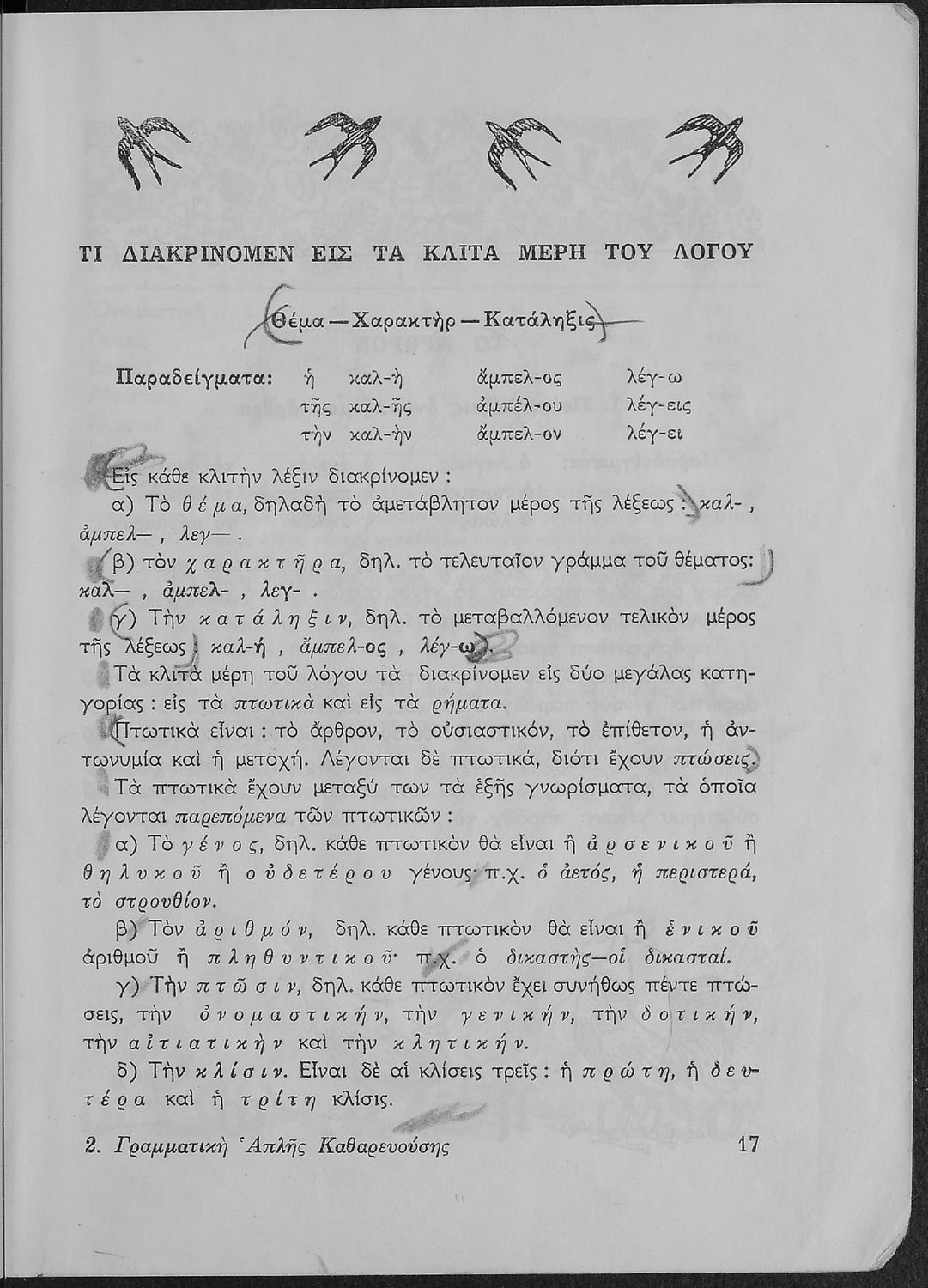 Σχολικό εγχειρίδιο γραμματικής για τους μαθητές της Ε΄ και ΣΤ΄ τάξης του Δημοτικού. Περιέχει τη διδασκαλία της γραμματικής της καθαρεύουσας με κανόνες και παραδείγματα.