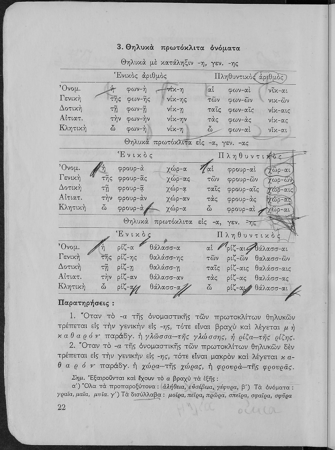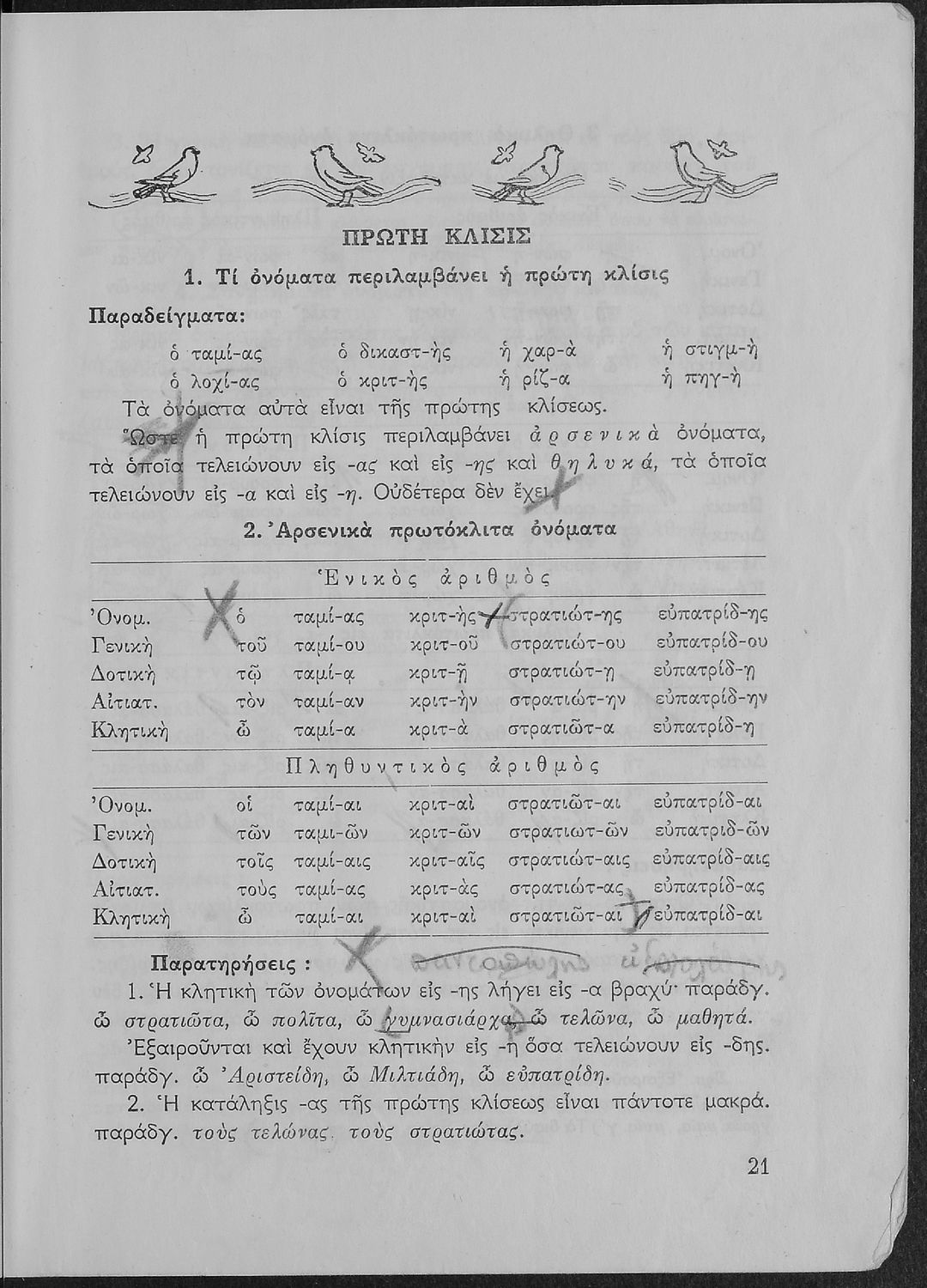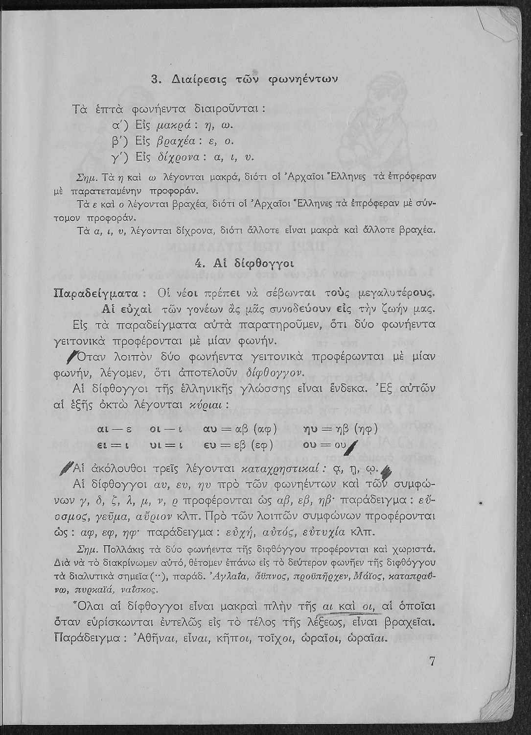 Σχολικό εγχειρίδιο γραμματικής για τους μαθητές της Ε΄ και ΣΤ΄ τάξης του Δημοτικού. Περιέχει τη διδασκαλία της γραμματικής της καθαρεύουσας με κανόνες και παραδείγματα.