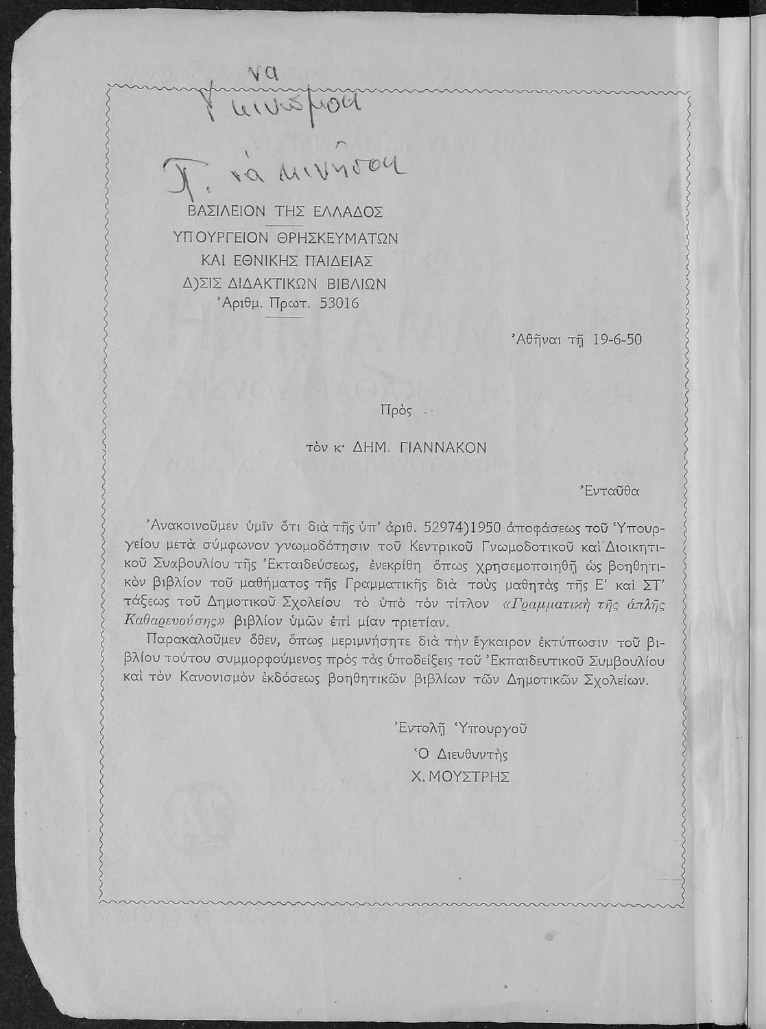 Βαθμίδα εκπαίδευσης: Πρωτοβάθμια Τάξη: Ε' Δημοτικού / ΣΤ' Δημοτικού Μάθημα: Νέα Ελληνικά Γλώσσα: Καθαρεύουσα Παρουσίαση περιεχομένου: Σχολικό εγχειρίδιο γραμματικής για τους μαθητές της Ε΄ και ΣΤ΄ τάξης του Δημοτικού. Περιέχει τη διδασκαλία της γραμματικής της καθαρεύουσας με κανόνες και παραδείγματα. |