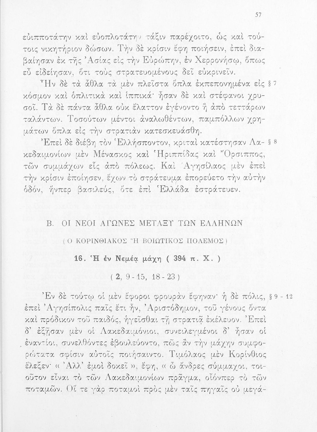 Σχολικό εγχειρίδιο της Β΄ Γυμνασίου για το μάθημα των Αρχαίων Ελληνικών. Περιλαμβάνει κείμενα από το έργο Ελληνικά του Ξενοφώντα. Διαθέτει εισαγωγή, μετάφραση και ερμηνευτικές παρατηρήσεις του συγγραφέα.