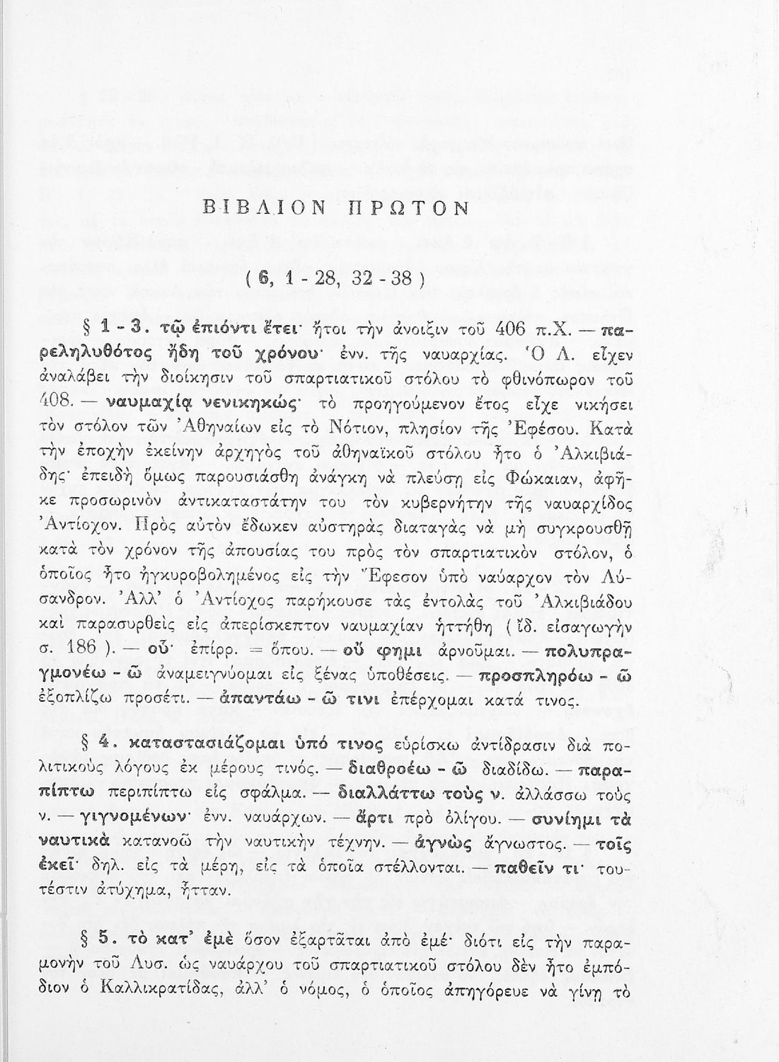Σχολικό εγχειρίδιο Αρχαίων Ελληνικών Β΄ Γυμνασίου που περιλαμβάνει εισαγωγή στα Ελληνικά του Ξενοφώντα, το 3ο και το 4ο βιβλίο από τα Ελληνικά, ερμηνευτικές σημειώσεις και χωρογραφικό πίνακα της περιοχής.