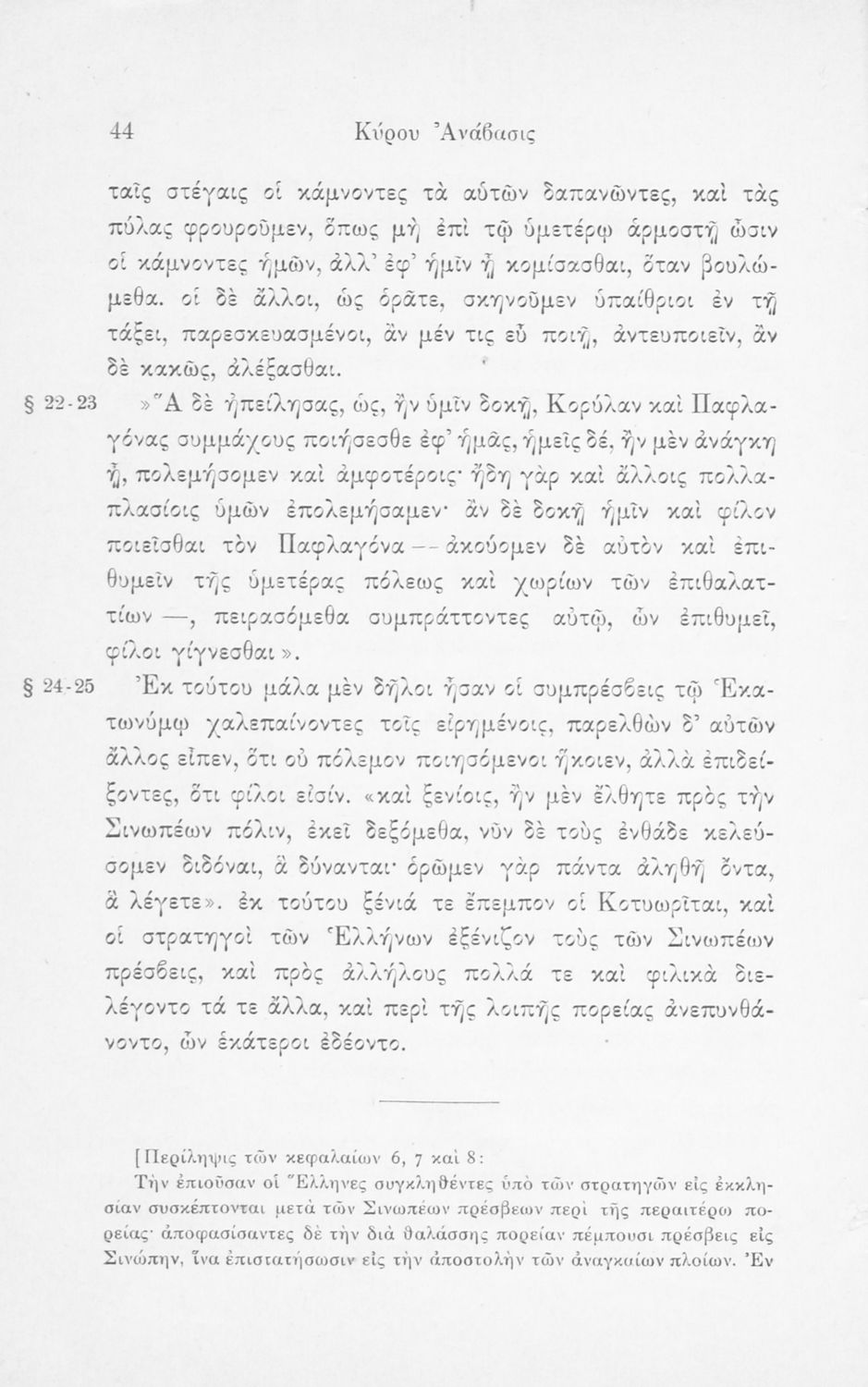 Παρουσίαση περιεχομένου: Σχολικό εγχειρίδιο της Γ' Ελληνικού Σχολείου και Αστικών Σχολείων για το μάθημα των Αρχαίων Ελληνικών. Το σύγγραμμα περιλαμβάνει κείμενα κατ΄ επιλογή από τα τέσσερα τελευταία βιβλία του έργου Κύρου Ανάβασις. Το πρωτότυπο κείμενο συνοδεύεται από ερμηνευτικές, πραγματολογικές και γλωσσικές παρατηρήσεις του συγγραφέα. Ο συγγραφέας ήταν διδάκτωρ φιλολογίας και Καθηγητής στο Α΄ Γυμνάσιο του Πειραιά.
