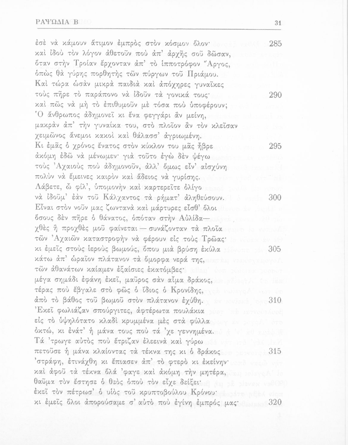 Μαθητικό βοήθημα του Ελληνικού Σχολείου, των Παρθεναγωγείων και του Γυμνασίου για το μάθημα των Αρχαίων Ελληνικών. Περιέχει τις ραψωδίες Ο, Π, Ρ, Σ, Τ, Χ, ψ, Ω από το πρωτότυπο με σχόλια και ερμηνευτικές ...