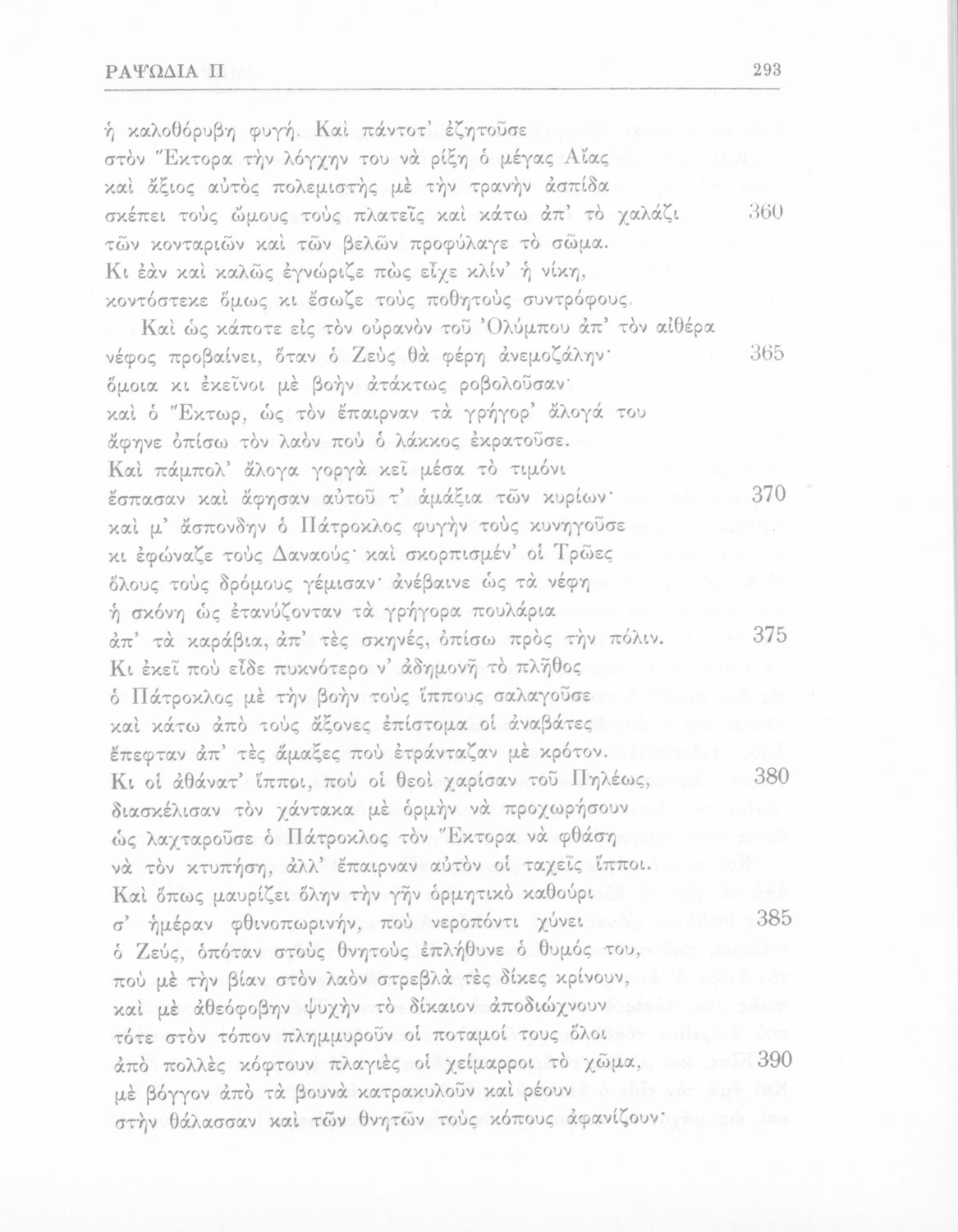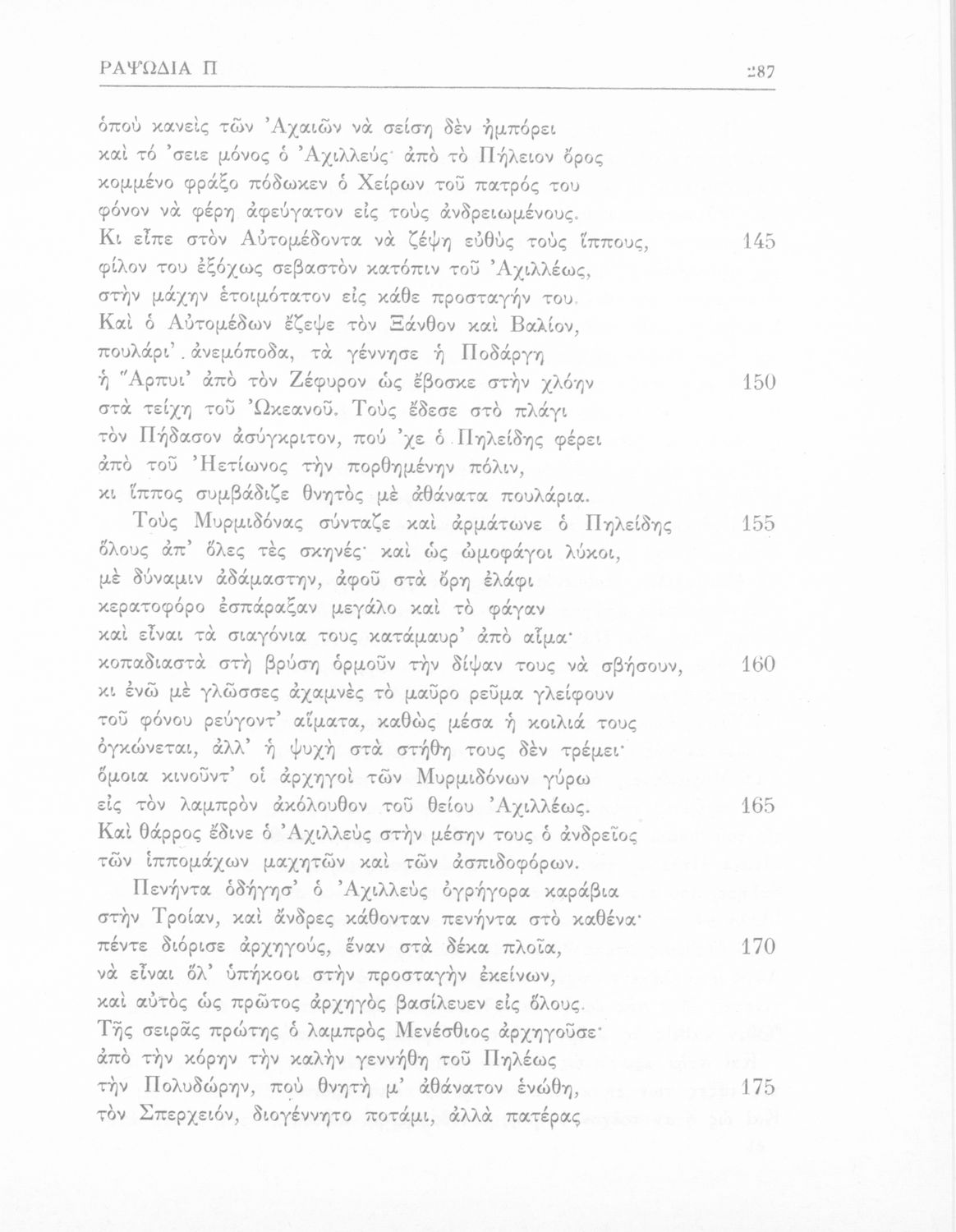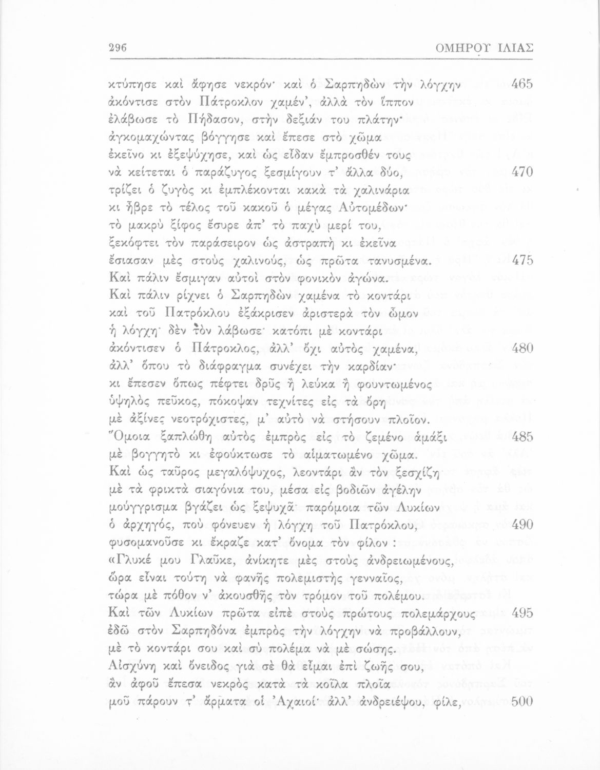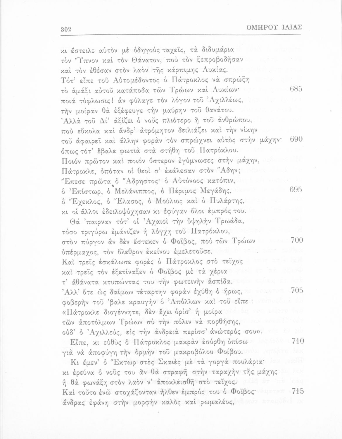 Μαθητικό βοήθημα του Ελληνικού Σχολείου, των Παρθεναγωγείων και του Γυμνασίου για το μάθημα των Αρχαίων Ελληνικών. Περιέχει τις ραψωδίες Ο, Π, Ρ, Σ, Τ, Χ, ψ, Ω από το πρωτότυπο με σχόλια και ερμηνευτικές ...