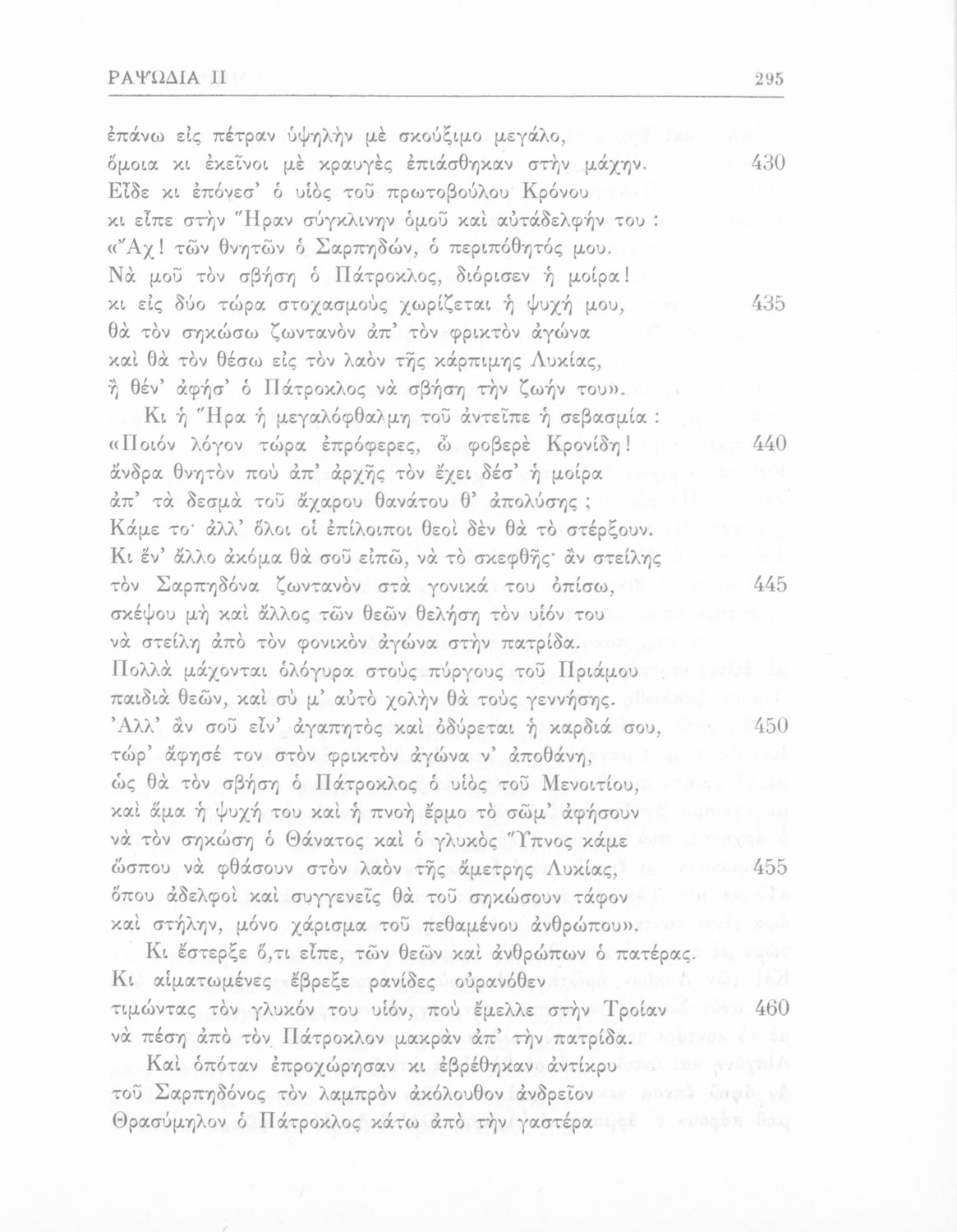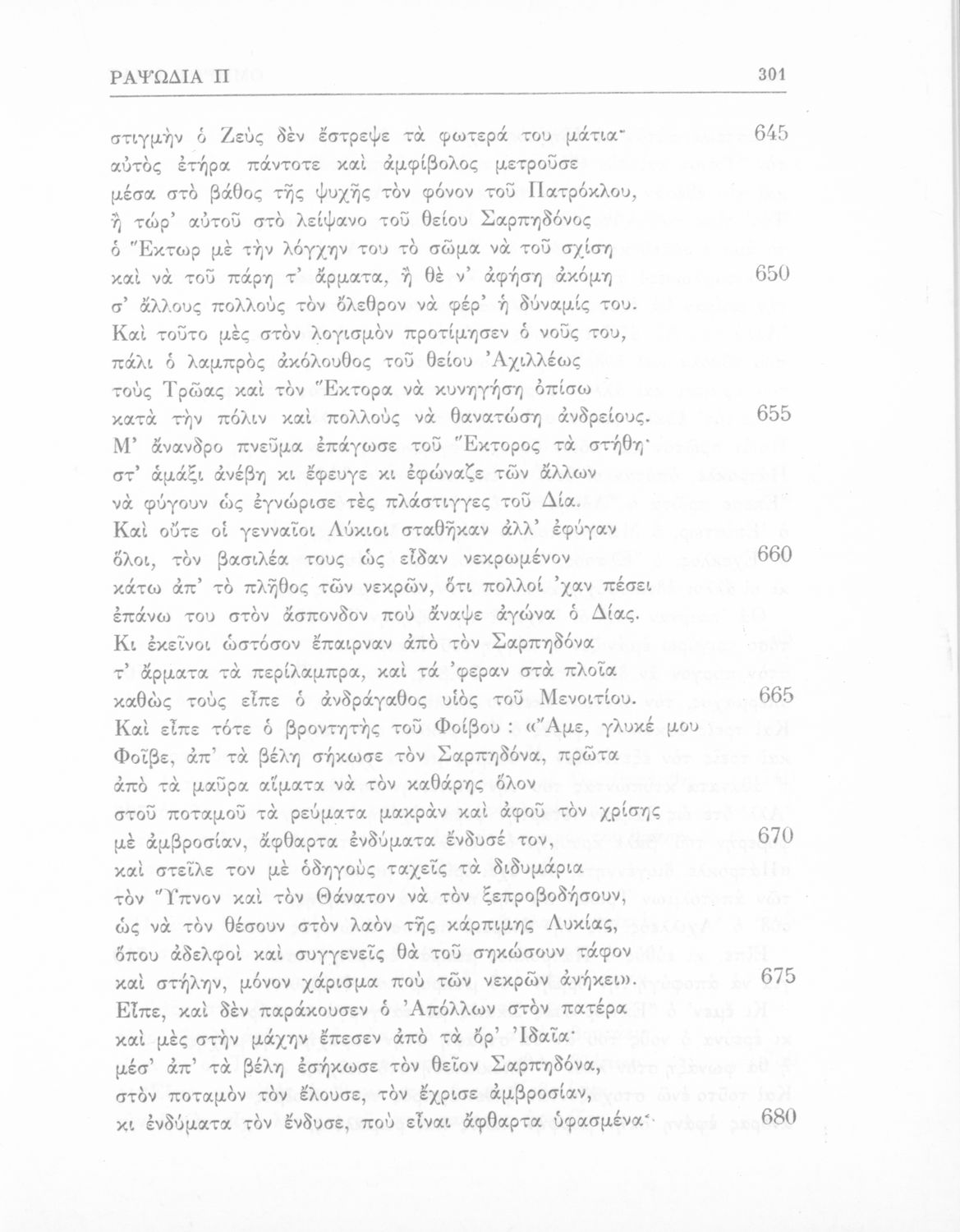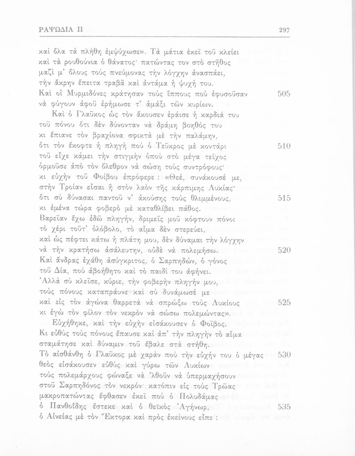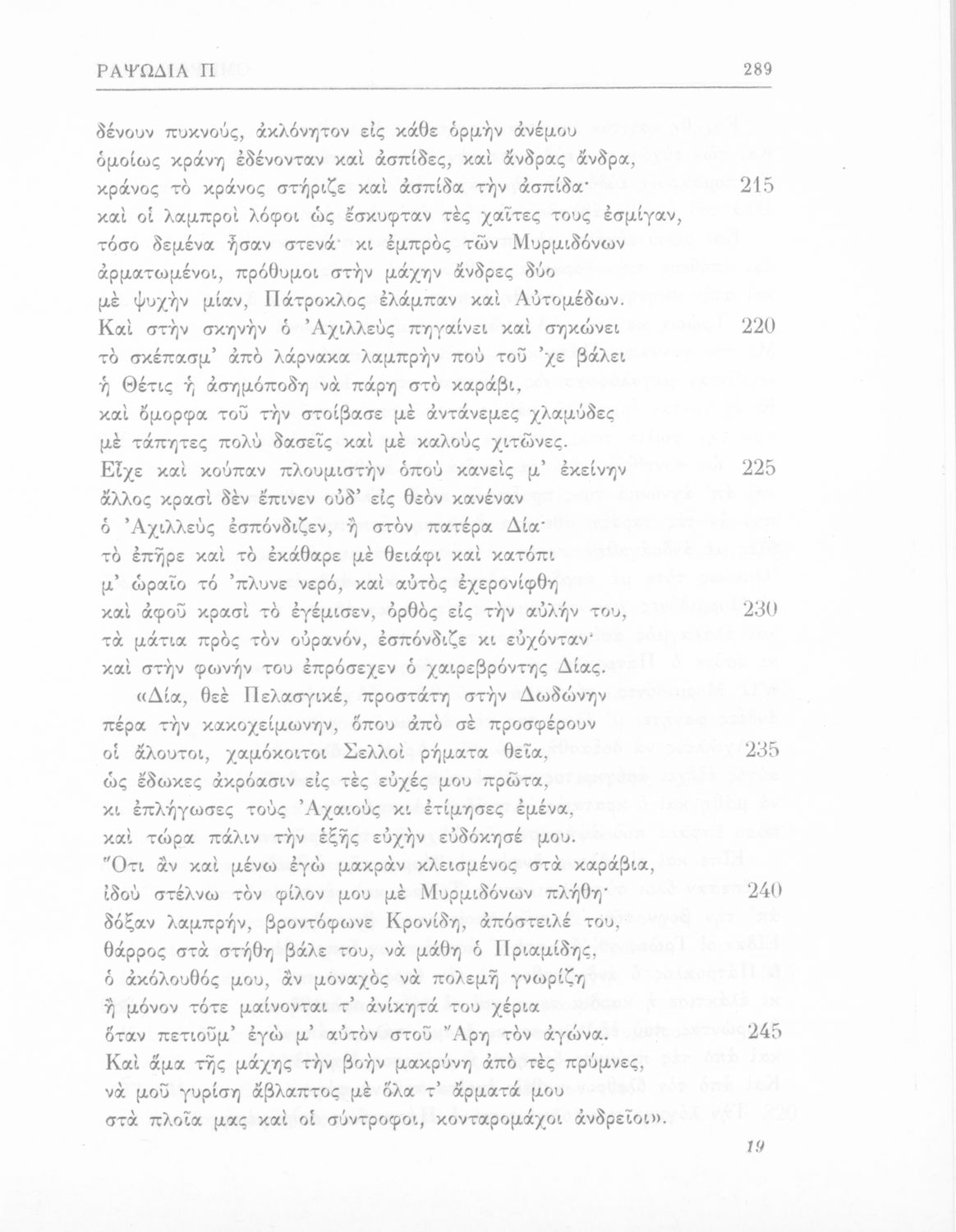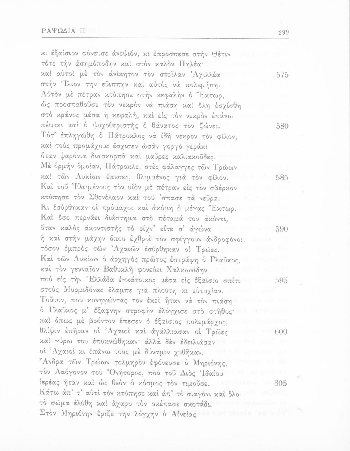 Μαθητικό βοήθημα του Ελληνικού Σχολείου, των Παρθεναγωγείων και του Γυμνασίου για το μάθημα των Αρχαίων Ελληνικών. Περιέχει τις ραψωδίες Ο, Π, Ρ, Σ, Τ, Χ, ψ, Ω από το πρωτότυπο με σχόλια και ερμηνευτικές ...