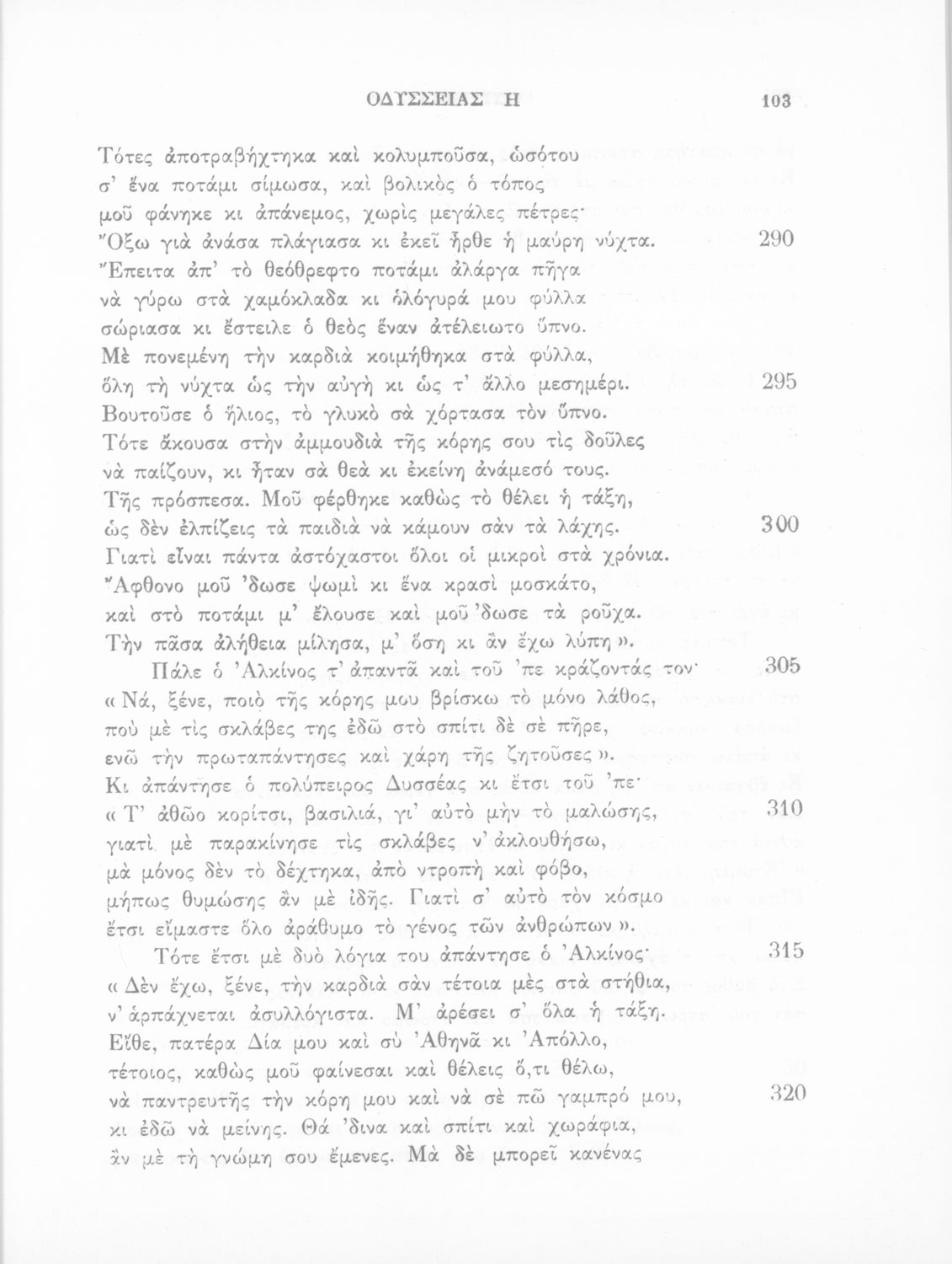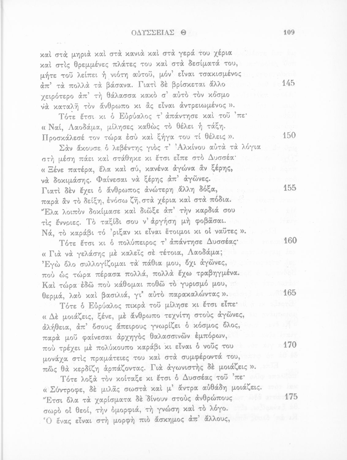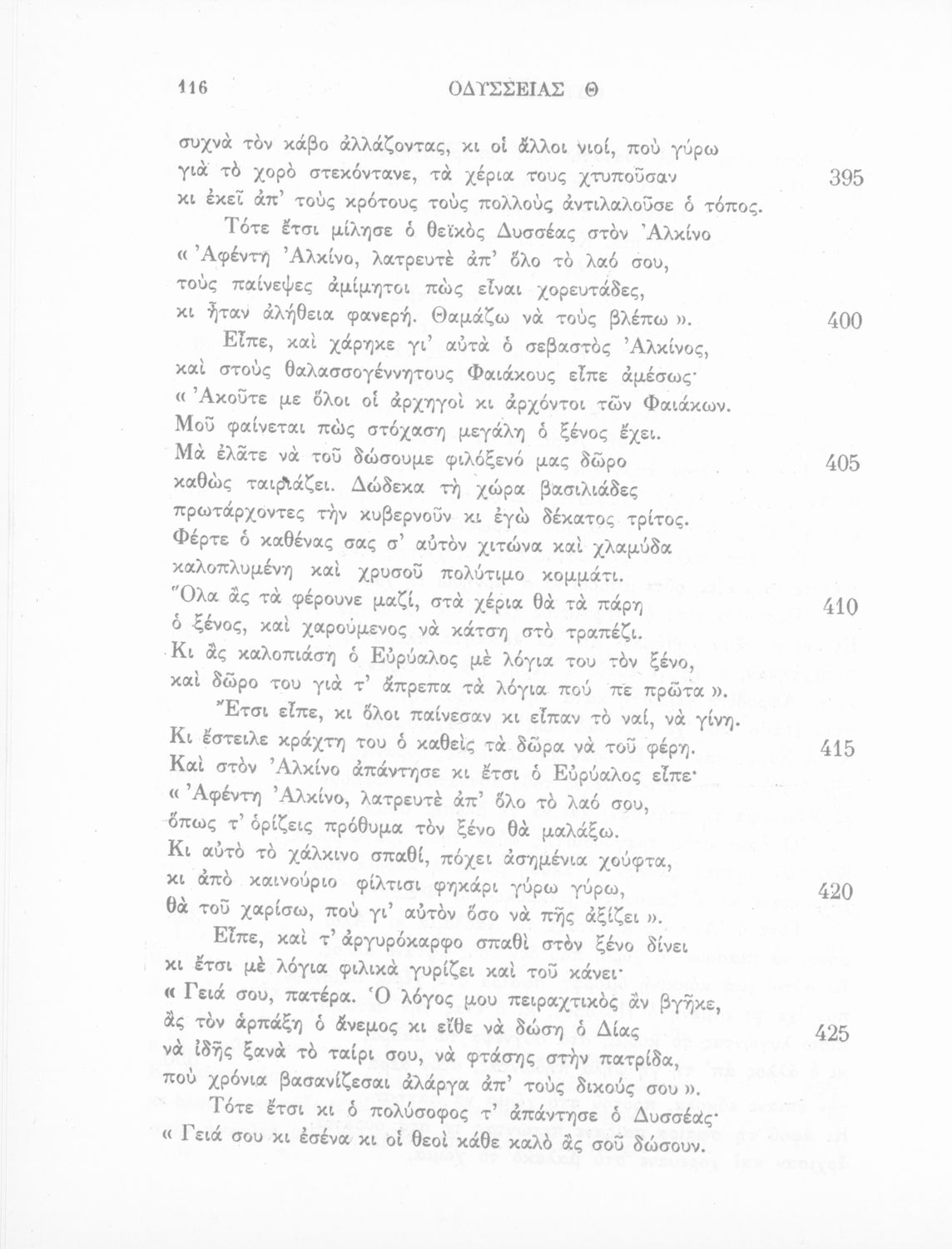 Σχολικό εγχειρίδιο του Γυμνασίου για το μάθημα των Αρχαίων Ελληνικών. Πρόκειται για το κείμενο της Οδύσσειας μεταφρασμένο στο τέλος περιλαμβάνει λεξιλόγιο.