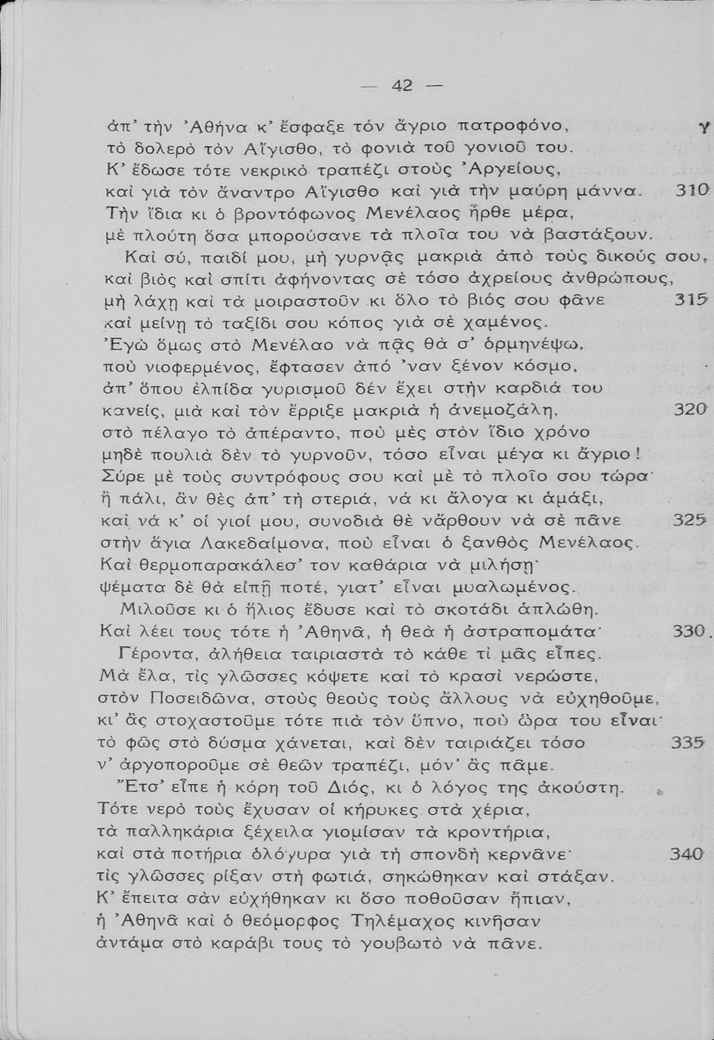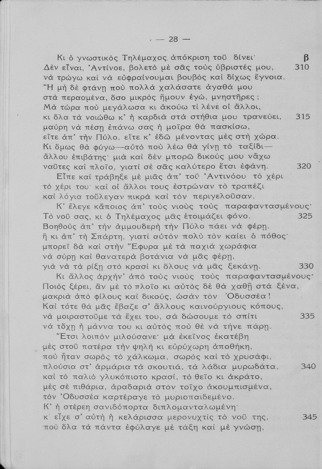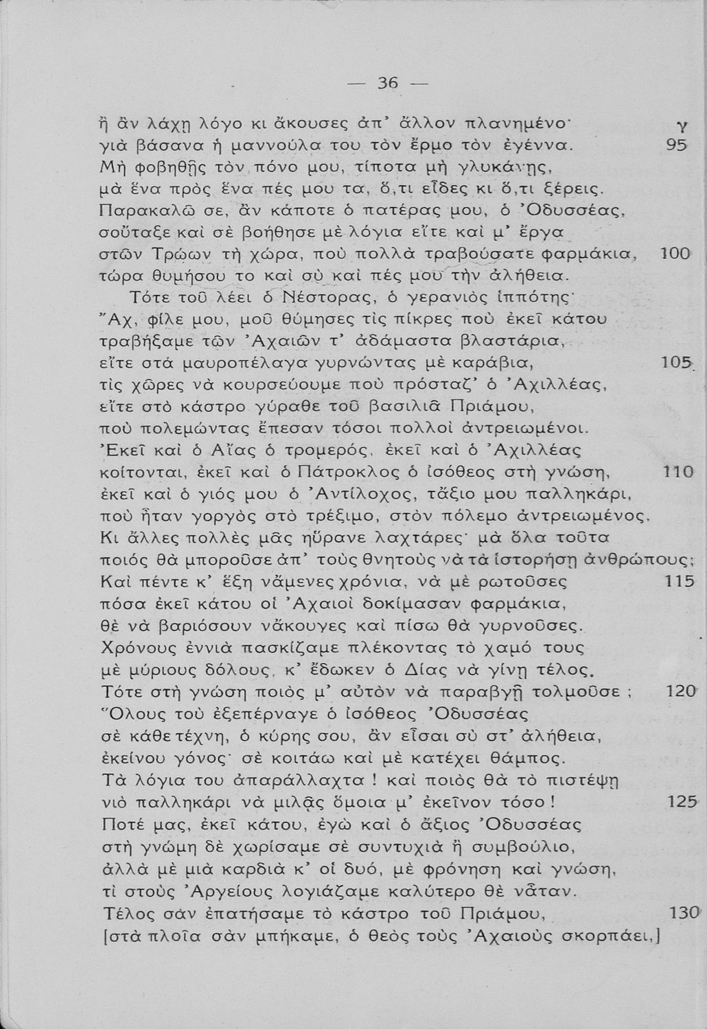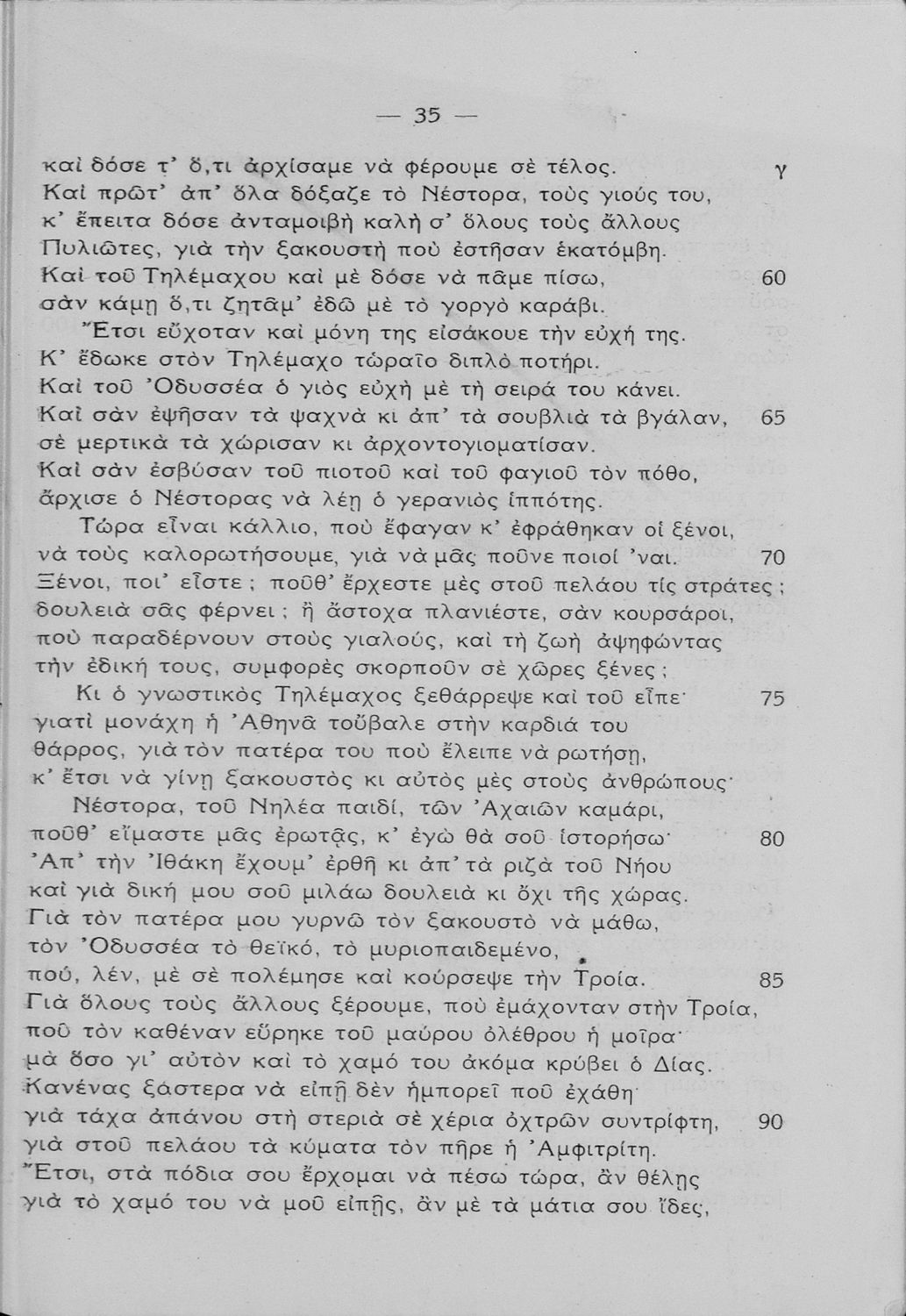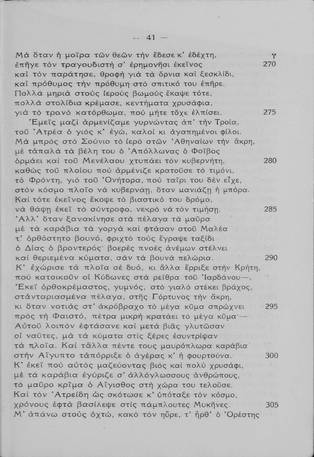 Σχολικό εγχειρίδιο του Γυμνασίου για το μάθημα των Αρχαίων Ελληνικών. Περιέχει τις ραψωδίες της Οδύσσειας και ερμηνευτικά, πραγματολογικά σχόλια, καθώς κ και γραμματικές παρατηρήσεις του συγγραφέα. Εγκρίθηκε για μια πενταετία 1932-1937.