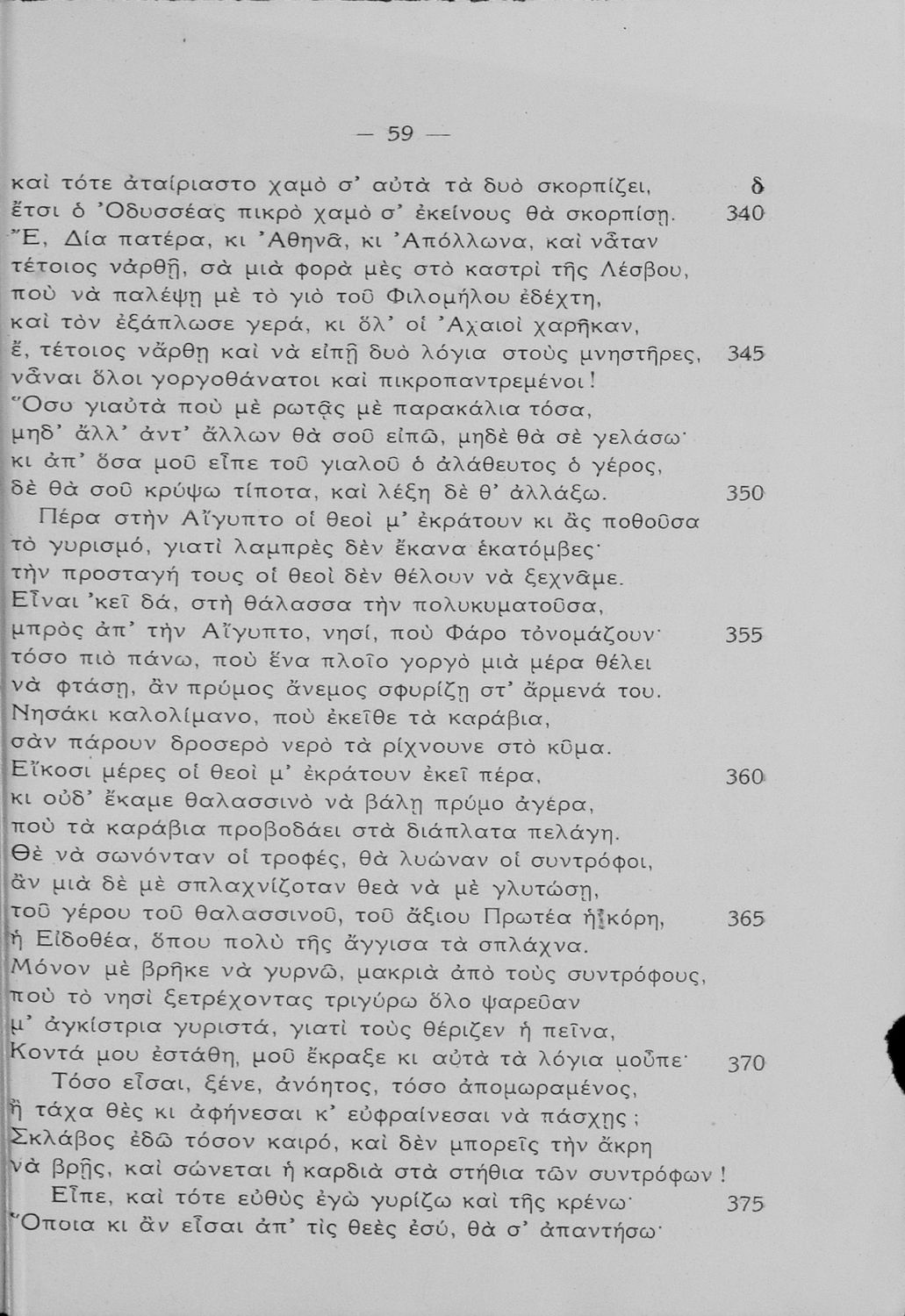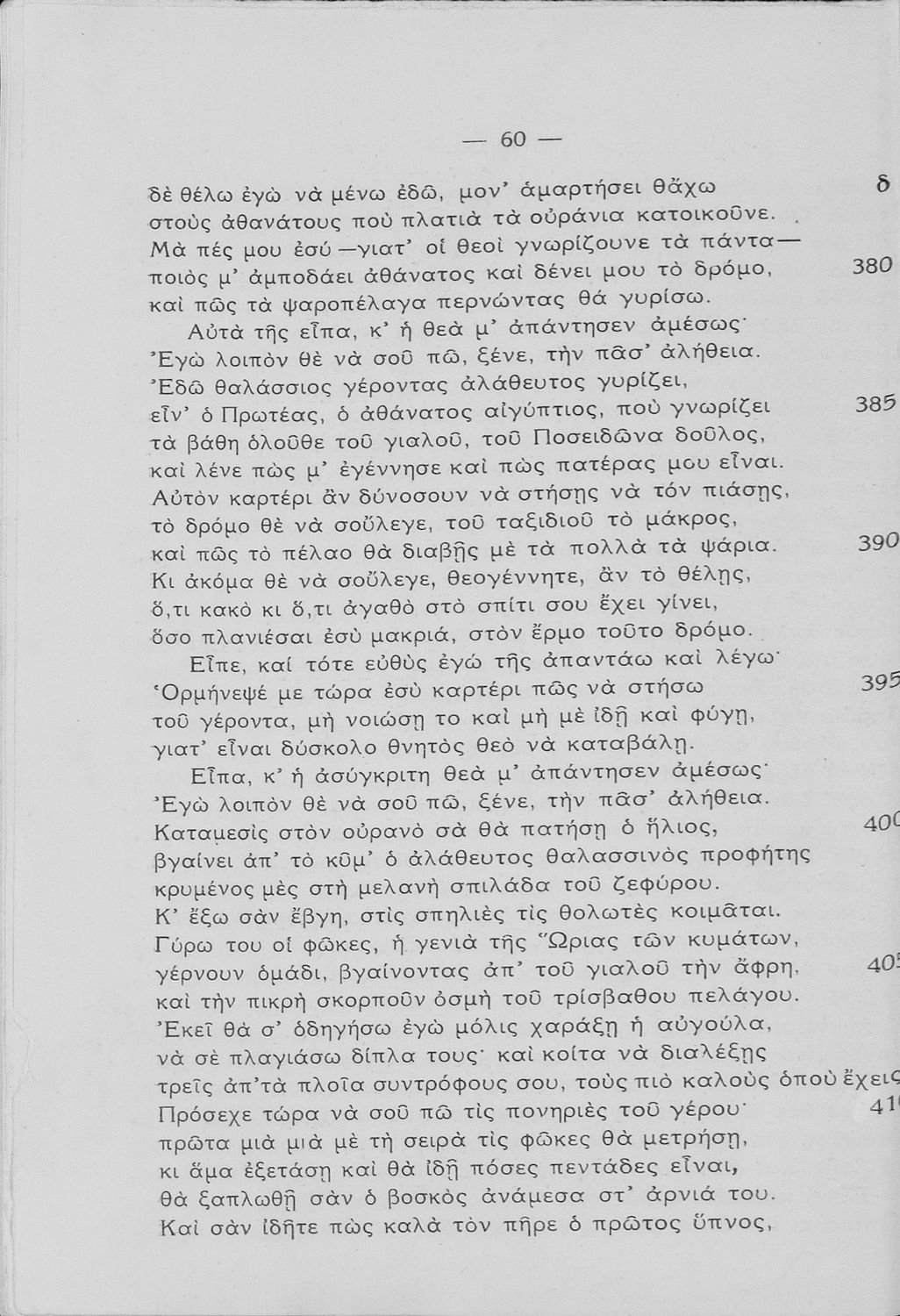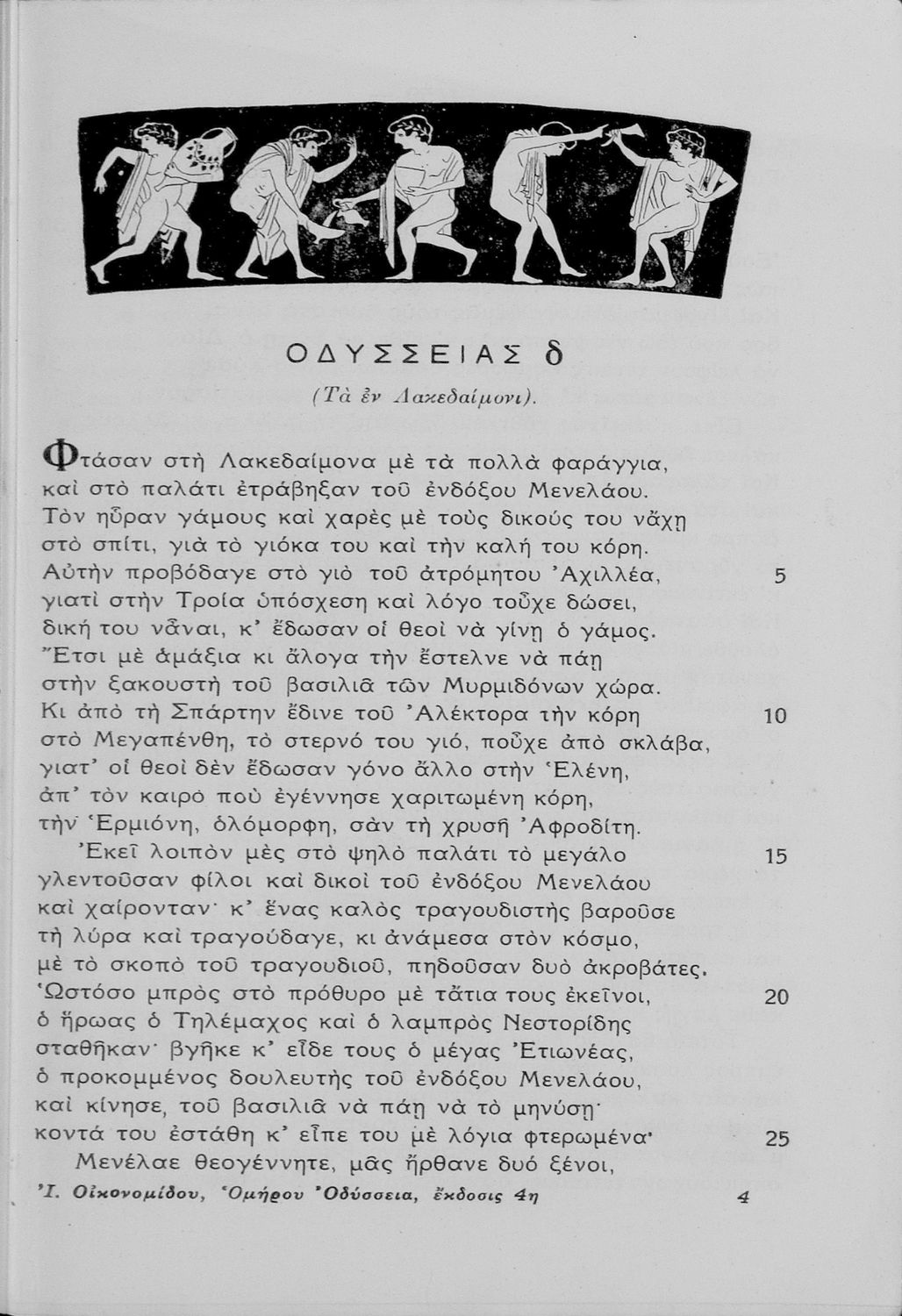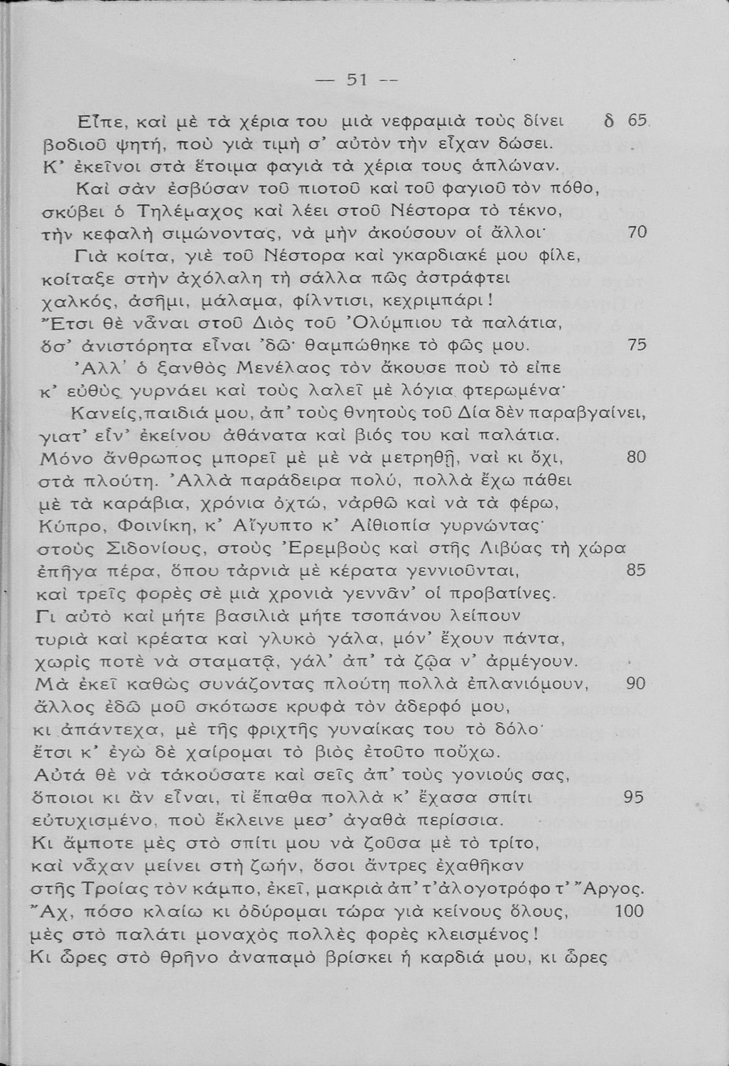 Σχολικό εγχειρίδιο του Γυμνασίου για το μάθημα των Αρχαίων Ελληνικών. Περιέχει τις ραψωδίες της Οδύσσειας και ερμηνευτικά, πραγματολογικά σχόλια, καθώς κ και γραμματικές παρατηρήσεις του συγγραφέα. Εγκρίθηκε για μια πενταετία 1932-1937.