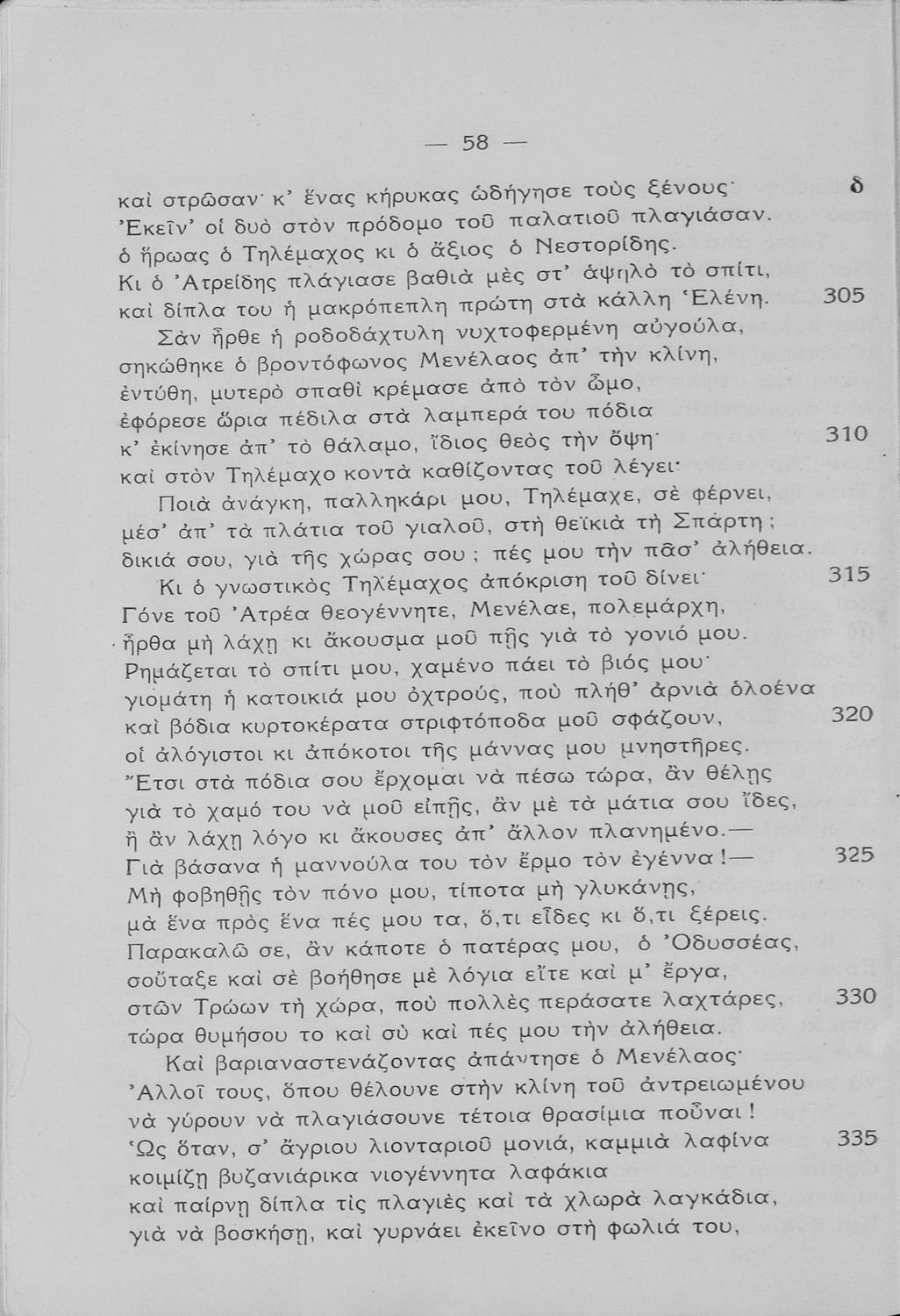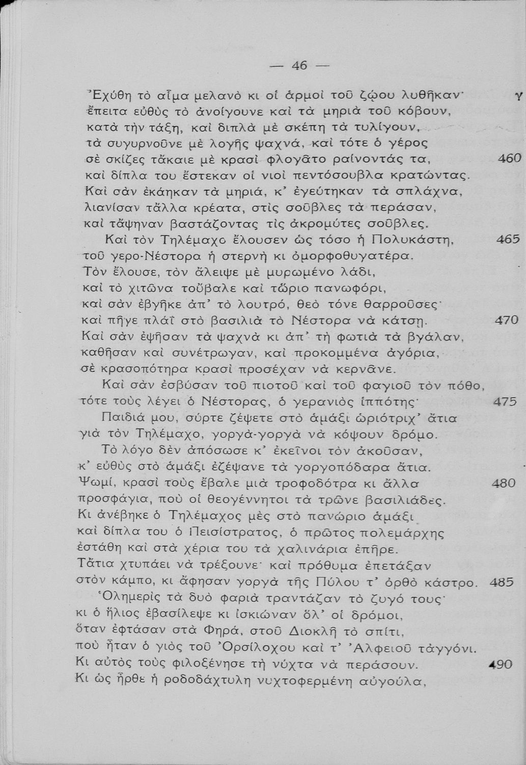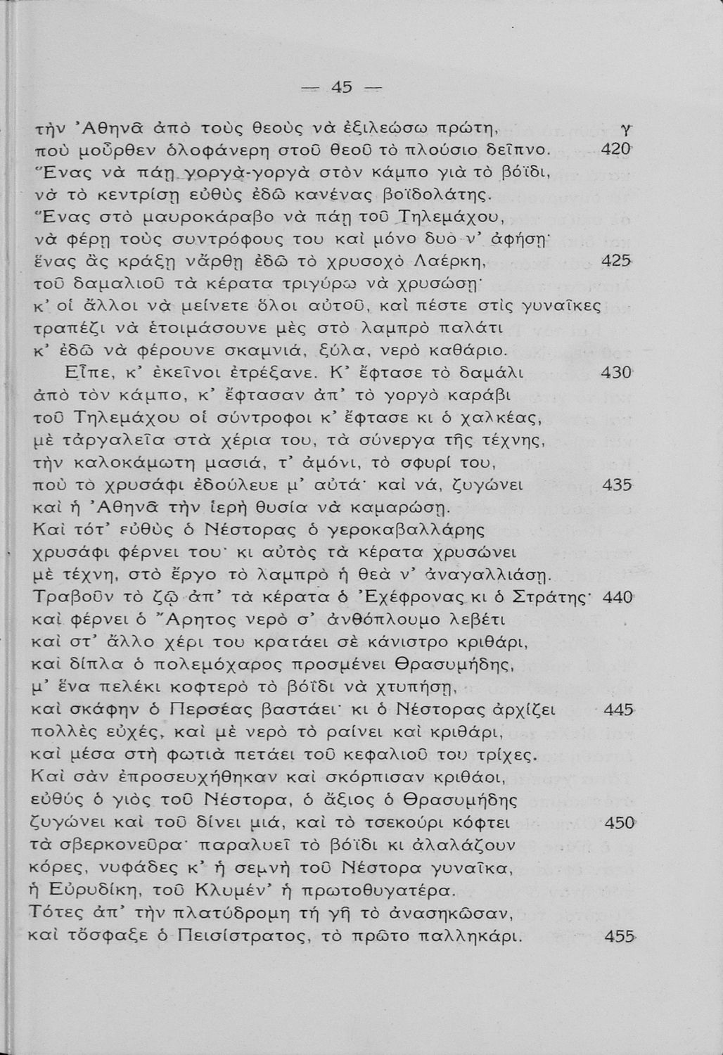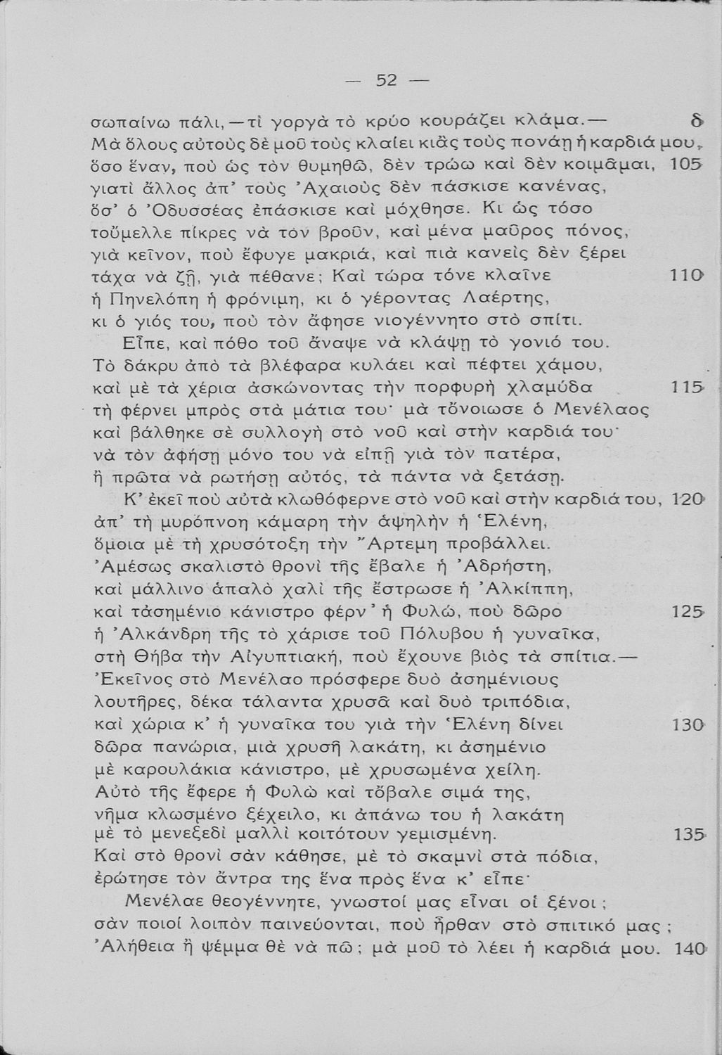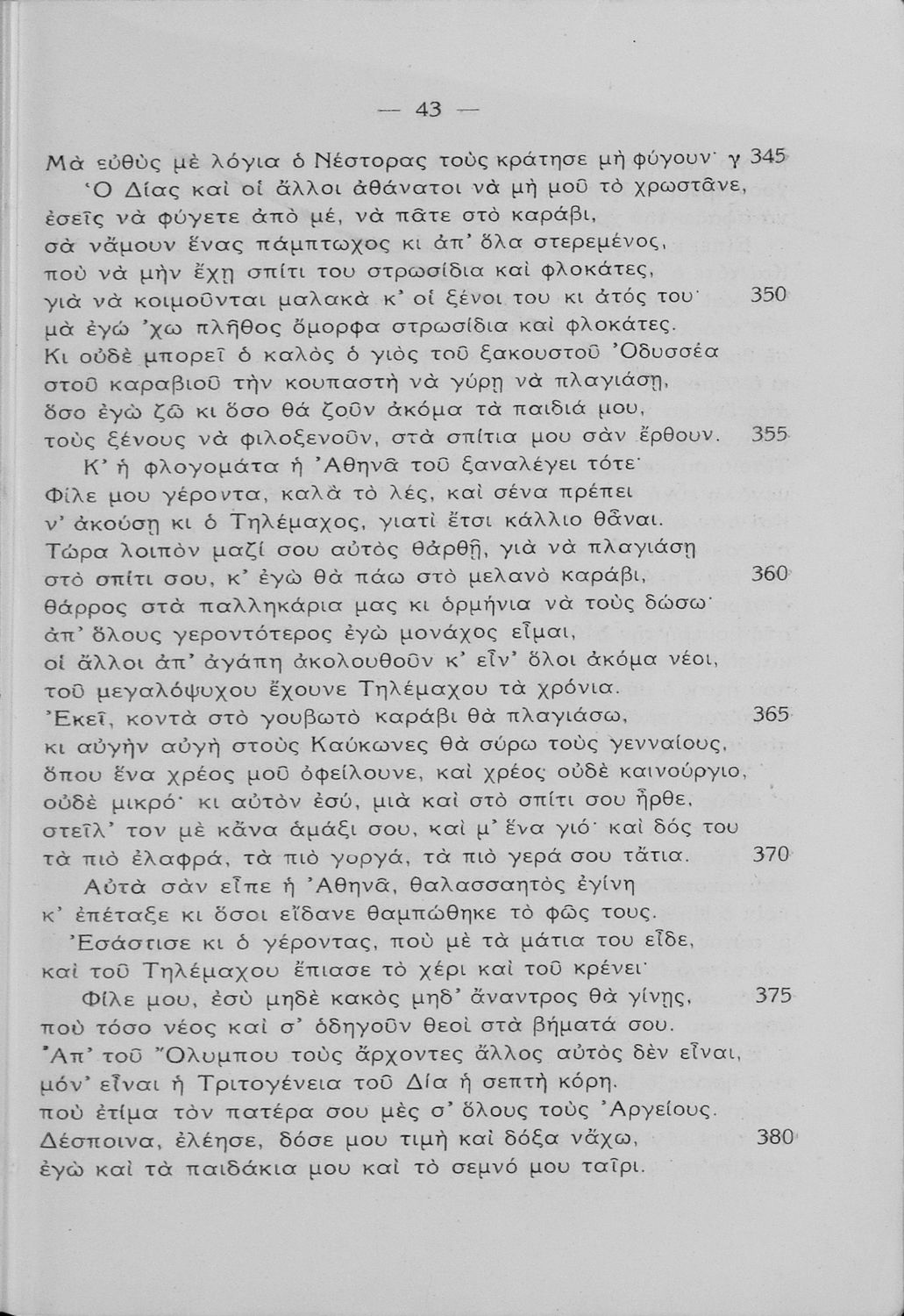 Σχολικό εγχειρίδιο του Γυμνασίου για το μάθημα των Αρχαίων Ελληνικών. Περιέχει τις ραψωδίες της Οδύσσειας και ερμηνευτικά, πραγματολογικά σχόλια, καθώς κ και γραμματικές παρατηρήσεις του συγγραφέα. Εγκρίθηκε για μια πενταετία 1932-1937.