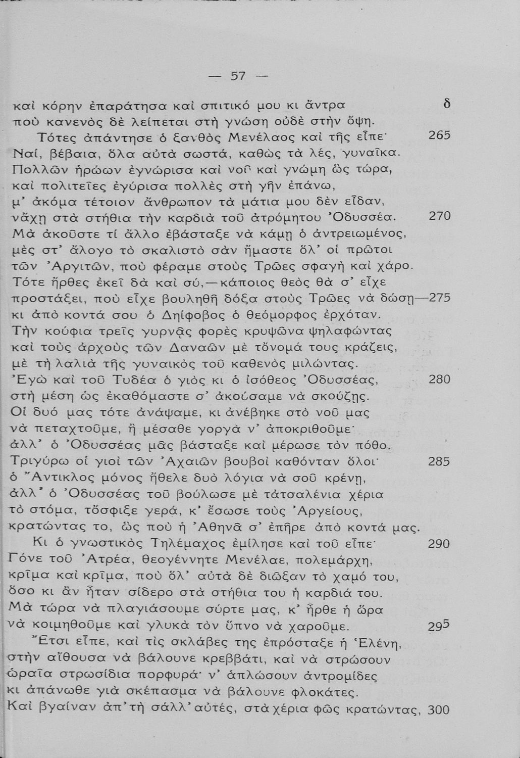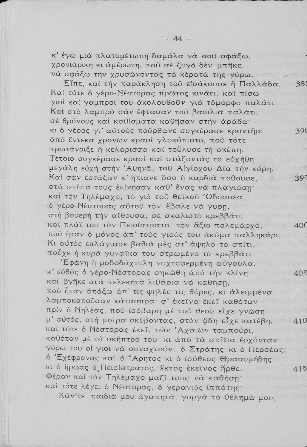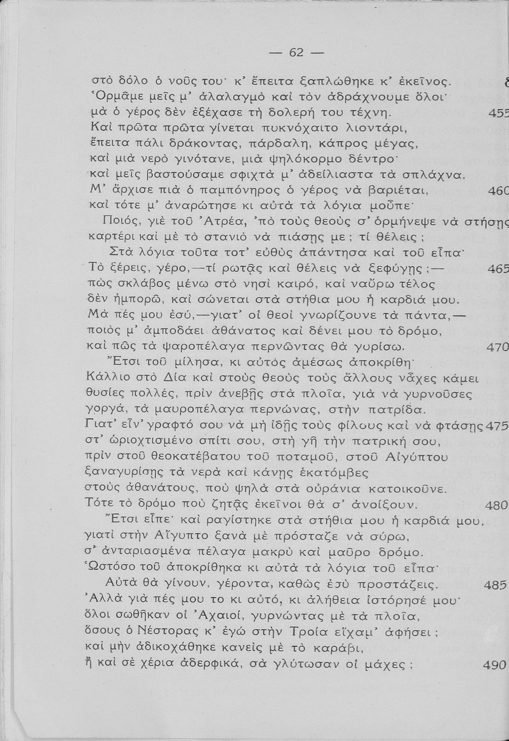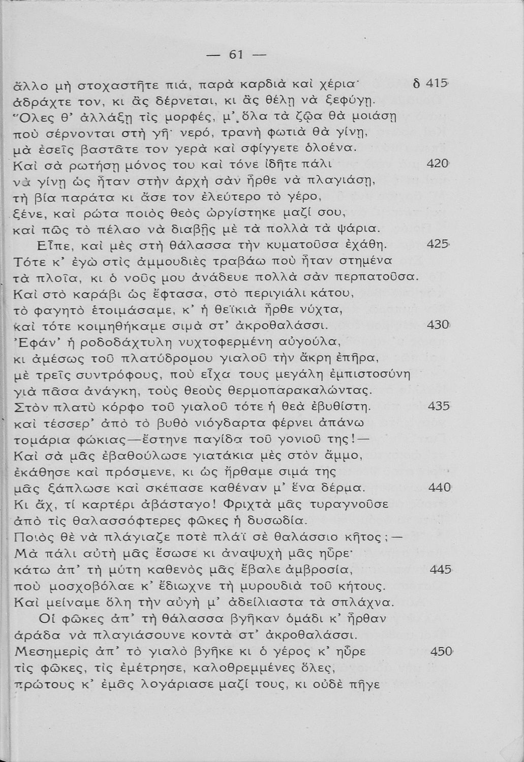 Σχολικό εγχειρίδιο του Γυμνασίου για το μάθημα των Αρχαίων Ελληνικών. Περιέχει τις ραψωδίες της Οδύσσειας και ερμηνευτικά, πραγματολογικά σχόλια, καθώς κ και γραμματικές παρατηρήσεις του συγγραφέα. Εγκρίθηκε για μια πενταετία 1932-1937.